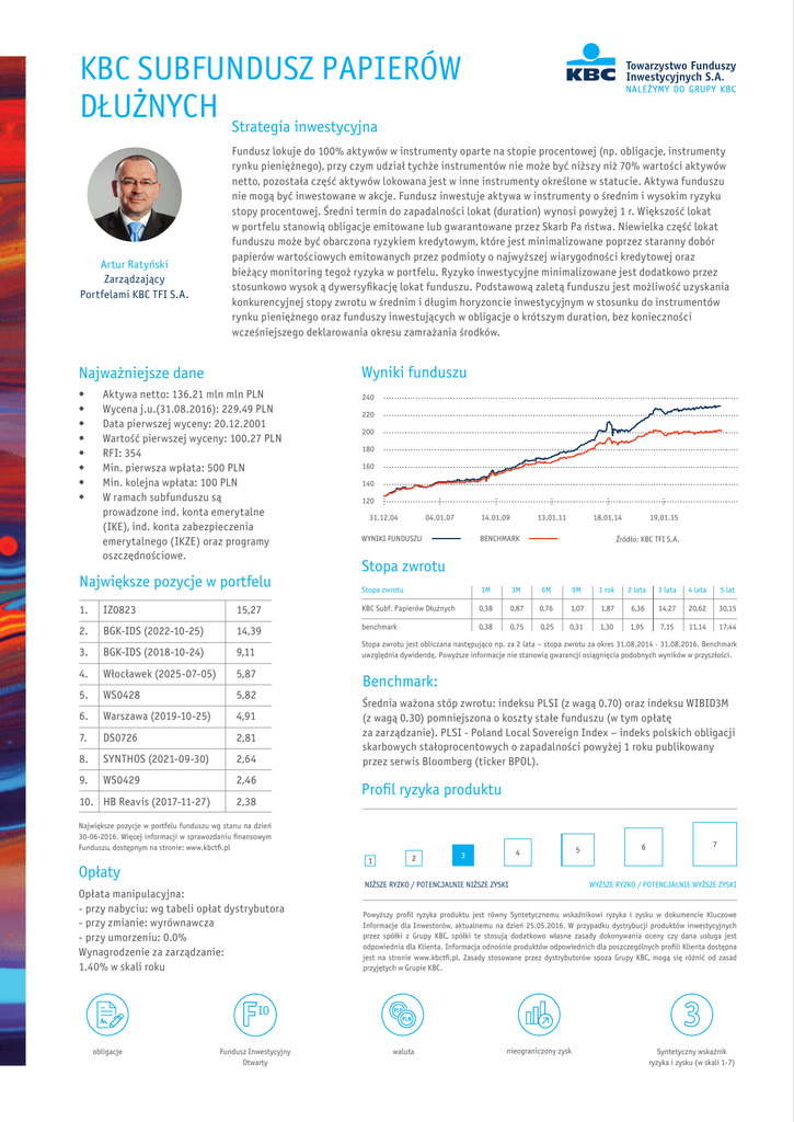 KBC SUBFUNDUSZ PAPIERÓW DŁUŻNYCH Strategia inwestycyjna Fundusz lokuje do 100% aktywów w instrumenty oparte na stopie procentowej (np. obligacje, instrumenty rynku pieniężnego), przy czym udział tychże instrumentów nie może być niższy niż 70% wartości aktywów netto, pozostała część aktywów lokowana jest w inne instrumenty określone w statucie. Aktywa funduszu nie mogą być inwestowane w akcje. Fundusz inwestuje aktywa w instrumenty o średnim i wysokim ryzyku stopy procentowej. Średni termin do zapadalności lokat (duration) wynosi powyżej 1 r. Większość lokat w portfelu stanowią obligacje emitowane lub gwarantowane przez Skarb Pa ństwa. Niewielka część lokat funduszu może być obarczona ryzykiem kredytowym, które jest minimalizowane poprzez staranny dobór papierów wartościowych emitowanych przez podmioty o najwyższej wiarygodności kredytowej oraz bieżący monitoring tegoż ryzyka w portfelu. Ryzyko inwestycyjne minimalizowane jest dodatkowo przez stosunkowo wysok ą dywersyfikację lokat funduszu. Podstawową zaletą funduszu jest możliwość uzyskania konkurencyjnej stopy zwrotu w średnim i długim horyzoncie inwestycyjnym w stosunku do instrumentów rynku pieniężnego oraz funduszy inwestujących w obligacje o krótszym duration, bez konieczności wcześniejszego deklarowania okresu zamrażania środków. Artur Ratyński Zarządzający Portfelami KBC TFI S.A. Wyniki funduszu Najważniejsze dane • • • • • • • • Aktywa netto: 136.21 mln mln PLN Wycena j.u.(31.08.2016): 229.49 PLN Data pierwszej wyceny: 20.12.2001 Wartość pierwszej wyceny: 100.27 PLN RFI: 354 Min. pierwsza wpłata: 500 PLN Min. kolejna wpłata: 100 PLN W ramach subfunduszu są prowadzone ind. konta emerytalne (IKE), ind. konta zabezpieczenia emerytalnego (IKZE) oraz programy oszczędnościowe. Największe pozycje w portfelu 240 220 200 180 160 140 120 31.12.04 04.01.07 WYNIKI FUNDUSZU 14.01.09 13.01.11 18.01.14 BENCHMARK 19.01.15 Źródło: KBC TFI S.A. Stopa zwrotu zwrotu Stopa 1M 3M 6M 9M 1 rok 2 lata 3 lata 4 lata 5 lat 0,38 0,87 0,76 1,07 1,87 6,36 14,27 20,62 30,15 0,38 0,75 0,25 0,31 1,30 1,95 7,15 11,14 17,44 1. IZ0823 15,27 KBC Subf. Papierów Dłużnych 2. BGK-IDS (2022-10-25) 14,39 benchmark Stopa zwrotu jest obliczana następująco np. za 2 lata – stopa zwrotu za okres 31.08.2014 - 31.08.2016. Benchmark uwzględnia dywidendę. Powyższe informacje nie stanowią gwarancji osiągnięcia podobnych wyników w przyszłości. 3. BGK-IDS (2018-10-24) 9,11 4. Włocławek (2025-07-05) 5,87 5. WS0428 5,82 6. Warszawa (2019-10-25) 4,91 7. DS0726 2,81 8. SYNTHOS (2021-09-30) 2,64 9. WS0429 2,46 10. HB Reavis (2017-11-27) Benchmark: Średnia ważona stóp zwrotu: indeksu PLSI (z wagą 0.70) oraz indeksu WIBID3M (z wagą 0.30) pomniejszona o koszty stałe funduszu (w tym opłatę za zarządzanie). PLSI - Poland Local Sovereign Index – indeks polskich obligacji skarbowych stałoprocentowych o zapadalności powyżej 1 roku publikowany przez serwis Bloomberg (ticker BPOL). Profil ryzyka produktu 2,38 Największe pozycje w portfelu funduszu wg stanu na dzień 30-06-2016. Więcej informacji w sprawozdaniu finansowym Funduszu, dostępnym na stronie: www.kbctfi.pl Opłaty Opłata manipulacyjna: - przy nabyciu: wg tabeli opłat dystrybutora - przy zmianie: wyrównawcza - przy umorzeniu: 0.0% Wynagrodzenie za zarządzanie: 1.40% w skali roku NIŻSZE RYZKO / POTENCJALNIE NIŻSZE ZYSKI WYŻSZE RYZKO / POTENCJALNIE WYŻSZE ZYSKI Powyższy profil ryzyka produktu jest równy Syntetycznemu wskaźnikowi ryzyka i zysku w dokumencie Kluczowe Informacje dla Inwestorów, aktualnemu na dzień 25.05.2016. W przypadku dystrybucji produktów inwestycyjnych przez spółki z Grupy KBC, spółki te stosują dodatkowo własne zasady dokonywania oceny czy dana usługa jest odpowiednia dla Klienta. Informacja odnośnie produktów odpowiednich dla poszczególnych profili Klienta dostępna jest na stronie www.kbctfi.pl. Zasady stosowane przez dystrybutorów spoza Grupy KBC, mogą się różnić od zasad przyjętych w Grupie KBC. IO obligacje Fundusz Inwestycyjny Otwarty waluta nieograniczony zysk Syntetyczny wskaźnik ryzyka i zysku (w skali 1-7) KBC SUBFUNDUSZ PAPIERÓW DŁUŻNYCH Struktura portfela funduszu OBLIGACJE SKARBOWE I GWARANTOWANE PRZEZ SP – 55,83% OBLIGACJE KORPORACYJNE – 23,49% OBLIGACJE KOMUNALNE – 19,35% AKTYWA W WALUTACH – 1,23% DEPOZYTY – 0,10% Struktura walutowa PLN – 96,5% EUR – 3,5% Struktura geograficzna POLSKA – 98,8% UNIA EUROPEJSKA – 1,2% ŹRÓDŁO: OBLICZENIA WŁASNE KBC TFI S.A., DANE NA 31.08.2016 R. KBC Towarzystwo Funduszy Inwestycyjnych S.A. Informacje Podstawowe: Siedziba: ul. Chmielna 85/87, 00-805 Warszawa Kontakt: [email protected]; infolinia: (22) 582 88 58 Aktywa w zarządzaniu: 4,4 mld PLN (stan na 31.12.2015) Akcjonariusz: 100% KBC Asset Management Data powstania: 20.04.2005 r.; połączenie WARTA TFI S.A., WARTA AM S.A., TFI KB S.A., KB ZA S.A. Zezwolenie Komisji Nadzoru Finansowego z dn. 14.05.2002, decyzja nr DFN1 - 4030–23-1/02-1452 Gdzie kupić fundusze KBC TFI? informacja na www.kbctfi.pl WAŻNE INFORMACJE Subfundusz nie gwarantuje osiągnięcia celu inwestycyjnego ani uzyskania określonego wyniku inwestycyjnego. Uczestnik subfunduszu musi liczyć się z możliwością utraty przynajmniej części wpłaconych środków. Subfundusz może lokować powyżej 35% wartości swoich aktywów w papiery wartościowe emitowane, gwarantowane lub poręczone przez Skarb Państwa lub Narodowy Bank Polski. Wyniki historyczne nie stanowią gwarancji osiągnięcia podobnych zysków w przyszłości. Niniejszy materiał został przygotowany przez KBC TFI S.A. w dobrej wierze i z należytą starannością, ma on charakter informacyjny i nie stanowi pełnej informacji o funduszach inwestycyjnych. Nie należy go traktować jako rekomendacji inwestowania w jakiekolwiek instrumenty finansowe. Indywidualna stopa zwrotu z inwestycji jest uzależniona od