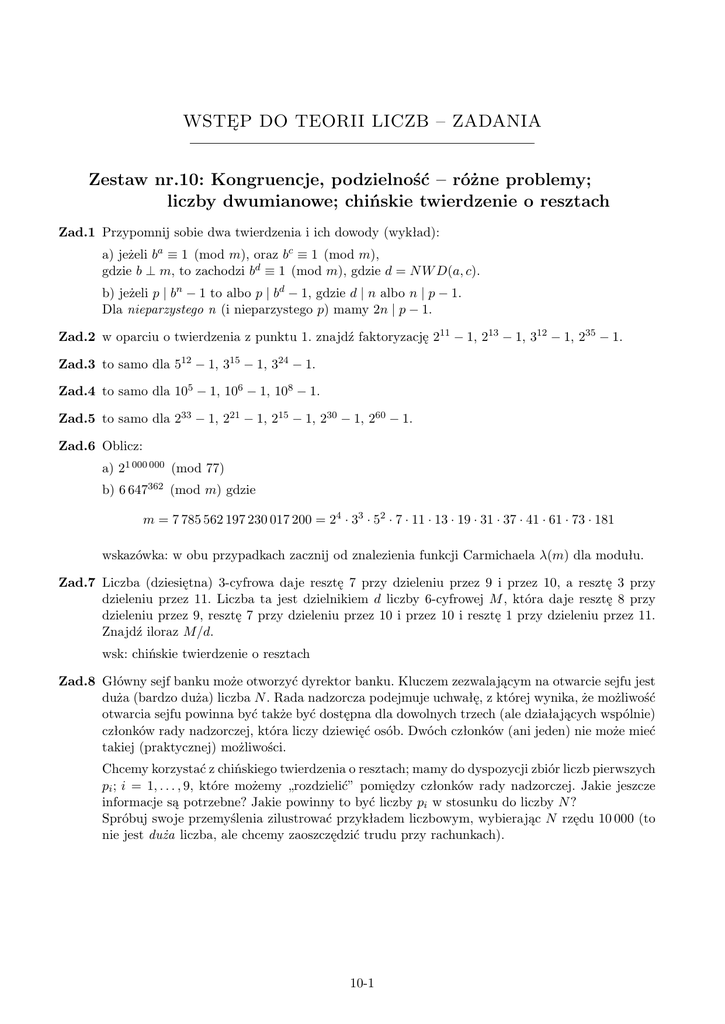WSTĘP DO TEORII LICZB – ZADANIA Zestaw nr.10: Kongruencje, podzielność – różne problemy; liczby dwumianowe; chińskie twierdzenie o resztach Zad.1 Przypomnij sobie dwa twierdzenia i ich dowody (wykład): a) jeżeli ba ≡ 1 (mod m), oraz bc ≡ 1 (mod m), gdzie b ⊥ m, to zachodzi bd ≡ 1 (mod m), gdzie d = N W D(a, c). b) jeżeli p | bn − 1 to albo p | bd − 1, gdzie d | n albo n | p − 1. Dla nieparzystego n (i nieparzystego p) mamy 2n | p − 1. Zad.2 w oparciu o twierdzenia z punktu 1. znajdź faktoryzację 211 − 1, 213 − 1, 312 − 1, 235 − 1. Zad.3 to samo dla 512 − 1, 315 − 1, 324 − 1. Zad.4 to samo dla 105 − 1, 106 − 1, 108 − 1. Zad.5 to samo dla 233 − 1, 221 − 1, 215 − 1, 230 − 1, 260 − 1. Zad.6 Oblicz: a) 21 000 000 (mod 77) b) 6 647362 (mod m) gdzie m = 7 785 562 197 230 017 200 = 24 · 33 · 52 · 7 · 11 · 13 · 19 · 31 · 37 · 41 · 61 · 73 · 181 wskazówka: w obu przypadkach zacznij od znalezienia funkcji Carmichaela λ(m) dla modułu. Zad.7 Liczba (dziesiętna) 3-cyfrowa daje resztę 7 przy dzieleniu przez 9 i przez 10, a resztę 3 przy dzieleniu przez 11. Liczba ta jest dzielnikiem d liczby 6-cyfrowej M , która daje resztę 8 przy dzieleniu przez 9, resztę 7 przy dzieleniu przez 10 i przez 10 i resztę 1 przy dzieleniu przez 11. Znajdź iloraz M/d. wsk: chińskie twierdzenie o resztach Zad.8 Główny sejf banku może otworzyć dyrektor banku. Kluczem zezwalającym na otwarcie sejfu jest duża (bardzo duża) liczba N . Rada nadzorcza podejmuje uchwałę, z której wynika, że możliwość otwarcia sejfu powinna być także być dostępna dla dowolnych trzech (ale działających wspólnie) członków rady nadzorczej, która liczy dziewięć osób. Dwóch członków (ani jeden) nie może mieć takiej (praktycznej) możliwości. Chcemy korzystać z chińskiego twierdzenia o resztach; mamy do dyspozycji zbiór liczb pierwszych pi ; i = 1, . . . , 9, które możemy „rozdzielić” pomiędzy członków rady nadzorczej. Jakie jeszcze informacje są potrzebne? Jakie powinny to być liczby pi w stosunku do liczby N ? Spróbuj swoje przemyślenia zilustrować przykładem liczbowym, wybierając N rzędu 10 000 (to nie jest duża liczba, ale chcemy zaoszczędzić trudu przy rachunkach). 10-1