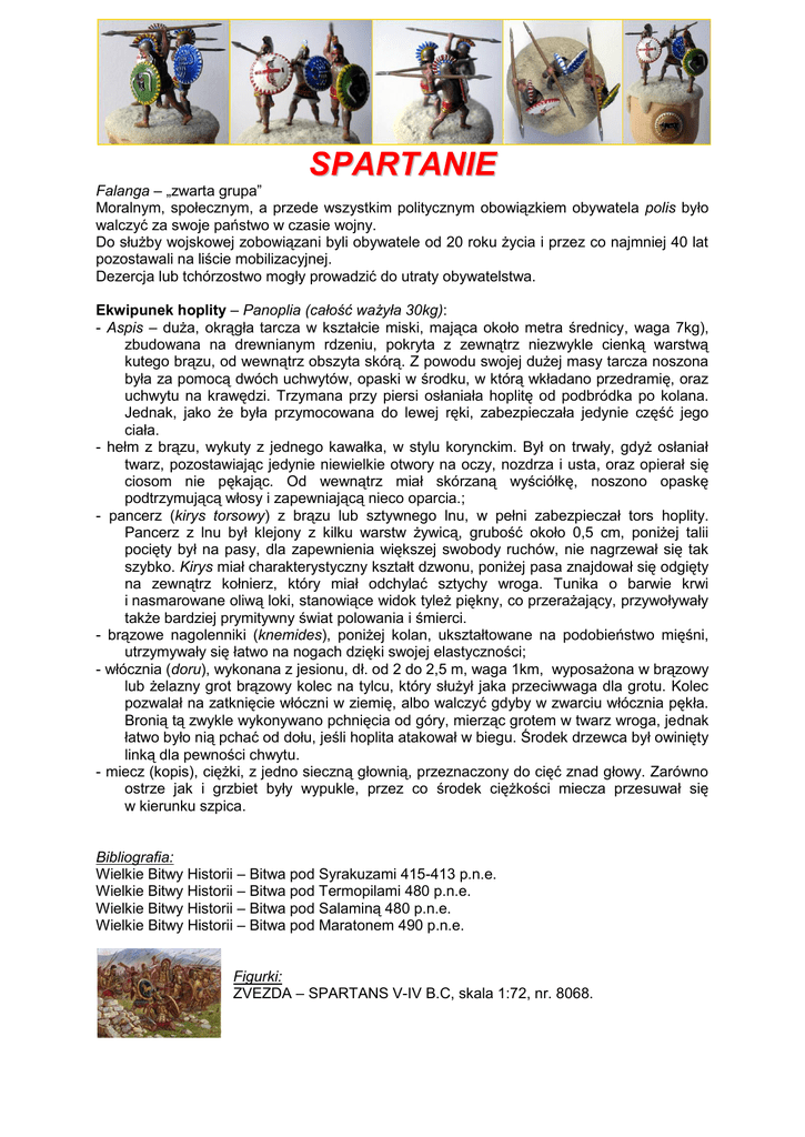 SPARTANIE Falanga – „zwarta grupa” Moralnym, społecznym, a przede wszystkim politycznym obowiązkiem obywatela polis było walczyć za swoje państwo w czasie wojny. Do służby wojskowej zobowiązani byli obywatele od 20 roku życia i przez co najmniej 40 lat pozostawali na liście mobilizacyjnej. Dezercja lub tchórzostwo mogły prowadzić do utraty obywatelstwa. Ekwipunek hoplity – Panoplia (całość ważyła 30kg): - Aspis – duża, okrągła tarcza w kształcie miski, mająca około metra średnicy, waga 7kg), zbudowana na drewnianym rdzeniu, pokryta z zewnątrz niezwykle cienką warstwą kutego brązu, od wewnątrz obszyta skórą. Z powodu swojej dużej masy tarcza noszona była za pomocą dwóch uchwytów, opaski w środku, w którą wkładano przedramię, oraz uchwytu na krawędzi. Trzymana przy piersi osłaniała hoplitę od podbródka po kolana. Jednak, jako że była przymocowana do lewej ręki, zabezpieczała jedynie część jego ciała. - hełm z brązu, wykuty z jednego kawałka, w stylu korynckim. Był on trwały, gdyż osłaniał twarz, pozostawiając jedynie niewielkie otwory na oczy, nozdrza i usta, oraz opierał się ciosom nie pękając. Od wewnątrz miał skórzaną wyściółkę, noszono opaskę podtrzymującą włosy i zapewniającą nieco oparcia.; - pancerz (kirys torsowy) z brązu lub sztywnego lnu, w pełni zabezpieczał tors hoplity. Pancerz z lnu był klejony z kilku warstw żywicą, grubość około 0,5 cm, poniżej talii pocięty był na pasy, dla zapewnienia większej swobody ruchów, nie nagrzewał się tak szybko. Kirys miał charakterystyczny kształt dzwonu, poniżej pasa znajdował się odgięty na zewnątrz kołnierz, który miał odchylać sztychy wroga. Tunika o barwie krwi i nasmarowane oliwą loki, stanowiące widok tyleż piękny, co przerażający, przywoływały także bardziej prymitywny świat polowania i śmierci. - brązowe nagolenniki (knemides), poniżej kolan, ukształtowane na podobieństwo mięśni, utrzymywały się łatwo na nogach dzięki swojej elastyczności; - włócznia (doru), wykonana z jesionu, dł. od 2 do 2,5 m, waga 1km, wyposażona w brązowy lub żelazny grot brązowy kolec na tylcu, który służył jaka przeciwwaga dla grotu. Kolec pozwalał na zatknięcie włóczni w ziemię, albo walczyć gdyby w zwarciu włócznia pękła. Bronią tą zwykle wykonywano pchnięcia od góry, mierząc grotem w twarz wroga, jednak łatwo było nią pchać od dołu, jeśli hoplita atakował w biegu. Środek drzewca był owinięty linką dla pewności chwytu. - miecz (kopis), ciężki, z jedno sieczną głownią, przeznaczony do cięć znad głowy. Zarówno ostrze jak i grzbiet były wypukle, przez co środek ciężkości miecza przesuwał się w kierunku szpica. Bibliografia: Wielkie Bitwy Historii – Bitwa pod Syrakuzami 415-413 p.n.e. Wielkie Bitwy Historii – Bitwa pod Termopilami 480 p.n.e. Wielkie Bitwy Historii – Bitwa pod Salaminą 480 p.n.e. Wielkie Bitwy Historii – Bitwa pod Maratonem 490 p.n.e. Figurki: ZVEZDA – SPARTANS V-IV B.C, skala 1:72, nr. 8068.