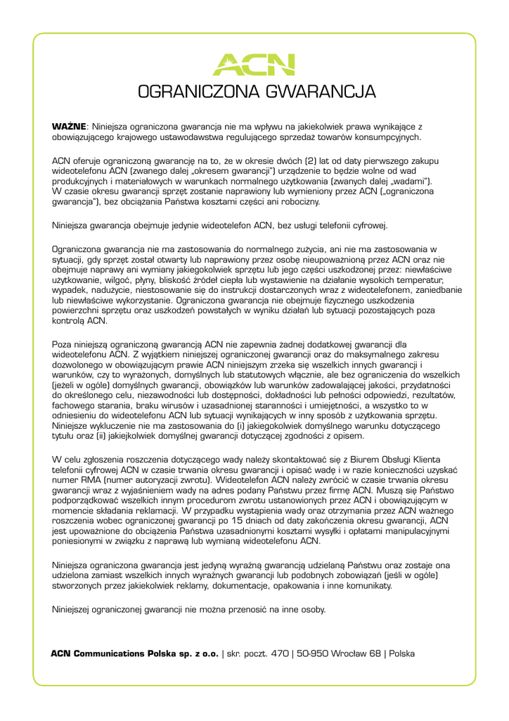 OGRANICZONA GWARANCJA WAŻNE: Niniejsza ograniczona gwarancja nie ma wpływu na jakiekolwiek prawa wynikające z obowiązującego krajowego ustawodawstwa regulującego sprzedaż towarów konsumpcyjnych. ACN oferuje ograniczoną gwarancję na to, że w okresie dwóch (2) lat od daty pierwszego zakupu wideotelefonu ACN (zwanego dalej „okresem gwarancji”) urządzenie to będzie wolne od wad produkcyjnych i materiałowych w warunkach normalnego użytkowania (zwanych dalej „wadami”). W czasie okresu gwarancji sprzęt zostanie naprawiony lub wymieniony przez ACN („ograniczona gwarancja”), bez obciążania Państwa kosztami części ani robocizny. Niniejsza gwarancja obejmuje jedynie wideotelefon ACN, bez usługi telefonii cyfrowej. Ograniczona gwarancja nie ma zastosowania do normalnego zużycia, ani nie ma zastosowania w sytuacji, gdy sprzęt został otwarty lub naprawiony przez osobę nieupoważnioną przez ACN oraz nie obejmuje naprawy ani wymiany jakiegokolwiek sprzętu lub jego części uszkodzonej przez: niewłaściwe użytkowanie, wilgoć, płyny, bliskość źródeł ciepła lub wystawienie na działanie wysokich temperatur, wypadek, nadużycie, niestosowanie się do instrukcji dostarczonych wraz z wideotelefonem, zaniedbanie lub niewłaściwe wykorzystanie. Ograniczona gwarancja nie obejmuje fizycznego uszkodzenia powierzchni sprzętu oraz uszkodzeń powstałych w wyniku działań lub sytuacji pozostających poza kontrolą ACN. Poza niniejszą ograniczoną gwarancją ACN nie zapewnia żadnej dodatkowej gwarancji dla wideotelefonu ACN. Z wyjątkiem niniejszej ograniczonej gwarancji oraz do maksymalnego zakresu dozwolonego w obowiązującym prawie ACN niniejszym zrzeka się wszelkich innych gwarancji i warunków, czy to wyrażonych, domyślnych lub statutowych włącznie, ale bez ograniczenia do wszelkich (jeżeli w ogóle) domyślnych gwarancji, obowiązków lub warunków zadowalającej jakości, przydatności do określonego celu, niezawodności lub dostępności, dokładności lub pełności odpowiedzi, rezultatów, fachowego starania, braku wirusów i uzasadnionej staranności i umiejętności, a wszystko to w odniesieniu do wideotelefonu ACN lub sytuacji wynikających w inny sposób z użytkowania sprzętu. Niniejsze wykluczenie nie ma zastosowania do (i) jakiegokolwiek domyślnego warunku dotyczącego tytułu oraz (ii) jakiejkolwiek domyślnej gwarancji dotyczącej zgodności z opisem. W celu zgłoszenia roszczenia dotyczącego wady należy skontaktować się z Biurem Obsługi Klienta telefonii cyfrowej ACN w czasie trwania okresu gwarancji i opisać wadę i w razie konieczności uzyskać numer RMA (numer autoryzacji zwrotu). Wideotelefon ACN należy zwrócić w czasie trwania okresu gwarancji wraz z wyjaśnieniem wady na adres podany Państwu przez firmę ACN. Muszą się Państwo podporządkować wszelkich innym procedurom zwrotu ustanowionych przez ACN i obowiązującym w momencie składania reklamacji. W przypadku wystąpienia wady oraz otrzymania przez ACN ważnego roszczenia wobec ograniczonej gwarancji po 15 dniach od daty zakończenia okresu gwarancji, ACN jest upoważnione do obciążenia Państwa uzasadnionymi kosztami wysyłki i opłatami manipulacyjnymi poniesionymi w związku z naprawą lub wymianą wideotelefonu ACN. Niniejsza ograniczona gwarancja jest jedyną wyraźną gwarancją udzielaną Państwu oraz zostaje ona udzielona zamiast wszelkich innych wyraźnych gwarancji lub podobnych zobowiązań (jeśli w ogóle) stworzonych przez jakiekolwiek reklamy, dokumentacje, opakowania i inne komunikaty. Niniejszej ograniczonej gwarancji nie można przenosić na inne osoby. ACN Communications Polska sp. z o.o. | skr. poczt. 470 | 50-950 Wrocław 68 | Polska