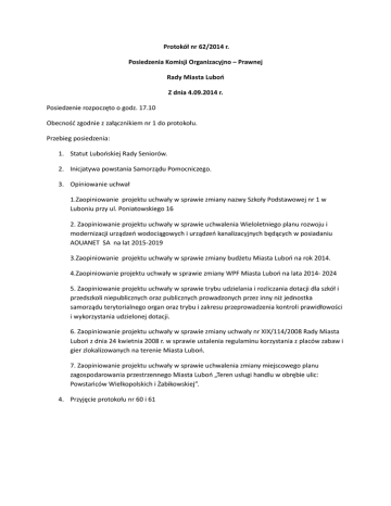 Protokół nr 62/2014 r. Posiedzenia Komisji Organizacyjno – Prawnej Rady Miasta Luboń Z dnia 4.09.2014 r. Posiedzenie rozpoczęto o godz. 17.10 Obecność zgodnie z załącznikiem nr 1 do protokołu. Przebieg posiedzenia: 1. Statut Lubońskiej Rady Seniorów. 2. Inicjatywa powstania Samorządu Pomocniczego. 3. Opiniowanie uchwał 1.Zaopiniowanie projektu uchwały w sprawie zmiany nazwy Szkoły Podstawowej nr 1 w Luboniu przy ul. Poniatowskiego 16 2. Zaopiniowanie projektu uchwały w sprawie uchwalenia Wieloletniego planu rozwoju i modernizacji urządzeń wodociągowych i urządzeń kanalizacyjnych będących w posiadaniu AOUANET SA na lat 2015-2019 3.Zaopiniowanie projektu uchwały w sprawie zmiany budżetu Miasta Luboń na rok 2014. 4.Zaopiniowanie projektu uchwały w sprawie zmiany WPF Miasta Luboń na lata 2014- 2024 5. Zaopiniowanie projektu uchwały w sprawie trybu udzielania i rozliczania dotacji dla szkół i przedszkoli niepublicznych oraz publicznych prowadzonych przez inny niż jednostka samorządu terytorialnego organ oraz trybu i zakresu przeprowadzenia kontroli prawidłowości i wykorzystania udzielonej dotacji. 6. Zaopiniowanie projektu uchwały w sprawie zmiany uchwały nr XIX/114/2008 Rady Miasta Luboń z dnia 24 kwietnia 2008 r. w sprawie ustalenia regulaminu korzystania z placów zabaw i gier zlokalizowanych na terenie Miasta Luboń. 7. Zaopiniowanie projektu uchwały w sprawie uchwalenia zmiany miejscowego planu zagospodarowania przestrzennego Miasta Luboń „Teren usługi handlu w obrębie ulic: Powstańców Wielkopolskich i Żabikowskiej”. 4. Przyjęcie protokołu nr 60 i 61 Ad.1 KOP analizowała uwagi zgłoszone w czasie konsultacji (załącznik nr2). Na spotkaniu obecny był Pan Jan Błaszczak, z którym omawiano uwagi do statutu. Uwagi dotyczyły dwóch zasadniczych kwestii : -zmiany sposobu wyłaniania składu Rady Seniorów. - oraz liczby członków zgłaszanych do Rady Seniorów przez organizacje. Kwestie wyboru Rady Seniorów na wzór wyborów do Młodzieżowej Rady Miasta omawiał Pan Sekretarz Miasta Janusz Piasecki i kierownik WOZiK Romualda Suchowiak. Po wnikliwej analizie ustalono, że spośród zgłoszonych kandydatów 15 wybierze Rada Miasta a przedtem kandydaci zostaną wyłonieni przez komisję doraźną lub stałą Rady Miasta. Ad.2 KOP omawiała kwestie powołania Samorządu Pomocniczego . Sama idea powołania samorządu jest słuszna , ale na jej powołanie ma wpływ budżet , który jest ograniczony i nie ma środków na przekazanie na inicjatywy powstałego samorządu . Ad.3 1.Przewodnicząca komisji przedstawiła radnym projekt uchwały w sprawie zmiany nazwy Szkoły Podstawowej nr 1 w Luboniu przy ul. Poniatowskiego 16 Przewodnicząca komisji poddała pod głosowanie projekt opinii komisji w sprawie pozytywnego zaopiniowania projektu uchwały. W głosowaniu brało udział 6 radnych. Wynik głosowania: Za przyjęciem opinii 6 radnych Przeciw – 0 radnych Wstrzymało się – 0 radnych 2. Przewodnicząca komisji przedstawiła radnym projekt uchwały w sprawie uchwalenia Wieloletniego planu rozwoju i modernizacji urządzeń wodociągowych i urządzeń kanalizacyjnych będących w posiadaniu AOUANET SA na lat 2015-2019 Przewodnicząca komisji poddała pod głosowanie projekt opinii komisji w sprawie pozytywnego zaopiniowania projektu uchwały. Wynik głosowania: W głosowaniu brało udział 6 radnych. Wynik głosowania: Za przyjęciem opinii 3 radnych Przeciw – 0 radnych Wstrzymało się – 3 radnych 3 Przewodnicząca komisji przedstawiła radnym projekt uchwały w sprawie zmiany budżetu Miasta Luboń na rok2014 Przewodnicząca komisji poddała pod głosowanie projekt opinii komisji w sprawie pozytywnego zaopiniowania projektu uchwały. W głosowaniu brało udział 6 radnych. Wynik głosowania: Za przyjęciem opinii 6 radnych Przeciw – 0 radnych Wstrzymało si ę – 0 radnych 4 Przewodnicząca komisji przedstawiła radnym projekt uchwały w sprawie zmiany WPF Miasta Luboń na lata 2014- 2024 Przewodnicząca komisji poddała pod głosowanie projekt opinii komisji w sprawie pozytywnego zaopiniowania projektu uchwały. W głosowaniu brało udział 6 radnych. Wynik głosowania: Za przyjęciem opinii 6 radnych Przeciw – 0 radnych Wstrzymało się – 0 radnych 5 Przewodnicząca komisji przedstawiła radnym projekt uchwały w sprawie trybu udzielania i rozliczania dotacji dla szkół i przedszkoli niepublicznych oraz publicznych prowadzonych przez inny niż jednostka samorządu terytorialnego organ oraz trybu i zakresu przeprowadzenia kontroli prawidłowości i wykorzystania udzielonej dotacji. Przewodnicząca komisji poddała pod głosowanie projekt opinii komisji w sprawie pozytywnego zaopiniowania projektu uchwały. W głosowaniu brało udział 6 radnych. Wynik głosowania: Za przyjęciem opinii 6 radnych Przeciw – 0 radnych Wstrzymało się – 0 radnych 6 Przewodnicząca komisji przedstawiła radnym projekt uchwały w sprawie zmiany uchwały nr XIX/114/2008 Rady Miasta Luboń z dnia 24 kwietnia 2008 r. w sprawie ustalenia regulaminu korzystania z placów zabaw i gier zlokalizowanych na terenie Miasta Luboń. Przewodnicząca komisji poddała pod głosowanie projekt opinii komisji w sprawie pozytywnego zaopiniowania projektu uchwały. W głosowaniu brało udział 6 radnych. Wynik głosowania: Za przyjęciem opinii 6 radnych Przeciw – 0 radnych Wstrzymało się – 0 radnych 7. Przewodnicząca komisji przedstawiła radnym projekt uchwały w sprawie uchwalenia zmiany miejscowego planu zagospodarowania przestrzennego Miasta Luboń „Teren usługi handlu w obrębie ulic: Powstańców Wielkopolskich i Żabikowskiej”. Komisja Organizacyjno – Prawna nie opiniowała tej uchwały. Ad.4 Przyjęcie protokołu nr 60/2014 Wynik głosowania: 6 osób za przyjęciem protokołu Przyjęcie protokołu nr 61/2014 Wynik głosowania: 6 osób za przyjęciem protokołu Sekretarz Przewodniczący komisji