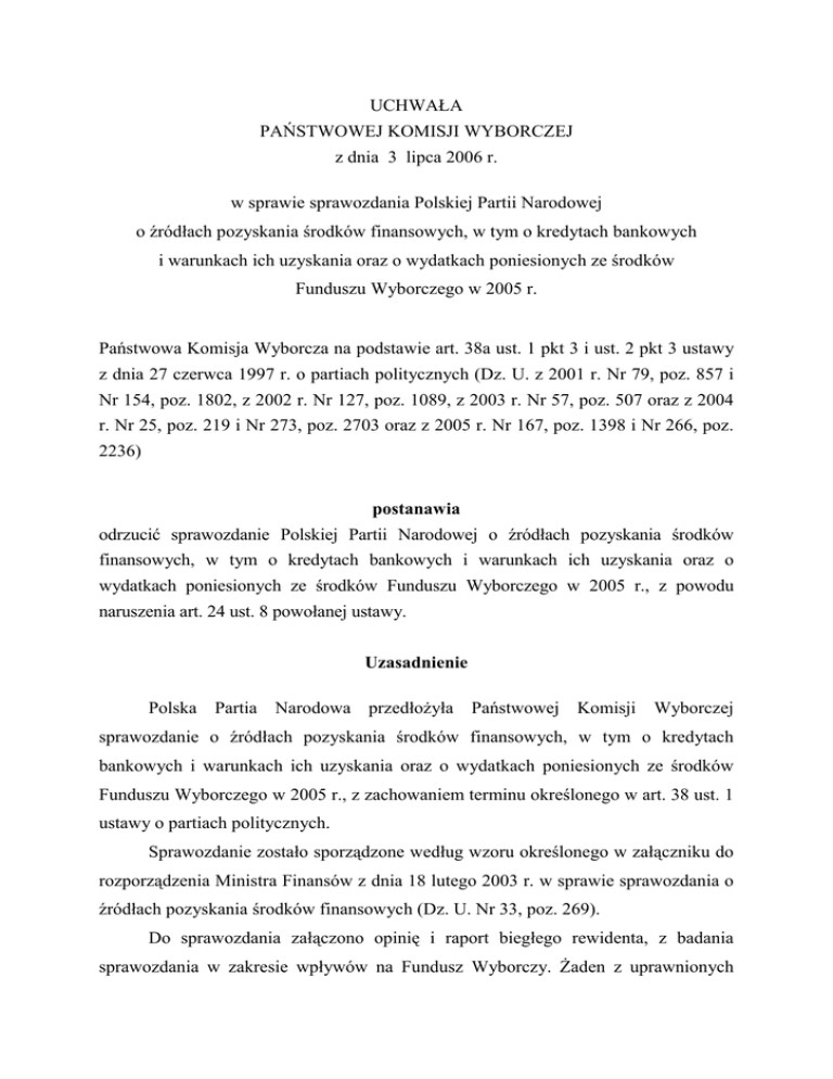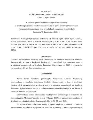 UCHWAŁA PAŃSTWOWEJ KOMISJI WYBORCZEJ z dnia 3 lipca 2006 r. w sprawie sprawozdania Polskiej Partii Narodowej o źródłach pozyskania środków finansowych, w tym o kredytach bankowych i warunkach ich uzyskania oraz o wydatkach poniesionych ze środków Funduszu Wyborczego w 2005 r. Państwowa Komisja Wyborcza na podstawie art. 38a ust. 1 pkt 3 i ust. 2 pkt 3 ustawy z dnia 27 czerwca 1997 r. o partiach politycznych (Dz. U. z 2001 r. Nr 79, poz. 857 i Nr 154, poz. 1802, z 2002 r. Nr 127, poz. 1089, z 2003 r. Nr 57, poz. 507 oraz z 2004 r. Nr 25, poz. 219 i Nr 273, poz. 2703 oraz z 2005 r. Nr 167, poz. 1398 i Nr 266, poz. 2236) postanawia odrzucić sprawozdanie Polskiej Partii Narodowej o źródłach pozyskania środków finansowych, w tym o kredytach bankowych i warunkach ich uzyskania oraz o wydatkach poniesionych ze środków Funduszu Wyborczego w 2005 r., z powodu naruszenia art. 24 ust. 8 powołanej ustawy. Uzasadnienie Polska Partia Narodowa przedłoŜyła Państwowej Komisji Wyborczej sprawozdanie o źródłach pozyskania środków finansowych, w tym o kredytach bankowych i warunkach ich uzyskania oraz o wydatkach poniesionych ze środków Funduszu Wyborczego w 2005 r., z zachowaniem terminu określonego w art. 38 ust. 1 ustawy o partiach politycznych. Sprawozdanie zostało sporządzone według wzoru określonego w załączniku do rozporządzenia Ministra Finansów z dnia 18 lutego 2003 r. w sprawie sprawozdania o źródłach pozyskania środków finansowych (Dz. U. Nr 33, poz. 269). Do sprawozdania załączono opinię i raport biegłego rewidenta, z badania sprawozdania w zakresie wpływów na Fundusz Wyborczy. śaden z uprawnionych 2 podmiotów, wymienionych w art. 34a ust. 5 w związku z art. 38a ust. 1 ustawy, nie zgłosił zastrzeŜeń do sprawozdania. Państwowa Komisja Wyborcza, na podstawie przedłoŜonego sprawozdania, załączonych do niego dokumentów, oraz opinii i raportu biegłego rewidenta stwierdziła, Ŝe Polska Partia Narodowa w sprawozdaniu za 2005 r. w części dotyczącej źródeł pozyskania środków finansowych (z wyłączeniem Funduszu Wyborczego) wykazała przychody w wysokości 15.756,83 zł, z czego na rachunku bankowym otwartym w Banku Pekao S.A. X Oddział w Warszawie nr rach. 64 1240 1095 1111 0010 0167 0412 zgromadzono kwotę 14.384 zł. Środki te pochodziły z wpłat od osób fizycznych z tytułu składek członkowskich (1.765 zł), darowizn (12.213,07 zł), z prowadzonej przez partię działalności własnej (405 zł) oraz z odsetek od środków na rachunku bankowym (0,93 zł). Ponadto partia uzyskała przychody w wysokości 1.372,83 zł z tytułu sprzedaŜy wydawanego biuletynu informacyjnego. Przychody te, jak wynika z treści sprawozdania, nie zostały odprowadzone na rachunek bankowy partii. Stanowi to naruszenie art. 24 ust. 8 ustawy, na podstawie którego partia moŜe gromadzić środki finansowe jedynie na rachunkach bankowych. W okresie sprawozdawczym partia posiadała w banku Pekao S.A. X Oddział w Warszawie odrębny rachunek bankowy Funduszu Wyborczego o nr 46 1240 1095 1111 0010 0707 7031, na którym były gromadzone przychody w łącznej wysokości 48.536,87 zł., z czego kwota 36.014,10 zł pochodziła z darowizn od osób fizycznych. W ramach tych środków, jak wynika z opinii i raportu biegłego rewidenta partia pozyskała w formie gotówkowej wpłaty w łącznej wysokości 6.100 zł. Środki te nie zostały zwrócone darczyńcy w ustawowym terminie, ale przyjęte i wydatkowane na cele statutowe. Stanowi to naruszenie art. 36a ust. 3 ustawy, na podstawie którego środki finansowe mogą być wpłacane na Fundusz Wyborczy jedynie czekiem, przelewem lub kartą płatniczą. Ponadto na rachunek Funduszu Wyborczego wpłynęły z tytułu sprzedaŜy osobom fizycznym biuletynu informacyjnego partii przychody w łącznej wysokości 12.522,50 zł. Środki te nie zostały zwrócone wpłacającym, ale przyjęte i wydatkowane na cele statutowe. Stanowi to naruszenie art. 36 ust. 1 ustawy, na podstawie którego 3 przychody Funduszu Wyborczego mogą pochodzić jedynie z wpłat własnych partii politycznej oraz darowizn, spadków i zapisów. Wydatki Funduszu Wyborczego zostały wykazane w kwocie 48.268,41 zł, z przeznaczeniem na finansowanie udziału partii w wyborach do Sejmu RP i do Senatu RP, przeprowadzonych w dniu 25 września 2005 r. – kwota 42.436,91 zł, oraz z przeznaczeniem na finansowanie wydatków związanych z udziałem w wyborach na urząd Prezydenta RP, przeprowadzonych w dniu 9 i 23 października 2005 r. – kwota 5.831,50 zł. PowyŜsze sumy są niezgodne z przychodami, pochodzącymi z Funduszu Wyborczego Polskiej Partii Narodowej, wykazanymi w sprawozdaniach wyborczych: - Komitetu Wyborczego Polskiej Partii Narodowej – kwota 20.298,41 zł, - Komitetu Wyborczego Kandydata na Prezydenta RP Leszka Henryka Bubla – kwota 3.970 zł. Państwowa Komisja Wyborcza, na podstawie art. 38a ust. 1 w związku z art. 34a ust. 2 ustawy zwróciła się do partii o wyjaśnienie powyŜszych rozbieŜności. W wyznaczonym terminie organ statutowy partii nie udzielił odpowiedzi na zapytanie Państwowej Komisji Wyborczej. W związku z tym na podstawie posiadanych dokumentów stwierdzono, Ŝe wydatki Funduszu Wyborczego w łącznej wysokości 24.000 zł zostały dokonane na cele nie związane z udziałem partii w wyborach, co stanowi naruszenie art. 35 ust. 1 ustawy. Naruszenie art. 24 ust. 8 ustawy o partiach politycznych stanowi podstawę do odrzucenia sprawozdania finansowego partii na podstawie art.38a ust.2 pkt 3 ustawy. Zgodnie z art. 39a ust. 1 ustawy o partiach politycznych korzyści majątkowe przekazane partii politycznej z naruszeniem przepisów art. 24 ust. 8, art. 36 ust. 1 oraz art. 36a ust. 3 ustawy podlegają przepadkowi na rzecz Skarbu Państwa. Na podstawie art. 39a ust. 4 ustawy, partia polityczna w terminie 60 dni od dnia wydania przez Państwową Komisję Wyborczą postanowienia moŜe dobrowolnie dokonać wpłaty korzyści m