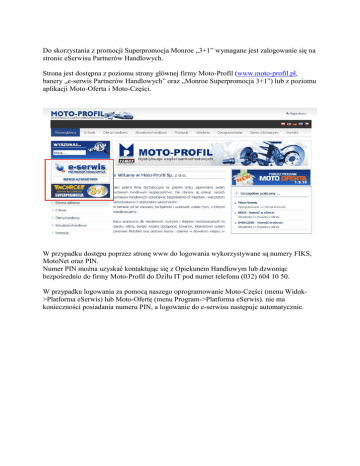 Do skorzystania z promocji Superpromocja Monroe „3+1” wymagane jest zalogowanie się na stronie eSerwisu Partnerów Handlowych. Strona jest dostępna z poziomu strony głównej firmy Moto-Profil (www.moto-profil.pl, banery „e-serwis Partnerów Handlowych” oraz „Monroe Superpromocja 3+1”) lub z poziomu aplikacji Moto-Oferta i Moto-Części. W przypadku dostępu poprzez stronę www do logowania wykorzystywane są numery FIKS, MotoNet oraz PIN. Numer PIN moŜna uzyskać kontaktując się z Opiekunem Handlowym lub dzwoniąc bezpośrednio do firmy Moto-Profil do Dziłu IT pod numer telefonu (032) 604 10 50. W przypadku logowania za pomocą naszego oprogramowanie Moto-Części (menu Widok>Platforma eSerwis) lub Moto-Ofertę (menu Program->Platforma eSerwis). nie ma konieczności posiadania numeru PIN, a logowanie do e-serwisu następuje automatycznie. Po zalogowaniu do platformy e-serwis przechodzimy do strony zamówień promocyjnych wybierając odpowiednią ikonę. W pole indeks naleŜy wpisać indeks amortyzatora, w pole ilość zamawianą ilość (1 lub 2), a następnie nacisnąć przycisk „Dodaj”. JeŜeli wskazany amortyzator jest na stanie zostanie dodany do listy. JeŜeli wskazanego amortyzatora nie ma aktualnie na stanie zostanie wyświetlony odpowiedni komunikat. Jedno zamówienie zawsze dotyczy tylko i wyłącznie kompletu 4 amortyzatorów do jednego typu pojazdu. Po dodaniu do listy kompletu amortyzatorów (4 sztuki) naleŜy wysłać zamówienie naciskając przycisk „Wyślij zamówienie”. ZłoŜenie zamówienie zostanie potwierdzone odpowiednim komunikatem. JeŜeli złoŜenie zamówienia się nie powiodło (poniewaŜ np. inny klient zamówił w międzyczasie ostatnią sztukę towaru), zostanie to potwierdzone komunikatem. Wszystkie zamówienia pojawiają się na liście dostępnej na zakładce „Wysłane zamówienia”. Na liście tej będą widoczne wszystkie zamówienia złoŜone w trakcie trwania promocji (zarówno te złoŜone prawidłowo, jak i te których nie moŜna z jakiegoś powodu zrealizować). W szczegółach zamówienia kolorem zielonym zaznaczona jest pozycja, która zostanie dostarczona po promocyjnej cenie.
