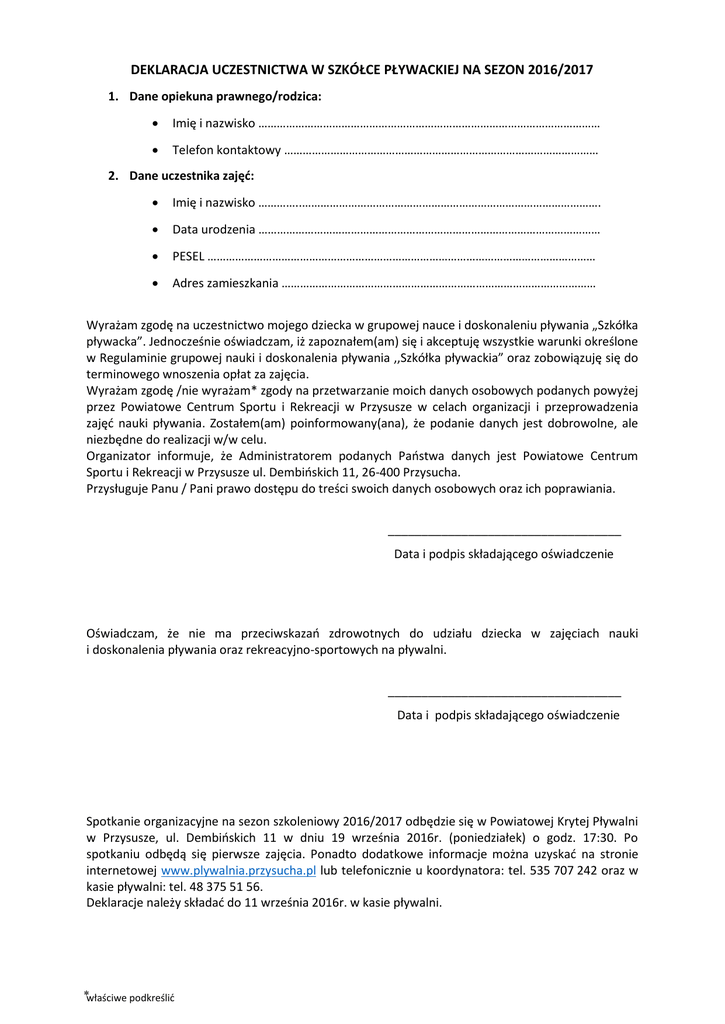 DEKLARACJA UCZESTNICTWA W SZKÓŁCE PŁYWACKIEJ NA SEZON 2016/2017 1. Dane opiekuna prawnego/rodzica: Imię i nazwisko ………………………………………………………………………………………………… Telefon kontaktowy ………………………………………………………………………………………… 2. Dane uczestnika zajęć: Imię i nazwisko …………..……………………………………………………………………………………. Data urodzenia ………………………………………………………………………………………………… PESEL ……………………………………………………………………………………………………………… Adres zamieszkania ………………………………………………………………………………………… Wyrażam zgodę na uczestnictwo mojego dziecka w grupowej nauce i doskonaleniu pływania „Szkółka pływacka”. Jednocześnie oświadczam, iż zapoznałem(am) się i akceptuję wszystkie warunki określone w Regulaminie grupowej nauki i doskonalenia pływania ,,Szkółka pływackia” oraz zobowiązuję się do terminowego wnoszenia opłat za zajęcia. Wyrażam zgodę /nie wyrażam* zgody na przetwarzanie moich danych osobowych podanych powyżej przez Powiatowe Centrum Sportu i Rekreacji w Przysusze w celach organizacji i przeprowadzenia zajęć nauki pływania. Zostałem(am) poinformowany(ana), że podanie danych jest dobrowolne, ale niezbędne do realizacji w/w celu. Organizator informuje, że Administratorem podanych Państwa danych jest Powiatowe Centrum Sportu i Rekreacji w Przysusze ul. Dembińskich 11, 26-400 Przysucha. Przysługuje Panu / Pani prawo dostępu do treści swoich danych osobowych oraz ich poprawiania. ___________________________________ Data i podpis składającego oświadczenie Oświadczam, że nie ma przeciwskazań zdrowotnych do udziału dziecka w zajęciach nauki i doskonalenia pływania oraz rekreacyjno-sportowych na pływalni. ___________________________________ Data i podpis składającego oświadczenie Spotkanie organizacyjne na sezon szkoleniowy 2016/2017 odbędzie się w Powiatowej Krytej Pływalni w Przysusze, ul. Dembińskich 11 w dniu 19 września 2016r. (poniedziałek) o godz. 17:30. Po spotkaniu odbędą się pierwsze zajęcia. Ponadto dodatkowe informacje można uzyskać na stronie internetowej www.plywalnia.przysucha.pl lub telefonicznie u koordynatora: tel. 535 707 242 oraz w kasie pływalni: tel. 48 375 51 56. Deklaracje należy składać do 11 września 2016r. w kasie pływalni. ⃰właściwe podkreślić