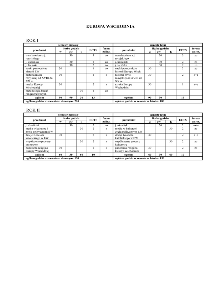 EUROPA WSCHODNIA ROK I przedmiot semestr zimowy liczba godzin w ćw k 30 translatorium z j. rosyjskiego j. ukraiński 30 j. łaciński 30 nauki pomocnicze 30 historii EW historia myśli 30 rosyjskiej od XVIII do XX w. sztuka Europy 30 Wschodniej metodologia badań 30 religioznawczych ogółem 90 90 30 ogółem godzin w semestrze zimowym: 210 3 forma zalicz. zo 2 2 1 zo zo zo 1 z 2 z 1 zo ECTS przedmiot translatorium z j. rosyjskiego j. ukraiński j. łaciński nauki pomocnicze historii Europy Wsch. historia myśli rosyjskiej od XVIII do XX w. sztuka Europy Wschodniej semestr letni liczba godzin w ćw k 30 3 forma zalicz. zo 30 2 2 2 zo zo zo 30 2 z+e 30 1 z+e 30 30 ogółem 90 90 ogółem godzin w semestrze letnim: 180 13 ECTS 13 ROK II przedmiot semestr zimowy liczba godzin w ćw k 30 30 j. ukraiński media w kulturze i życiu politycznym EW dzieje Kościoła 30 katolickiego w EW współczesne procesy 30 kulturowe panorama religijna 30 Europy Wschodniej ogółem 60 30 60 ogółem godzin w semestrze zimowym: 150 2 2 forma zalicz. zo z 2 z 2 z 2 z ECTS 10 przedmiot semestr letni liczba godzin w ćw k 30 30 j. ukraiński media w kulturze i życiu politycznym EW dzieje Kościoła 30 katolickiego w EW współczesne procesy kulturowe panorama religijna 30 Europy Wschodniej ogółem 60 30 ogółem godzin w semestrze letnim: 150 30 60 2 2 forma zalicz. zo+e zo 2 z+e 2 zo 2 zo ECTS 10