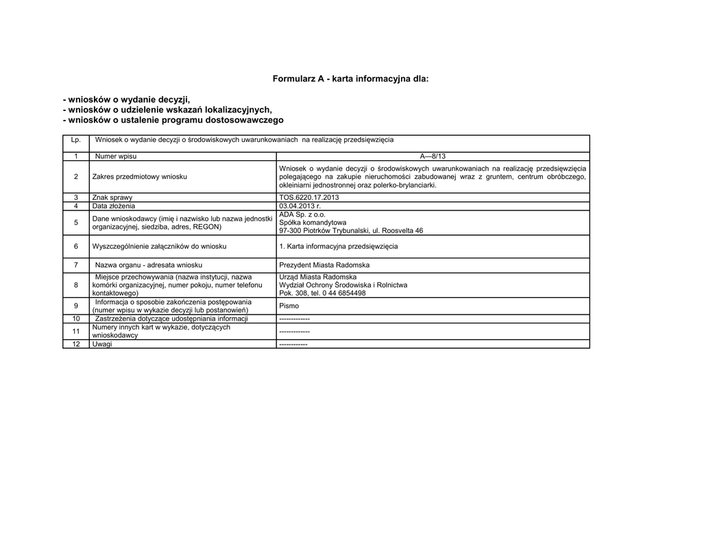 Formularz A - karta informacyjna dla: - wniosków o wydanie decyzji, - wniosków o udzielenie wskazań lokalizacyjnych, - wniosków o ustalenie programu dostosowawczego Lp. 1 Wniosek o wydanie decyzji o środowiskowych uwarunkowaniach na realizację przedsięwzięcia Numer wpisu 2 Zakres przedmiotowy wniosku 3 4 Znak sprawy Data złożenia 5 6 7 8 9 10 11 12 A—8/13 Wniosek o wydanie decyzji o środowiskowych uwarunkowaniach na realizację przedsięwzięcia polegającego na zakupie nieruchomości zabudowanej wraz z gruntem, centrum obróbczego, okleiniarni jednostronnej oraz polerko-brylanciarki. TOS.6220.17.2013 03.04.2013 r. ADA Sp. z o.o. Dane wnioskodawcy (imię i nazwisko lub nazwa jednostki Spółka komandytowa organizacyjnej, siedziba, adres, REGON) 97-300 Piotrków Trybunalski, ul. Roosvelta 46 Wyszczególnienie załączników do wniosku Nazwa organu - adresata wniosku Miejsce przechowywania (nazwa instytucji, nazwa komórki organizacyjnej, numer pokoju, numer telefonu kontaktowego) Informacja o sposobie zakończenia postępowania (numer wpisu w wykazie decyzji lub postanowień) Zastrzeżenia dotyczące udostępniania informacji Numery innych kart w wykazie, dotyczących wnioskodawcy Uwagi 1. Karta informacyjna przedsięwzięcia Prezydent Miasta Radomska Urząd Miasta Radomska Wydział Ochrony Środowiska i Rolnictwa Pok. 308, tel. 0 44 6854498 Pismo ------------------------------------