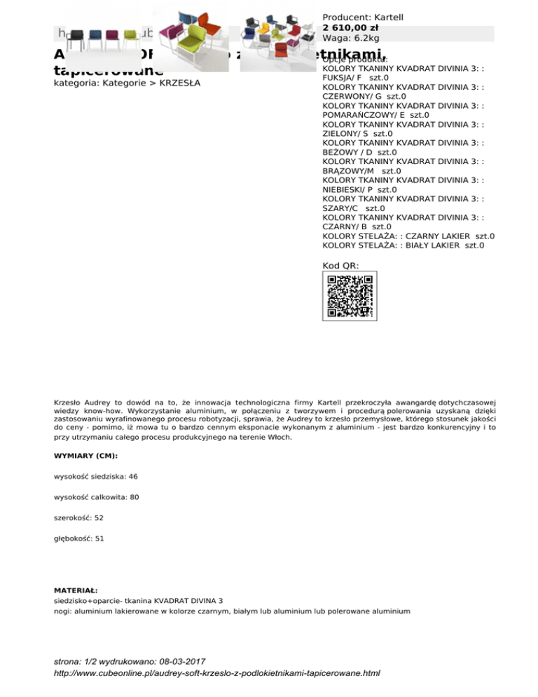 http://www.cubeonline.pl Producent: Kartell 2 610,00 zł Waga: 6.2kg AUDREY SOFT krzesło z podłokietnikami, Opcje produktu: KOLORY TKANINY KVADRAT DIVINIA 3: : tapicerowane FUKSJA/ F szt.0 kategoria: Kategorie > KRZESŁA KOLORY TKANINY KVADRAT DIVINIA 3: : CZERWONY/ G szt.0 KOLORY TKANINY KVADRAT DIVINIA 3: : POMARAŃCZOWY/ E szt.0 KOLORY TKANINY KVADRAT DIVINIA 3: : ZIELONY/ S szt.0 KOLORY TKANINY KVADRAT DIVINIA 3: : BEŻOWY / D szt.0 KOLORY TKANINY KVADRAT DIVINIA 3: : BRĄZOWY/M szt.0 KOLORY TKANINY KVADRAT DIVINIA 3: : NIEBIESKI/ P szt.0 KOLORY TKANINY KVADRAT DIVINIA 3: : SZARY/C szt.0 KOLORY TKANINY KVADRAT DIVINIA 3: : CZARNY/ B szt.0 KOLORY STELAŻA: : CZARNY LAKIER szt.0 KOLORY STELAŻA: : BIAŁY LAKIER szt.0 Kod QR: Krzesło Audrey to dowód na to, że innowacja technologiczna firmy Kartell przekroczyła awangardę dotychczasowej wiedzy know-how. Wykorzystanie aluminium, w połączeniu z tworzywem i procedurą polerowania uzyskaną dzięki zastosowaniu wyrafinowanego procesu robotyzacji, sprawia, że Audrey to krzesło przemysłowe, którego stosunek jakości do ceny - pomimo, iż mowa tu o bardzo cennym eksponacie wykonanym z aluminium - jest bardzo konkurencyjny i to przy utrzymaniu całego procesu produkcyjnego na terenie Włoch. WYMIARY (CM): wysokość siedziska: 46 wysokość calkowita: 80 szerokość: 52 głębokość: 51 MATERIAŁ: siedzisko+oparcie- tkanina KVADRAT DIVINA 3 nogi: aluminium lakierowane w kolorze czarnym, białym lub aluminium lub polerowane aluminium strona: 1/2 wydrukowano: 08-03-2017 http://www.cubeonline.pl/audrey-soft-krzeslo-z-podlokietnikami-tapicerowane.html Inne produkty Kartell: http://www.cubeonline.pl/manufacturer/kartell Inne produkty projektanta: http://www.cubeonline.pl/designer/lissoni-piero 31.00.13.0 strona: 2/2 wydrukowano: 08-03-2017 http://www.cubeonline.pl/audrey-soft-krzeslo-z-podlokietnikami-tapicerowane.html