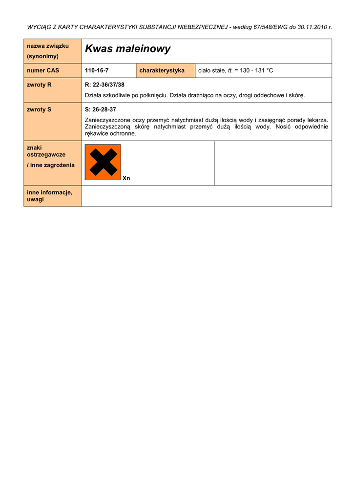 WYCIĄG Z KARTY CHARAKTERYSTYKI SUBSTANCJI NIEBEZPIECZNEJ - według 67/548/EWG do 30.11.2010 r. nazwa związku (synonimy) Kwas maleinowy numer CAS 110-16-7 charakterystyka zwroty R R: 22-36/37/38 ciało stałe, tt. = 130 - 131 °C Działa szkodliwie po połknięciu. Działa drażniąco na oczy, drogi oddechowe i skórę. zwroty S S: 26-28-37 Zanieczyszczone oczy przemyć natychmiast dużą ilością wody i zasięgnąć porady lekarza. Zanieczyszczoną skórę natychmiast przemyć dużą ilością wody. Nosić odpowiednie rękawice ochronne. znaki ostrzegawcze / inne zagrożenia Xn inne informacje, uwagi WYCIĄG Z KARTY CHARAKTERYSTYKI SUBSTANCJI NIEBEZPIECZNEJ – zgodnie z GHS i CLP od 01.12.2010 r. nazwa związku (synonimy) Kwas maleinowy numer CAS 110-16-7 charakterystyka zwroty H H319 Działa drażniąco na oczy. ciało stałe, tt. = 130 - 131 °C H315 Działa drażniąco na skórę. H302 Działa szkodliwie po połknięciu. H335 Może powodować podrażnienie dróg oddechowych. zwroty P P261 Unikać wdychania pyłu/ dymu/ gazu/ mgły/ par/ rozpylonej cieczy. P305 + P351 + P338 W PRZYPADKU DOSTANIA SIĘ DO OCZU: Ostrożnie płukać wodą przez kilka minut. Wyjąć soczewki kontaktowe, jeżeli są i można je łatwo usunąć. Nadal płukać. Działanie drażniące na oczy (Kat. 2) Piktogramy i hasło ostrzegawcze Drażniące na skórę (Kat. 2) / inne zagrożenia UWAGA! inne informacje, uwagi Opracował: Wojciech Kaspera