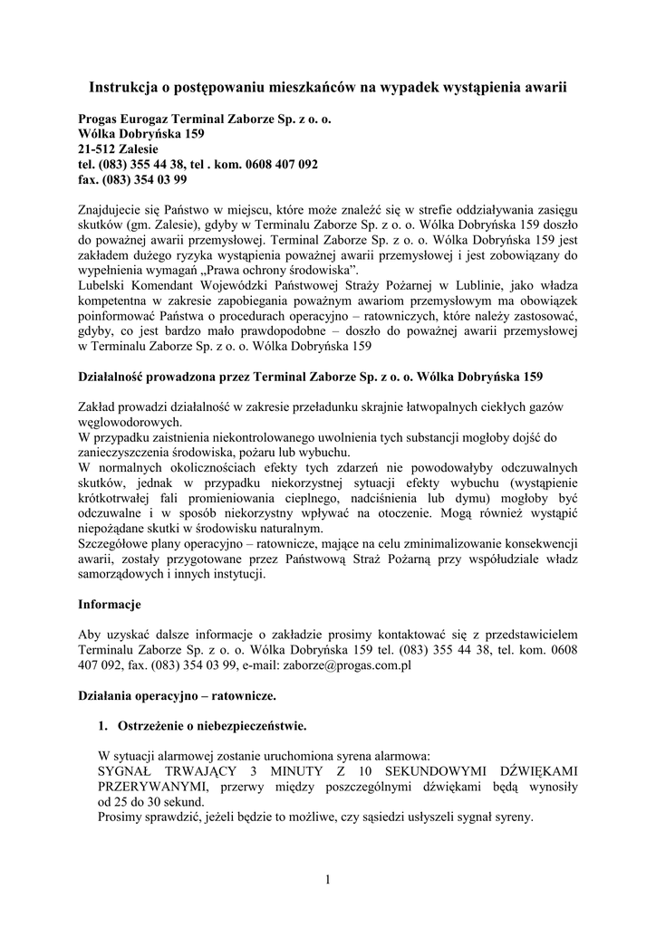 Instrukcja o postępowaniu mieszkańców na wypadek wystąpienia awarii Progas Eurogaz Terminal Zaborze Sp. z o. o. Wólka Dobryńska 159 21-512 Zalesie tel. (083) 355 44 38, tel . kom. 0608 407 092 fax. (083) 354 03 99 Znajdujecie się Państwo w miejscu, które moŜe znaleźć się w strefie oddziaływania zasięgu skutków (gm. Zalesie), gdyby w Terminalu Zaborze Sp. z o. o. Wólka Dobryńska 159 doszło do powaŜnej awarii przemysłowej. Terminal Zaborze Sp. z o. o. Wólka Dobryńska 159 jest zakładem duŜego ryzyka wystąpienia powaŜnej awarii przemysłowej i jest zobowiązany do wypełnienia wymagań „Prawa ochrony środowiska”. Lubelski Komendant Wojewódzki Państwowej StraŜy PoŜarnej w Lublinie, jako władza kompetentna w zakresie zapobiegania powaŜnym awariom przemysłowym ma obowiązek poinformować Państwa o procedurach operacyjno – ratowniczych, które naleŜy zastosować, gdyby, co jest bardzo mało prawdopodobne – doszło do powaŜnej awarii przemysłowej w Terminalu Zaborze Sp. z o. o. Wólka Dobryńska 159 Działalność prowadzona przez Terminal Zaborze Sp. z o. o. Wólka Dobryńska 159 Zakład prowadzi działalność w zakresie przeładunku skrajnie łatwopalnych ciekłych gazów węglowodorowych. W przypadku zaistnienia niekontrolowanego uwolnienia tych substancji mogłoby dojść do zanieczyszczenia środowiska, poŜaru lub wybuchu. W normalnych okolicznościach efekty tych zdarzeń nie powodowałyby odczuwalnych skutków, jednak w przypadku niekorzystnej sytuacji efekty wybuchu (wystąpienie krótkotrwałej fali promieniowania cieplnego, nadciśnienia lub dymu) mogłoby być odczuwalne i w sposób niekorzystny wpływać na otoczenie. Mogą równieŜ wystąpić niepoŜądane skutki w środowisku naturalnym. Szczegółowe plany operacyjno – ratownicze, mające na celu zminimalizowanie konsekwencji awarii, zostały przygotowane przez Państwową StraŜ PoŜarną przy współudziale władz samorządowych i innych instytucji. Informacje Aby uzyskać dalsze informacje o zakładzie prosimy kontaktować się z przedstawicielem Terminalu Zaborze Sp. z o. o. Wólka Dobryńska 159 tel. (083) 355 44 38, tel. kom. 0608 407 092, fax. (083) 354 03 99, e-mail: [email protected] Działania operacyjno – ratownicze. 1. OstrzeŜenie o niebezpieczeństwie. W sytuacji alarmowej zostanie uruchomiona syrena alarmowa: SYGNAŁ TRWAJĄCY 3 MINUTY Z 10 SEKUNDOWYMI DŹWIĘKAMI PRZERYWANYMI, przerwy między poszczególnymi dźwiękami będą wynosiły od 25 do 30 sekund. Prosimy sprawdzić, jeŜeli będzie to moŜliwe, czy sąsiedzi usłyszeli sygnał syreny. 1 2. Udaj się do bezpiecznego miejsca. Schroń się w pomieszczeniu zamkniętym, najlepiej budynku murowanym. MoŜesz rozwaŜyć, czy nie zaprosić sąsiadów lub przechodniów. Nie próbuj odbierać dzieci ze szkoły, przedszkola, Ŝłobka i placówek edukacyjnych. Dzieci zostaną zabezpieczone przez kierownictwo placówek i słuŜby ratownicze. Zasłoń okna, na oknie przyklej białą kartkę papieru. Ten znak będzie sygnalizował słuŜbom ratowniczym, Ŝe jest ktoś w domu. Nie wyjeŜdŜaj pojazdami poza miejsce zamieszkania – pojazdy silnikowe mogą zablokować drogę słuŜbom ratowniczym i porządkowym, ponadto mogą ulec uszkodzeniu w przypadku wjechania w strefę oddziaływania niebezpiecznych substancji. 3. Zabezpiecz swoje mienie. Zamknij szczelnie okna i drzwi. Wyłącz wentylatory i urządzenia gazowe. Zachowaj spokój i odpręŜ się. 4. Dalsze informacje. Czekaj na dalsze instrukcje od właściwych słuŜb: Państwowej StraŜy PoŜarnej, Policji, formacji Obrony Cywilnej, władz samorządowych. Słuchaj: Katolickie Radio PODLASIE (MHz – 101,7), Radio ZET (MHz – 107,0), Radio RMF FM (MHz – 89,3: 107,7), Radio PULS Lublin (MHz – 95,6), inne lokalne. Informacje o rozwoju sytuacji podawane będą, co 15 minut. Staraj się nie uŜywać telefonu stacjonarnego i komórkowego. W ten sposób linie telefoniczne nie będą zablokowane i ułatwią alarmowanie słuŜb ratowniczych oraz prowadzenie akacji ratowniczej. Wykonuj polecenia funkcjonariuszy Policji, Państwowej StraŜy PoŜarnej. Przy zachowaniu tych warunków będziesz bezpieczny. 5. Odwołanie alarmu. Na znak, Ŝe sytuacja alarmowa została odwołania, ponownie zostanie uruchomiona syrena alarmowa: PRZERYWANY SYGNAŁ PRZEZ PIĘTNAŚCIE MIUNUT. Po odwołaniu alarmu moŜesz wrócić do własnych zajęć. Nie naleŜy podejmować Ŝadnych działań. Nie wyjeŜdŜaj poza teren posesji. Gdy sygnał usłyszysz poza miejscem zamieszkania udaj się do najbliŜszego sklepu, szkoły, budynku uŜyteczności publicznej (urzędu). Zachowaj tą informację na przyszłość. 2 Wykaz telefonów alarmowych oraz adresów i telefonów wojewódzkich, powiatowych i gminnych organów i słuŜb odpowiedzialnych za podjęcie działań operacyjnoratowniczych 1. Telefony alarmowe. Państwowa StraŜ PoŜarna - 998 Policja - 997 Pogotowie Ratunkowe - 999 Numer alarmowy z telefonu komórkowego - 112 2. Adresy i telefony. Komenda Wojewódzka Państwowej StraŜy PoŜarnej w Lublinie ul. StraŜacka 7 20-012 Lublin tel. (081) 532 64 26 tel. (081) 534 80 50 tel. (081) 535 12 55 faks. (081) 532 67 14 Komenda Miejska Państwowej StraŜy PoŜarnej w Białej Podlaskiej ul. Sidorska 93 21-500 Biała Podlaska tel. (083) 344 72 50 tel. (083) 344 72 51 tel. (083) 344 72 10 faks. (083) 344 72 28 3