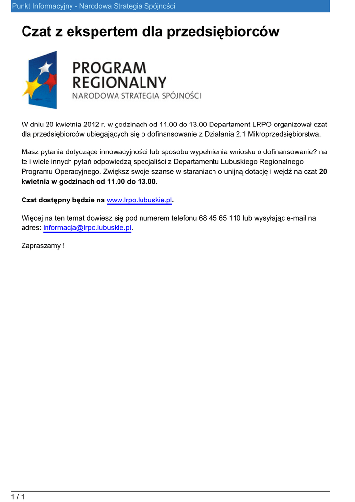 Punkt Informacyjny - Narodowa Strategia Spójności Czat z ekspertem dla przedsiębiorców W dniu 20 kwietnia 2012 r. w godzinach od 11.00 do 13.00 Departament LRPO organizował czat dla przedsiębiorców ubiegających się o dofinansowanie z Działania 2.1 Mikroprzedsiębiorstwa. Masz pytania dotyczące innowacyjności lub sposobu wypełnienia wniosku o dofinansowanie? na te i wiele innych pytań odpowiedzą specjaliści z Departamentu Lubuskiego Regionalnego Programu Operacyjnego. Zwiększ swoje szanse w staraniach o unijną dotację i wejdź na czat 20 kwietnia w godzinach od 11.00 do 13.00. Czat dostępny będzie na www.lrpo.lubuskie.pl. Więcej na ten temat dowiesz się pod numerem telefonu 68 45 65 110 lub wysyłając e-mail na adres: [email protected]. Zapraszamy ! 1/1