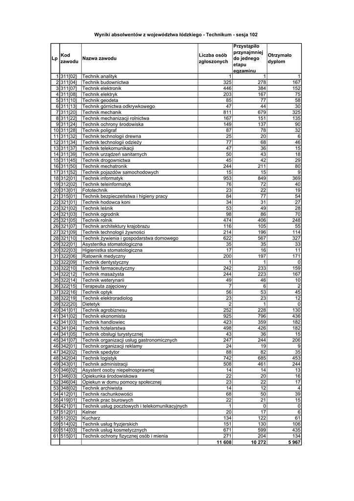 Wyniki absolwentów z województwa łódzkiego - Technikum - sesja 102 Kod Lp Nazwa zawodu zawodu 1 2 3 4 5 6 7 8 9 10 11 12 13 14 15 16 17 18 19 20 21 22 23 24 25 26 27 28 29 30 31 32 33 34 35 36 37 38 39 40 41 42 43 44 45 46 47 48 49 50 51 52 53 54 55 56 57 58 59 60 61 311[02] 311[04] 311[07] 311[08] 311[10] 311[13] 311[20] 311[22] 311[24] 311[28] 311[32] 311[34] 311[37] 311[39] 311[45] 311[50] 311[52] 312[01] 312[02] 313[01] 315[01] 321[01] 321[02] 321[03] 321[05] 321[07] 321[09] 321[10] 322[01] 322[03] 322[06] 322[09] 322[10] 322[12] 322[14] 322[15] 322[16] 322[19] 322[20] 341[01] 341[02] 341[03] 341[04] 341[05] 341[07] 342[01] 342[02] 342[04] 343[01] 346[02] 346[03] 346[04] 348[02] 412[01] 419[01] 421[01] 512[01] 512[02] 514[02] 514[03] 515[01] Technik analityk Technik budownictwa Technik elektronik Technik elektryk Technik geodeta Technik górnictwa odkrywkowego Technik mechanik Technik mechanizacji rolnictwa Technik ochrony środowiska Technik poligraf Technik technologii drewna Technik technologii odzieży Technik telekomunikacji Technik urządzeń sanitarnych Technik drogownictwa Technik mechatronik Technik pojazdów samochodowych Technik informatyk Technik teleinformatyk Fototechnik Technik bezpieczeństwa i higieny pracy Technik hodowca koni Technik leśnik Technik ogrodnik Technik rolnik Technik architektury krajobrazu Technik technologii żywności Technik żywienia i gospodarstwa domowego Asystentka stomatologiczna Higienistka stomatologiczna Ratownik medyczny Technik dentystyczny Technik farmaceutyczny Technik masażysta Technik weterynarii Terapeuta zajęciowy Technik optyk Technik elektroradiolog Dietetyk Technik agrobiznesu Technik ekonomista Technik handlowiec Technik hotelarstwa Technik obsługi turystycznej Technik organizacji usług gastronomicznych Technik organizacji reklamy Technik spedytor Technik logistyk Technik administracji Asystent osoby niepełnosprawnej Opiekunka środowiskowa Opiekun w domu pomocy społecznej Technik archiwista Technik rachunkowości Technik prac biurowych Technik usług pocztowych i telekomunikacyjnych Kelner Kucharz Technik usług fryzjerskich Technik usług kosmetycznych Technik ochrony fizycznej osób i mienia Liczba osób zgłoszonych 1 325 446 203 85 47 811 167 149 87 25 77 47 50 45 244 15 953 76 23 84 34 53 98 474 116 214 622 35 17 200 1 242 244 49 7 56 23 2 252 925 423 498 43 247 24 88 742 508 14 22 23 14 68 22 1 20 134 151 671 271 11 608 Przystąpiło przynajmniej Otrzymało do jednego dyplom etapu egzaminu 1 1 278 167 384 152 167 75 77 58 44 30 679 325 151 135 137 90 78 32 20 6 68 46 36 15 43 18 42 29 211 80 15 9 849 369 72 40 22 19 77 54 31 27 49 28 86 70 406 248 105 55 196 114 567 327 35 33 16 11 197 171 1 0 233 159 223 167 46 10 6 2 53 45 23 12 1 0 228 130 796 436 359 182 426 182 36 15 244 206 19 9 82 35 685 453 461 244 14 13 20 16 22 17 12 4 50 39 21 15 0 0 17 6 122 61 130 106 599 435 204 134 10 272 5 967