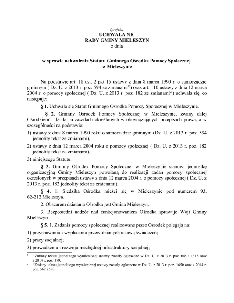 (projekt) UCHWAŁA NR RADY GMINY MIELESZYN z dnia w sprawie uchwalenia Statutu Gminnego Ośrodka Pomocy Społecznej w Mieleszynie Na podstawie art. 18 ust. 2 pkt 15 ustawy z dnia 8 marca 1990 r. o samorządzie gminnym ( Dz. U. z 2013 r. poz. 594 ze zmianami 1)) oraz art. 110 ustawy z dnia 12 marca 2004 r. o pomocy społecznej ( Dz. U. z 2013 r. poz. 182 ze zmianami 2)) uchwala się, co następuje: § 1. Uchwala się Statut Gminnego Ośrodka Pomocy Społecznej w Mieleszynie. § 2. Gminny Ośrodek Pomocy Społecznej w Mieleszynie, zwany dalej Ośrodkiem”, działa na zasadach określonych w obowiązujących przepisach prawa, a w szczególności na podstawie: 1) ustawy z dnia 8 marca 1990 roku o samorządzie gminnym (Dz. U. z 2013 r. poz. 594 jednolity tekst ze zmianami), 2) ustawy z dnia 12 marca 2004 roku o pomocy społecznej ( Dz. U. z 2013 r. poz. 182 jednolity tekst ze zmianami), 3) niniejszego Statutu. § 3. Gminny Ośrodek Pomocy Społecznej w Mieleszynie stanowi jednostkę organizacyjną Gminy Mieleszyn powołaną do realizacji zadań pomocy społecznej określonych w przepisach ustawy z dnia 12 marca 2004 r. o pomocy społecznej ( Dz. U. z 2013 r. poz. 182 jednolity tekst ze zmianami). § 4. 1. Siedziba Ośrodka mieści się w Mieleszynie pod numerem 93, 62-212 Mieleszyn. 2. Obszarem działania Ośrodka jest Gmina Mieleszyn. 3. Bezpośredni nadzór nad funkcjonowaniem Ośrodka sprawuje Wójt Gminy Mieleszyn. § 5. 1. Zadania pomocy społecznej realizowane przez Ośrodek polegają na: 1) przyznawaniu i wypłacaniu przewidzianych ustawą świadczeń; 2) pracy socjalnej; 3) prowadzeniu i rozwoju niezbędnej infrastruktury socjalnej; 1 2 ) Zmiany tekstu jednolitego wymienionej ustawy zostały ogłoszone w Dz. U. z 2013 r. poz. 645 i 1318 oraz z 2014 r. poz. 379. ) Zmiany tekstu jednolitego wymienionej ustawy zostały ogłoszone w Dz. U. z 2013 r. poz. 1650 oraz z 2014 r. poz. 567 i 598. 4) analizie i ocenie zjawisk rodzących zapotrzebowanie na świadczenia z pomocy społecznej; 5) realizacji zadań wynikających z rozeznanych potrzeb społecznych; 6) rozwijaniu nowych form identyfikowanych potrzeb; pomocy społecznej i samopomocy w ramach 7) wykonywanie innych zadań z zakresu pomocy społecznej w szczególności związanych z wdrażaniem i realizacją projektów współfinansowanych ze środków Unii Europejskiej, środków ministerialnych oraz tworzenie i realizacja lokalnych programów osłonowych. 2. Ośrodek w zakresie pomocy społecznej realizuje: 1) zadania własne Gminy o charakterze obowiązkowym, 2) zadania własne Gminy, 3) zadania z zakresu administracji rządowej zlecone Gminie. 3. Szczegółowy zakres zadań, o których mowa w ust. 2 § 5 niniejszego Statutu określony jest w art. 17 i 18 ustawy z dnia 12 marca 2004 r. o pomocy społecznej (Dz. U. z 2013 r. poz. 182 jednolity tekst ze zmianami). 4. Ośrodek realizuje także inne zadania na podstawie odrębnego upoważnienia Wójta Gminy Mieleszyn, a w szczególności: 1) zadania wynikające z ustawy z dnia 28 listopada 2003 r. o świadczeniach rodzinnych (Dz. U. z 2013 r. poz. 1456 j.t. ze zm.) polegające na przyznawaniu i wypłacaniu osobom uprawnionym świadczeń rodzinnych, 2) zadania wynikające z ustawy z dnia 07 września 2007 r. o pomocy osobom uprawnionym do alimentów (Dz. U. z 2012 r. poz. 1228 j.t. ze zm.) polegające na prowadzeniu postępowań i wydawaniu decyzji administracyjnych w sprawach świadczeń z funduszu alimentacyjnego oraz podejmowaniu działań wobec dłużników alimentacyjnych, 3) zadania wynikające z ustawy z dnia 21 czerwca 2001 r. o dodatkach mieszkaniowych (Dz. U. z 2013 r. poz. 966 j.t. ze zm.) polegające na przyznawaniu i wypłacaniu osobom uprawnionym dodatków mieszkaniowych, 4) zadania wynikające z ustawy z dnia 27 sierpnia 2004 r. o świadczeniach opieki zdrowotnej finansowanych ze środków publicznych (Dz. U. z 2008 r. Nr 164, poz. 1027 j.t. ze zm.) polegające na prowadzeniu postępowań i wydawaniu decyzji potwierdzających prawo do świadczeń opieki zdrowotnej, 5) zadania wynikające z ustawy z dnia 4 kwietnia 2014 r. o ustaleniu i wypłacie zasiłków dla opiekunów (Dz. U. z 2014 r. poz. 567) polegające na przyznawaniu i wypłacaniu osobom uprawnionym zasiłków dla opiekunów, 6) zadania wynikające z ustawy z dnia 29 lipca 2005 r. o przeciwdziałaniu przemocy w rodzinie (Dz. U. 2005r. Nr 180, poz. 1493 ze zm.) polegające między innymi na tworzeniu i realizacji gminnego programu przeciwdziałania przemocy, 7) zadania wynikające z ustawy z dnia 9 czerwca 2011 r. o wspieraniu rodziny i systemie pieczy zastępczej (Dz. U. z 2013 r. poz. 135 j.t. ze zm.). 5. Ponadto Ośrodek prowadzi postępowania i wydaje decyzje administracyjne dotyczące zryczałtowanego dodatku energetycznego dla odbiorców wrażliwych energii elektrycznej, o których mowa w art. 3 pkt 13 C ustawy z dnia 10 kwietnia 1997 r. Prawo energetyczne (Dz. U. z 2012 r. poz. 1059 j.t. ze zm.) na podstawie upoważnienia udzielonego uchwałą Rady Gminy Mieleszyn. § 6. Przy realizacji zadań określonych w § 5 Ośrodek współdziała z istniejącymi instytucjami, organizacjami społecznymi, wszystkimi kościołami i związkami wyznaniowymi, zakładami pracy, z zagranicą, jak również osobami fizycznymi i innymi osobami prawnymi w celu realizacji zadań pomocy społecznej. § 7. 1. Ośrodkiem kieruje odpowiedzialny za całokształt pracy Kierownik, który odpowiada za realizację zadań statutowych, kieruje jego działalnością i reprezentuje na zewnątrz. 2. Kierownika Ośrodka zatrudnia i zwalnia Wójt Gminy, który jednocześnie jest zwierzchnikiem służbowym Kierownika Gminnego Ośrodka Pomocy Społecznej i dokonuje wobec niego czynności w sprawach z zakresu prawa pracy. 3. Do zadań Kierownika Gminnego Ośrodka Pomocy Społecznej należy w szczególności: 1) określenie i wdrożenie odpowiedniej struktury organizacyjnej, w tym między innymi opracowanie regulaminu organizacyjnego Ośrodka, 2) dobór
