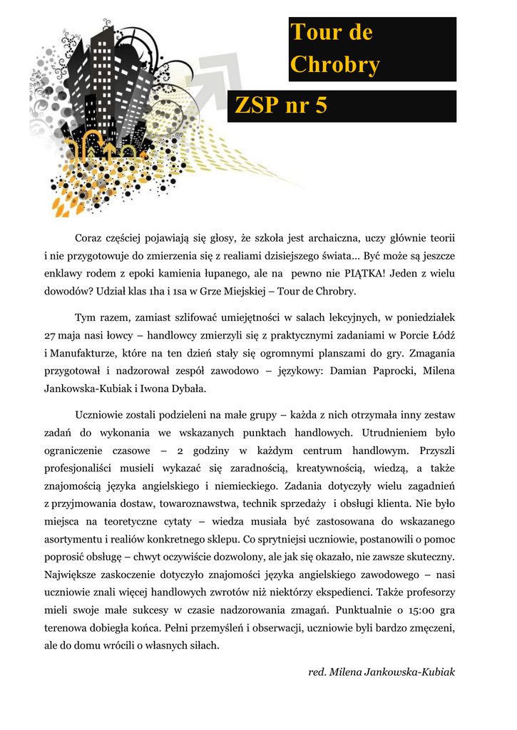 Tour de Chrobry ZSP nr 5 Coraz częściej pojawiają się głosy, że szkoła jest archaiczna, uczy głównie teorii i nie przygotowuje do zmierzenia się z realiami dzisiejszego świata… Być może są jeszcze enklawy rodem z epoki kamienia łupanego, ale na pewno nie PIĄTKA! Jeden z wielu dowodów? Udział klas 1ha i 1sa w Grze Miejskiej – Tour de Chrobry. Tym razem, zamiast szlifować umiejętności w salach lekcyjnych, w poniedziałek 27 maja nasi łowcy – handlowcy zmierzyli się z praktycznymi zadaniami w Porcie Łódź i Manufakturze, które na ten dzień stały się ogromnymi planszami do gry. Zmagania przygotował i nadzorował zespół zawodowo – językowy: Damian Paprocki, Milena Jankowska-Kubiak i Iwona Dybała. Uczniowie zostali podzieleni na małe grupy – każda z nich otrzymała inny zestaw zadań do wykonania we wskazanych punktach handlowych. Utrudnieniem było ograniczenie czasowe – 2 godziny w każdym centrum handlowym. Przyszli profesjonaliści musieli wykazać się zaradnością, kreatywnością, wiedzą, a także znajomością języka angielskiego i niemieckiego. Zadania dotyczyły wielu zagadnień z przyjmowania dostaw, towaroznawstwa, technik sprzedaży i obsługi klienta. Nie było miejsca na teoretyczne cytaty – wiedza musiała być zastosowana do wskazanego asortymentu i realiów konkretnego sklepu. Co sprytniejsi uczniowie, postanowili o pomoc poprosić obsługę – chwyt oczywiście dozwolony, ale jak się okazało, nie zawsze skuteczny. Największe zaskoczenie dotyczyło znajomości języka angielskiego zawodowego – nasi uczniowie znali więcej handlowych zwrotów niż niektórzy ekspedienci. Także profesorzy mieli swoje małe sukcesy w czasie nadzorowania zmagań. Punktualnie o 15:00 gra terenowa dobiegła końca. Pełni przemyśleń i obserwacji, uczniowie byli bardzo zmęczeni, ale do domu wrócili o własnych siłach. red. Milena Jankowska-Kubiak