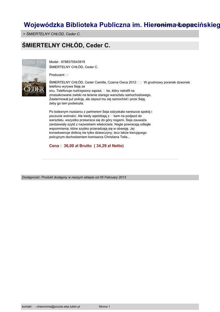Utworzono : 08Łopacińskieg March 2017 Wojewódzka Biblioteka Publiczna im. Hieronima > ŚMIERTELNY CHŁÓD, Ceder C. ŚMIERTELNY CHŁÓD, Ceder C. Model : 9788375543919 ŚMIERTELNY CHŁÓD, Ceder C. Producent : ŚMIERTELNY CHŁÓD, Ceder Camilla, Czarna Owca 2012�� W grudniowy poranek dzwonek telefonu wyrywa Seję ze snu. Telefonuje roztrzęsiony sąsiad, �ke, który natrafił na zmasakrowane zwłoki na terenie starego warsztatu samochodowego. Zaalarmował już policję, ale zepsuł mu się samochód i prosi Seję, żeby go tam podwiozła. Po bolesnym rozstaniu z partnerem Seja odzyskała nareszcie spokój i poczucie wolności. Ale kiedy wjeżdżają z �kem na podjazd do warsztatu, wszystko przewraca się do góry nogami. Seja zauważa zardzewiały szyld z nazwiskiem właściciela. Nagle powracają odległe wspomnienia, które szybko przeradzają się w obsesję. Jej konsekwencje dotkną nie tylko dziewczyny, lecz także kierującego policyjnym dochodzeniem komisarza Christiana Tella... Cena : 36,00 zł Brutto ( 34,29 zł Netto) Dostępność: Produkt dostępny w naszym sklepie od 05 February 2013 kontakt : - [email protected] Strona 1