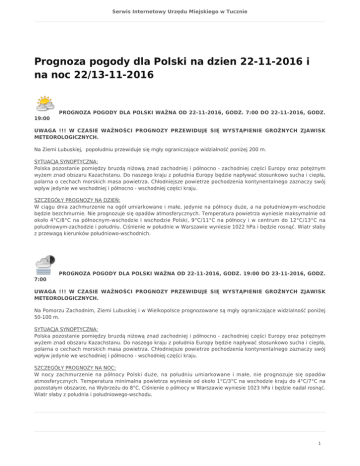 Serwis Internetowy Urzędu Miejskiego w Tucznie Prognoza pogody dla Polski na dzien 22-11-2016 i na noc 22/13-11-2016 PROGNOZA POGODY DLA POLSKI WAŻNA OD 22-11-2016, GODZ. 7:00 DO 22-11-2016, GODZ. 19:00 UWAGA !!! W CZASIE WAŻNOŚCI PROGNOZY PRZEWIDUJE SIĘ WYSTĄPIENIE GROŹNYCH ZJAWISK METEOROLOGICZNYCH. Na Ziemi Lubuskiej, popołudniu przewiduje się mgły ograniczające widzialność poniżej 200 m. SYTUACJA SYNOPTYCZNA: Polska pozostanie pomiędzy bruzdą niżową znad zachodniej i północno - zachodniej części Europy oraz potężnym wyżem znad obszaru Kazachstanu. Do naszego kraju z południa Europy będzie napływać stosunkowo sucha i ciepła, polarna o cechach morskich masa powietrza. Chłodniejsze powietrze pochodzenia kontynentalnego zaznaczy swój wpływ jedynie we wschodniej i północno - wschodniej części kraju. SZCZEGÓŁY PROGNOZY NA DZIEŃ: W ciągu dnia zachmurzenie na ogół umiarkowane i małe, jedynie na północy duże, a na południowym-wschodzie będzie bezchmurnie. Nie prognozuje się opadów atmosferycznych. Temperatura powietrza wyniesie maksymalnie od około 4°C/8°C na północnym-wschodzie i wschodzie Polski, 9°C/11°C na północy i w centrum do 12°C/13°C na południowym-zachodzie i południu. Ciśnienie w południe w Warszawie wyniesie 1022 hPa i będzie rosnąć. Wiatr słaby z przewagą kierunków południowo-wschodnich. PROGNOZA POGODY DLA POLSKI WAŻNA OD 22-11-2016, GODZ. 19:00 DO 23-11-2016, GODZ. 7:00 UWAGA !!! W CZASIE WAŻNOŚCI PROGNOZY PRZEWIDUJE SIĘ WYSTĄPIENIE GROŹNYCH ZJAWISK METEOROLOGICZNYCH. Na Pomorzu Zachodnim, Ziemi Lubuskiej i w Wielkopolsce prognozowane są mgły ograniczające widzialność poniżej 50-100 m. SYTUACJA SYNOPTYCZNA: Polska pozostanie pomiędzy bruzdą niżową znad zachodniej i północno - zachodniej części Europy oraz potężnym wyżem znad obszaru Kazachstanu. Do naszego kraju z południa Europy będzie napływać stosunkowo sucha i ciepła, polarna o cechach morskich masa powietrza. Chłodniejsze powietrze pochodzenia kontynentalnego zaznaczy swój wpływ jedynie we wschodniej i północno - wschodniej części kraju. SZCZEGÓŁY PROGNOZY NA NOC: W nocy zachmurzenie na północy Polski duże, na południu umiarkowane i małe, nie prognozuje się opadów atmosferycznych. Temperatura minimalna powietrza wyniesie od około 1°C/3°C na wschodzie kraju do 4°C/7°C na pozostałym obszarze, na Wybrzeżu do 8°C. Ciśnienie o północy w Warszawie wyniesie 1023 hPa i będzie nadal rosnąć. Wiatr słaby z południa i południowego-wschodu. 1