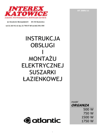 DT 2009/11 INSTRUKCJA OBSŁUGI I MONTAŻU ELEKTRYCZNEJ SUSZARKI ŁAZIENKOWEJ model ORGANZA 500 750 1500 1750 1 W W W W PRZED ROZPOCZĘCIEM MONTAŻU URZĄDZENIA NALEŻY ZAPOZNAĆ SIĘ Z NINIEJSZĄ INSTRUKCJĄ NALEŻY ZACHOWAĆ NINIEJSZĄ INSTRUKCJĘ OBSŁUGI MONTAŻ URZĄDZENIA (POD RYGOREM UTRATY GWARANCJI) NALEŻY PRZEPROWADZAĆ W OPARCIU O NORMY OBOWIĄZUJĄCE W DANYM KRAJU ORAZ INFORMACJE ZAWARTE W NINIEJSZEJ INSTRUKCJI GDZIE ZAINSTALOWAĆ URZĄDZENIE ? Urządzenie, które Państwo nabyli, zostało zaprojektowane do ogrzewania pomieszczeń mieszkalnych (łazienka, kuchnia), biurowych, itp. W przypadku montażu urządzenia w miejscu o innym przeznaczeniu, należy zasięgnąć opinii producenta. Urządzenie zostało wyposażone w zabezpieczenia wykonane w 2 klasie ochronności – CLASSE II, posiada również zabezpieczenie przeciw bryzgowe umożliwiające montaż urządzenia w 2 strefie (Volume2) pomieszczenia łazienki. (rys.) Wybierając miejsce montażu urządzenia, konieczne jest zachowanie minimalnych odległości pomiędzy urządzeniem a innymi przedmiotami znajdującymi się w danym pomieszczeniu. Należy pamiętać o tym, że urządzenie nie powinno znajdować się w zasięgu ręki osoby biorącej kąpiel lub prysznic. NIE WOLNO INSTALOWAĆ URZĄDZENIA: W MIEJSCU WYSTĘPOWANIA PRZECIĄGÓW, GDYŻ MOGŁOBY TO ZAKŁÓCIĆ PRAWIDŁOWĄ JEGO REGULACJĘ, W BEZPOŚREDNIM SĄSIEDZTWIE OTWORÓW LUB URZĄDZEŃ KONTROLUJĄCYCH WENTYLACJĘ I KLIMATYZACJĘ, PONIŻEJ GNIAZDEK ELEKTRYCZNYCH BĘDĄCYM STALE POD NAPIĘCIEM, NA WYSOKOŚCI POWYŻEJ 1000 M N.P.M., GDYŻ NA TAKIEJ WYSOKOŚCI POWIETRZE JEST ZBYT ROZRZEDZONE MONTAŻ URZĄDZENIA MONTAŻ NA ŚCIANIE (szablon montażu jest nadrukowany na kartonie) Aby prawidłowo wykonać mocowanie należy: odpiąć boki kartonu/opakowania i ustawić go pionowo przy ścianie (rys1), dolną klapkę kartonu/opakowania umieścić bezpośrednio na podłożu lub na odpowiedniej wysokości instalacji (rys1), zaznaczyć starannie ołówkiem 4 punkty do przewiercenia (narysować krzyżyk o maksymalnej szerokości 2 cm (rys.2), wywiercić otwory (rys.3), przykręcić śruby użyć przy tym podkładek (wieszaków) pod każdą ze śrub (rys.4), umieścić urządzenie na wieszakach (rys.5), przesunąć w kierunku ściany osłonki maskujące wieszaki i śruby montażowe (rys.5), 2 PODŁĄCZENIE ELEKTRYCZNE URZĄDZENIE PRZEWIDZIANE JEST DO WSPÓŁPRACY Z NAPIĘCIEM 230 V , 50 HZ URZĄDZENIE NIE WYMAGA I NIE POSIADA PRZEWODU UZIEMIENIA, DLATEGO ZABRANIA SIĘ JAKIEJ KOLWIEK PRÓBY UZIEMIENIA URZĄDZENIA Aby podłączyć urządzenie pod napięcie elektryczne, należy: FAZA (brązowy) faza sprawdzić czy wartość napięcia w sieci sieć ZERO (niebieski) zero elektryczna odpowiada wartości podanej na tabliczce znamionowej, PILOT (czarny) kabel elektryczny grzejnika wpiąć przewód grzejnika bezpośrednio do puszki podłączeniowej lub pośrednio (jeśli grzejnik posiada PILOT przewód elektryczny (kolor czarny) służący do zdalnego wtyczkę) włożyć ją do gniazdka elektrycznego, sterowania siecią grzejników (modele z systemem PASS Program). obowiązkowo należy zachować prawidłową Przewód sterujący PILOT należy połączyć z następnym grzejnikiem wyposażonym w taki sam przewód sterujący PILOT (tworzenie sieci należy biegunowość przewodów (rys), rozpocząć od grzejnika, w którym umieszczony jest programator (CHRONOPASS) .Maksymalna ilość grzejników pracujących puszkę przyłączeniową lub gniazdko sieciowe w sieci to 15 szt. należy zamontować przynajmniej 25 cm nad podłogą. W pomieszczeniach o dużej wilgotności tj. łazienki, czy kuchnie, instalacja elektryczna powinna być wyposażona w mechanizm odcięcia zasilania na wszystkich biegunach (bezpiecznik różnicowy 30mA). PROGRAMOWANIE I PRACA W SIECI Tabela poleceń jakie urządzenie może odbierać za pośrednictwem przewodu sterującego (do zmierzenia między przewodem sterującym a punktem zerowym) Polecenia te są zgodne z wymogami DOMERGIE, EDF, GIFAM (bezpieczeństwo działania systemów sterowanych przewodem sterującym) z dn. 07/07/1997. odbierane polecenia brak prądu oscyloskop _________ uzyskany tryb KOMFORT przemienność, brak prądu (4’57”), faza 230V (3”) przemienność, brak prądu (4’53”) faza 230V (7”) KOMFORT -1ºC KOMFORT -2ºC 3 przemienność całkowita 230V półprzemienność ujemna -115V półprzemienność dodatnia +115V ECO ANTYZAMARZANIE STOP Spis treści 1/ 2/ 3/ 4/ 5/ 6/ 7/ 8/ 9/ Identyfikacja danych grzejnika łazienkowego .............................................................................................. 4 Polecenia ................................................................................................................................................. 5 Ogrzewanie łazienki .................................................................................................................................. 6 Ogrzewanie i suszenie ręczników................................................................................................................ 7 Montaż i demontaż wieszaków ................................................................................................................... 7 Zalecenia w zakresie użytkowania .............................................................................................................. 8 Ostrzeżenia ............................................................................................................................................. 9 Konserwacja............................................................................................................................................. 9 Postępowanie w przypadku problemów................................................................................................ 10/11 Dziękujemy za Państwa wybór i zaufanie. Zakupiony grzejnik łazienkowy został poddany licznym testom i kontrolom, mającym na celu zapewnie