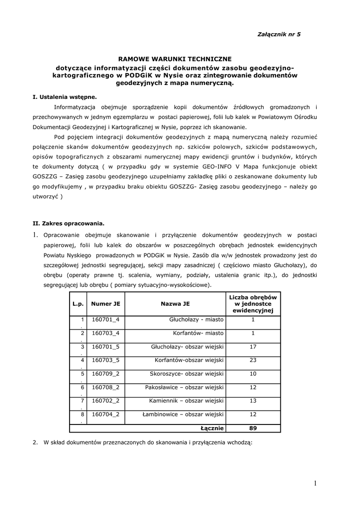 Załącznik nr 5 RAMOWE WARUNKI TECHNICZNE dotyczące informatyzacji części dokumentów zasobu geodezyjnokartograficznego w PODGiK w Nysie oraz zintegrowanie dokumentów geodezyjnych z mapa numeryczną. I. Ustalenia wstępne. Informatyzacja obejmuje sporządzenie kopii dokumentów źródłowych gromadzonych i przechowywanych w jednym egzemplarzu w postaci papierowej, folii lub kalek w Powiatowym Ośrodku Dokumentacji Geodezyjnej i Kartograficznej w Nysie, poprzez ich skanowanie. Pod pojęciem integracji dokumentów geodezyjnych z mapą numeryczną należy rozumieć połączenie skanów dokumentów geodezyjnych np. szkiców polowych, szkiców podstawowych, opisów topograficznych z obszarami numerycznej mapy ewidencji gruntów i budynków, których te dokumenty dotyczą ( w przypadku gdy w systemie GEO-INFO V Mapa funkcjonuje obiekt GOSZZG – Zasięg zasobu geodezyjnego uzupełniamy zakładkę pliki o zeskanowane dokumenty lub go modyfikujemy , w przypadku braku obiektu GOSZZG- Zasięg zasobu geodezyjnego – należy go utworzyć ) II. Zakres opracowania. 1. Opracowanie obejmuje skanowanie i przyłączenie dokumentów geodezyjnych w postaci papierowej, folii lub kalek do obszarów w poszczególnych obrębach jednostek ewidencyjnych Powiatu Nyskiego prowadzonych w PODGiK w Nysie. Zasób dla w/w jednostek prowadzony jest do szczegółowej jednostki segregującej, sekcji mapy zasadniczej ( częściowo miasto Głuchołazy), do obrębu (operaty prawne tj. scalenia, wymiany, podziały, ustalenia granic itp.), do jednostki segregującej lub obrębu ( pomiary sytuacyjno-wysokościowe). 2. Liczba obrębów w jednostce ewidencyjnej L.p. Numer JE Nazwa JE 1 . 2 . 3 . 4 . 5 . 6 . 7 . 8 . 160701_4 Głuchołazy - miasto 1 160703_4 Korfantów- miasto 1 160701_5 Głuchołazy- obszar wiejski 17 160703_5 Korfantów-obszar wiejski 23 160709_2 Skoroszyce- obszar wiejski 10 160708_2 Pakosławice – obszar wiejski 12 160702_2 Kamiennik – obszar wiejski 13 160704_2 Łambinowice – obszar wiejski 12 Łącznie 89 W skład dokumentów przeznaczonych do skanowania i przyłączenia wchodzą: 1 Rodzaj dokumentu szkice polowe z pomiaru :stanu władania ( ustalenia granic , podziały nieruchomości, scalenia, wymiany), powykonawczego budynków ,zmiany sposobu użytkowania, sytuacyjnego budynków wraz ze współrzędnymi mapy przeglądowe przebiegu osnowy poziomej i wysokościowej dokumentacja związana z ustaleniem stanu prawnego nieruchomości m.in. postanowienia, akty ugody i decyzje dotyczące scaleń, wymian, rozgraniczeń i podziałów nieruchomości wraz z załącznikami , protokoły graniczne , zwrotne poświadczenia odbioru ,obliczenia współrzędnych punktów granicznych wraz z wykazami współrzędnych Pierworysy map ewidencyjnych i zarysy pomiarowe III. Dane wejściowe do opracowania. 1. Dokumenty źródłowe: dokumentacja geodezyjno-kartograficzna (operaty pomiarowe, mapy przeglądowe, pierworysy map ewidencyjnych, zarysy pomiarowe) gromadzona i przechowywana w postaci papierowej, folii lub kalek w Powiatowym Ośrodku Dokumentacji Geodezyjnej i Kartograficznej w Nysie 2. Dane z GEO-INFO V Mapa wyd. 10.1.3.0b . 3. Analogowa mapa ewidencji gruntów i budynków opracowywanego obszaru. 4. Analogowy i komputerowy zbiór danych z zakresu osnów geodezyjnych. 5. Dzienniki biegunowe i tachimetryczne oraz wykazy współrzędnych. Uwaga! Powyższe dane po wykorzystaniu zostaną zwrócone Zamawiającemu, a powstałe na sprzęcie wykonawcy ich kopie mają zostać skasowane. IV. Technologia wykonania zamówienia. 1. Przedmiot zamówienia obejmuje wykonanie numerycznych kopii poprzez skanowanie przekazanych dokumentów źródłowych gromadzonych i przechowywanych w postaci papierowej, folii lub kalek w Powiatowym Ośrodku Dokumentacji Geodezyjnej i Kartograficznej w Nysie. Poniższa tabela przedstawia sugerowane parametry skanowania ( odstępstwo od przedstawionych poniżej parametrów skanowania jest dopuszczalne w szczególnych przypadkach uwarunkowanych jakością dokumentów przeznaczonych do skanowania po każdorazowym uzgodnieniu tego faktu z Zamawiającym) Rozdzielczość Parametry skanowania Głębia kolorów szkice polowe z pomiaru :stanu władania ( ustalenia granic , podziały nieruchomości, scalenia, wymiany), powykonawczego budynków , klasyfikacyjnego, zmiany sposobu użytkowania, sytuacyjnego budynków wraz ze współrzędnymi uwaga: dotyczy szkiców na których kolor odgrywa istotną rolę, dla pozostałych dokumentów parametry z pozycji dotyczących skanów czarno-białych 300dpi 8-bit, 256 kolorów mapy przeglądowe przebiegu osnowy poziomej i wysokościowej 400dpi 1-bit, czarno-biały 300dpi 8-bit, 256 kolorów Rodzaj dokumentu dokumentacja związana z ustaleniem stanu prawnego nieruchomości m.in. postanowienia, akty ugody i decyzje dotyczące scaleń, wymian, klasyfikacji, rozgraniczeń i podziałów nieruchomości Format pliku TIFF /kompresja LZW lub Packbits / TIFF /kompresja LZW lub Packbits / TIFF /kompresja LZW lub Packbits / 2 wraz z załącznikami , protokoły graniczne , zwrotne poświadczenia odbioru , obliczenia powierzchni działek i współrzędnych punktów granicznych wraz z wykazami współrzędnych uwaga: dotyczy szkiców na których kolor odgrywa istotną rolę, dla pozostałych dokumentów parametry z pozycji dotyczących skanów czarno-białych Pierworysy map ewidencyjnych i zarysy pomiarowe uwaga: dotyczy szkiców na których kolor odgrywa istotną rolę,dla pozostałych dokumentów parametry z pozycji dotyczących skanów czarno-białych 300dpi 8-bit, 256 kolorów TIFF /kompresja LZW lub Packbits / 2. Praca będzie wykonywana w dwóch etapach: • I etap skanowanie dokumentów • II etap wprowadzenie w/w dokumentów do systemu informatycznego. 3. Udostępnienie materiałów, będzie następowało na bieżąco – każdorazowe pobranie i zwrot dokumentów powinno być kwitowane protokołem przekazania. 4. Przekazane tomy dokumentów, należy zwrócić nie rozerwane, nie