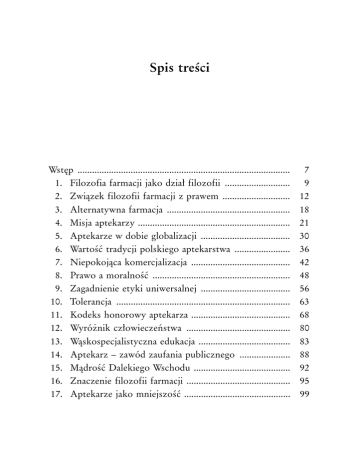 Spis treści Wstęp . ....................................................................................... 1. Filozofia farmacji jako dział filozofii ............................ 2.Związek filozofii farmacji z prawem . ........................... 3. Alternatywna farmacja .................................................... 4. Misja aptekarzy ............................................................... 5. Aptekarze w dobie globalizacji . .................................... 6. Wartość tradycji polskiego aptekarstwa ........................ 7. Niepokojąca komercjalizacja . ........................................ 8. Prawo a moralność . ........................................................ 9. Zagadnienie etyki uniwersalnej ...................................... 10. Tolerancja ......................................................................... 11. Kodeks honorowy aptekarza ......................................... 12. Wyróżnik człowieczeństwa ............................................ 13. Wąskospecjalistyczna edukacja ...................................... 14. Aptekarz – zawód zaufania publicznego ...................... 15. Mądrość Dalekiego Wschodu . ....................................... 16. Znaczenie filozofii farmacji . .......................................... 17. Aptekarze jako mniejszość ............................................ 7 9 12 18 21 30 36 42 48 56 63 68 80 83 88 92 95 99 Wstęp Ż ycie i zarazem zdrowie człowieka, to jedna z wartości, którą można uznać za niemal uniwersalną. Prawie każdy – wyłączając na przykład terrorystów, czy ludzi załamanych psychicznie, ogarniętych depresją – pragnie być zdrowy i długo żyć. Stąd płynie szczególne znaczenie, a nawet posłannictwo lekarzy i farmaceutów, jak również pielęgniarek. Choroby należy traktować jako składnik ludzkiego życia. Każdy z nas jest, lub może stać się pacjentem. Jednakże należy pamiętać o słowach lekarza i zarazem filozofa Juliana Aleksandrowicza: nie ma nieuleczalnych chorób. A także słowa tego uczonego, że zdrowie ma dla pojedynczego człowieka taką samą wartość, co pokój dla ludzkości. Płyną stąd powinności wobec samego siebie i wobec innych. By móc przezwyciężać choroby, trzeba brać pod uwagę, że stanowimy jedność psychofizyczną. Wobec tego, wielkie znaczenie ma wiara w wyzdrowienie. Julian Aleksandrowicz sformułował XI przykazanie: „Nie trać nadziei” i uznał je za podstawowe. Każdy bywa pacjentem. zarys filozofii farmacji Znaczenie porównywalne z nadzieją ma odnalezienie w sobie pasji życiowej, a więc czynienie czegoś znaczącego także dla innych. Prawidłowa hierarchia wartości, w tym dominacja ideałów jako kierunkowskazów, przynosi poczucie sensu życia oraz wewnętrznej harmonii i zarazem zdrowia. Warto też uświadomić sobie, że niezawodne jest poczucie radości płynącej z faktu własnego istnienia i że sprzyja ono zdrowiu. Nie tylko medycyna, ale także farmacja odcięta od korzeni filozoficznych nie pełni właściwej dla siebie roli. Obserwowane w naszych czasach częste postawy konformistyczne – a więc odchodzenie od własnych przekonań ze względu na spodziewane korzyści – nie służą zdrowiu. Pragnę wyjaśnić we wstępie, że zainicjowałam filozofię farmacji artykułami publikowanymi w „Czasopiśmie Aptekarskim” w latach 2001–2003. Byłam zapraszana jako konsultant w pracach nad nowelizacją Kodeksu Etyki Aptekarza w końcu lat dziewięćdziesiątych. Z inicjatywy Prezesa Naczelnej Rady Aptekarskiej wygłosiłam w 2002 roku wykład dla członków samorządu aptekarskiego na temat problemów aksjologicznych zawodu aptekarza. W senacie RP zabierałam głos w obronie aptekarzy. Byłam przewodniczącą Komitetu Międzynarodowej Nagrody Naukowej Aptekarzy, Producentów, Dystrybutorów, Hurtowni i „Czasopisma Aptekarskiego”.
