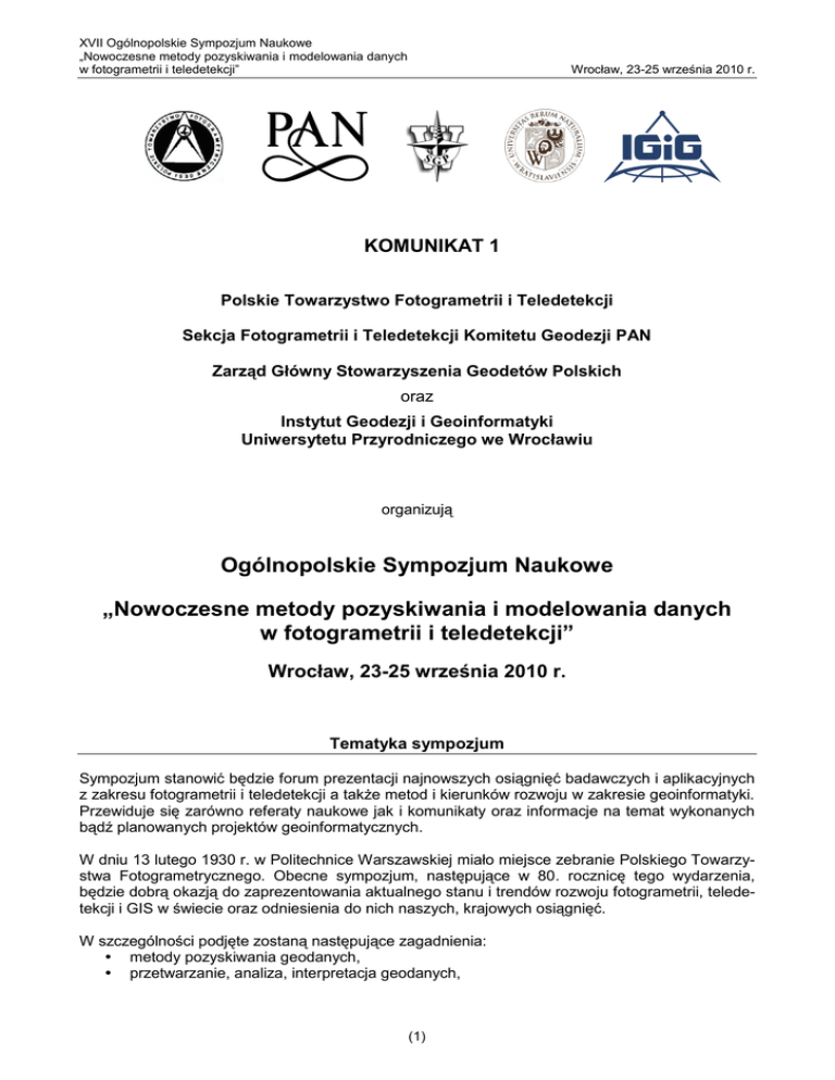 XVII Ogólnopolskie Sympozjum Naukowe „Nowoczesne metody pozyskiwania i modelowania danych w fotogrametrii i teledetekcji” Wrocław, 23-25 września 2010 r. KOMUNIKAT 1 Polskie Towarzystwo Fotogrametrii i Teledetekcji Sekcja Fotogrametrii i Teledetekcji Komitetu Geodezji PAN Zarząd Główny Stowarzyszenia Geodetów Polskich oraz Instytut Geodezji i Geoinformatyki Uniwersytetu Przyrodniczego we Wrocławiu organizują Ogólnopolskie Sympozjum Naukowe „Nowoczesne metody pozyskiwania i modelowania danych w fotogrametrii i teledetekcji” Wrocław, 23-25 września 2010 r. Tematyka sympozjum Sympozjum stanowić będzie forum prezentacji najnowszych osiągnięć badawczych i aplikacyjnych z zakresu fotogrametrii i teledetekcji a także metod i kierunków rozwoju w zakresie geoinformatyki. Przewiduje się zarówno referaty naukowe jak i komunikaty oraz informacje na temat wykonanych bądź planowanych projektów geoinformatycznych. W dniu 13 lutego 1930 r. w Politechnice Warszawskiej miało miejsce zebranie Polskiego Towarzystwa Fotogrametrycznego. Obecne sympozjum, następujące w 80. rocznicę tego wydarzenia, będzie dobrą okazją do zaprezentowania aktualnego stanu i trendów rozwoju fotogrametrii, teledetekcji i GIS w świecie oraz odniesienia do nich naszych, krajowych osiągnięć. W szczególności podjęte zostaną następujące zagadnienia: metody pozyskiwania geodanych, przetwarzanie, analiza, interpretacja geodanych, (1) XVII Ogólnopolskie Sympozjum Naukowe „Nowoczesne metody pozyskiwania i modelowania danych w fotogrametrii i teledetekcji” Wrocław, 23-25 września 2010 r. integracja i wizualizacja geoinformacji, integracja danych z różnych sensorów, tendencje rozwojowe GIS 3D, monitorowanie środowiska, kształcenie w zakresie geoinformatyki, jubileusz 80-lecia Polskiego Towarzystwa Fotogrametrycznego. Komitet Naukowy Prof. dr hab. Aleksandra Bujakiewicz Dr hab. inż. Adam Linsenbarth, prof. WSGK Dr hab. inż. Krystian Pyka, prof. AGH Prof. dr hab. Józef Jachimski Dr hab. inż. Andrzej Borkowski, prof. UP Dr hab. inż. Zdzisław Kurczyński Dr inż. Piotr Sawicki Przewodnicząca Polskiego Towarzystwa Fotogrametrii i Teledetekcji oraz Sekcji FiT Komitetu Geodezji PAN W-ce Przewodniczący PTFiT W-ce Przewodniczący PTFiT Przewodniczący Komisji Geoinformatyki PAU Dyrektor Instytutu Geodezji i Geoinformatyki Uniwersytetu Przyrodniczego we Wrocławiu Redaktor Naczelny Archiwum Fotogrametrii, Kartografii i Teledetekcji, Sekretarz naukowy PTFiT Sekretarz naukowy PTFiT Komitet Organizacyjny Dr hab. inż. Andrzej Borkowski, prof. UP Mgr inż. Małgorzata Jarząbek-Rychard Mgr inż. Grzegorz Jóźków Mgr Wojciech Dach Mgr Stanisław Rogowski Anna Jarmułowicz Dyrektor Instytutu Geodezji i Geoinformatyki Uniwersytetu Przyrodniczego we Wrocławiu IGiG UP we Wrocławiu IGiG UP we Wrocławiu IGiG UP we Wrocławiu IGiG UP we Wrocławiu ZG SGP Terminy 15 maja 2010 r. 1 czerwca 2010 r. 15 czerwca 2010 r. 15 sierpnia 2010 r. zgłoszenie uczestnictwa w Sympozjum, podanie tytułu referatu. dokonanie wpłaty za udział w Sympozjum. nadesłanie rozszerzonego (min. 250 słów) streszczenia referatu. pełny tekst referatu (ze streszczeniem w języku angielskim), przewidzianego do opublikowania w wersji elektronicznej. Informacje dla Autorów referatów Przed Sympozjum zostanie przygotowane wydawnictwo z wydrukowanymi streszczeniami oraz przygotowana płyta CD-ROM z referatami przed recenzją wydawniczą, w treści i formie nadesłanej przez Autorów. Szczegółowe informacja wydawnicze dla Autorów referatów przesłane zostaną w kolejnym komunikacie. (2) XVII Ogólnopolskie Sympozjum Naukowe „Nowoczesne metody pozyskiwania i modelowania danych w fotogrametrii i teledetekcji” Wrocław, 23-25 września 2010 r. Zgłoszone prace zostaną przekazane do recenzji. Po ostatecznej kwalifikacji i ewentualnych korektach zostaną opublikowane w kolejnym tomie cyklicznego wydawnictwa “Archiwum Fotogrametrii, Kartografii i Teledetekcji” (4 punkty wg aktualnej listy czasopism punktowanych MNiSzW). Miejsce Sympozjum Zakwaterowanie: Obrady: Hotel “Wieniawa” ul. Gajowicka 130 53-322 Wrocław tel.+48 71 7809000 Uniwersytet Przyrodniczy we Wrocławiu Centrum Naukowo Dydaktyczne Plac Grunwaldzki 24a 50-375 Wrocław Zgłoszenie Zgłoszenie uczestnictwa prosimy nadsyłać do dnia 15 maja 2010 r. na adres e-mail: [email protected] – temat “Sympozjum PTFiT”, listownie lub telefonicznie: Zarząd Główny SGP, ul. Czackiego 3/5, 00-043 Warszawa tel./fax +22 8268751. Opłata Opłata za uczestnictwo w Sympozjum wynosi 850,00 zł (dla doktorantów i studentów: 500,00 zł) i obejmuje: pełne koszty pobytu w Hotelu “Wieniawa” w dniach 23-25 września 2010 r., materiały naukowe z Sympozjum. Wpłatę należy dokonać do dnia 1 czerwca 2010 r. na konto ZG SGP: Bank MILLENNIUM SA. konto: 79 1160 2202 0000 0000 5515 6880 z dopiskiem: “Sympozjum PTFiT” Kontakt z Komitetem Organizacyjnym Streszczenia referatów Referaty Zgłoszenia uczestnictwa Opłaty mgr inż. Małgorzata Jarząbek-Rychard e-mail: [email protected] IGiG UP we Wrocławiu e-mail: [email protected] Anna Jarmułowicz ZG SGP, ul. Czackiego 3/5, 00-043 Warszawa e-mail: [email protected] tel. + 22 826 87 51 (3)