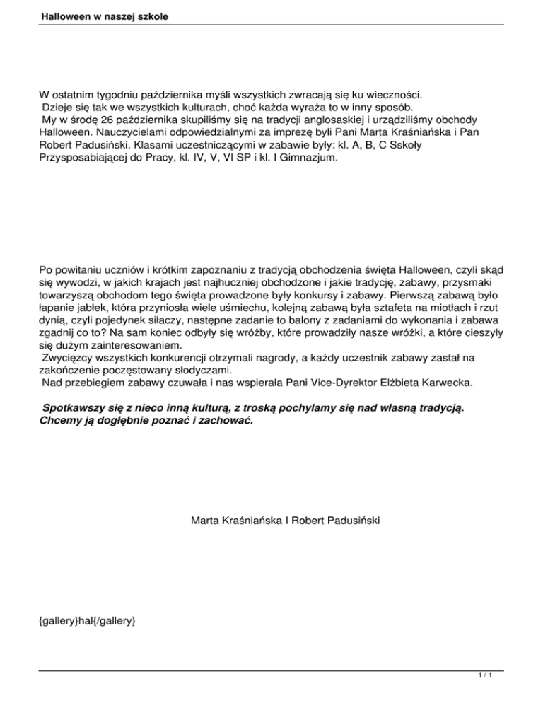 Halloween. Nauczycielami odpowiedzialnymi za imprezę byli Pani Marta Kraśniańska i Pan