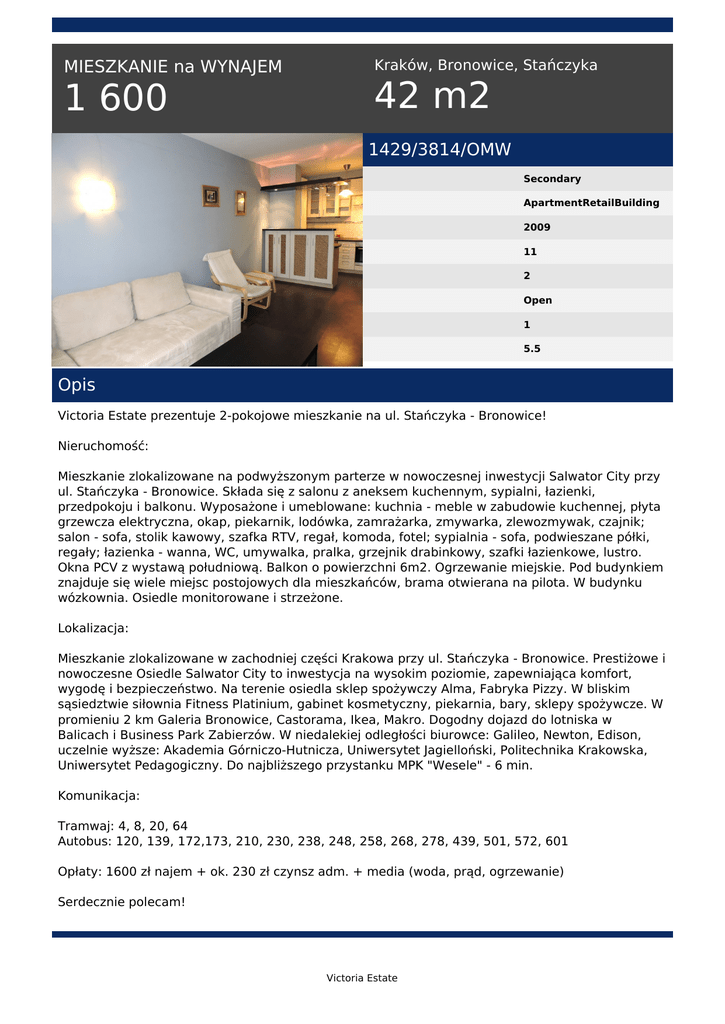 MIESZKANIE na WYNAJEM 1 600 Kraków, Bronowice, Stańczyka 42 m2 1429/3814/OMW Secondary ApartmentRetailBuilding 2009 11 2 Open 1 5.5 Opis Victoria Estate prezentuje 2-pokojowe mieszkanie na ul. Stańczyka - Bronowice! Nieruchomość: Mieszkanie zlokalizowane na podwyższonym parterze w nowoczesnej inwestycji Salwator City przy ul. Stańczyka - Bronowice. Składa się z salonu z aneksem kuchennym, sypialni, łazienki, przedpokoju i balkonu. Wyposażone i umeblowane: kuchnia - meble w zabudowie kuchennej, płyta grzewcza elektryczna, okap, piekarnik, lodówka, zamrażarka, zmywarka, zlewozmywak, czajnik; salon - sofa, stolik kawowy, szafka RTV, regał, komoda, fotel; sypialnia - sofa, podwieszane półki, regały; łazienka - wanna, WC, umywalka, pralka, grzejnik drabinkowy, szafki łazienkowe, lustro. Okna PCV z wystawą południową. Balkon o powierzchni 6m2. Ogrzewanie miejskie. Pod budynkiem znajduje się wiele miejsc postojowych dla mieszkańców, brama otwierana na pilota. W budynku wózkownia. Osiedle monitorowane i strzeżone. Lokalizacja: Mieszkanie zlokalizowane w zachodniej części Krakowa przy ul. Stańczyka - Bronowice. Prestiżowe i nowoczesne Osiedle Salwator City to inwestycja na wysokim poziomie, zapewniająca komfort, wygodę i bezpieczeństwo. Na terenie osiedla sklep spożywczy Alma, Fabryka Pizzy. W bliskim sąsiedztwie siłownia Fitness Platinium, gabinet kosmetyczny, piekarnia, bary, sklepy spożywcze. W promieniu 2 km Galeria Bronowice, Castorama, Ikea, Makro. Dogodny dojazd do lotniska w Balicach i Business Park Zabierzów. W niedalekiej odległości biurowce: Galileo, Newton, Edison, uczelnie wyższe: Akademia Górniczo-Hutnicza, Uniwersytet Jagielloński, Politechnika Krakowska, Uniwersytet Pedagogiczny. Do najbliższego przystanku MPK "Wesele" - 6 min. Komunikacja: Tramwaj: 4, 8, 20, 64 Autobus: 120, 139, 172,173, 210, 230, 238, 248, 258, 268, 278, 439, 501, 572, 601 Opłaty: 1600 zł najem + ok. 230 zł czynsz adm. + media (woda, prąd, ogrzewanie) Serdecznie polecam! Victoria Estate Paulina Zajdel tel. +48 789 453 049 email: [email protected] Victoria Estate Powered by TCPDF (www.tcpdf.org)