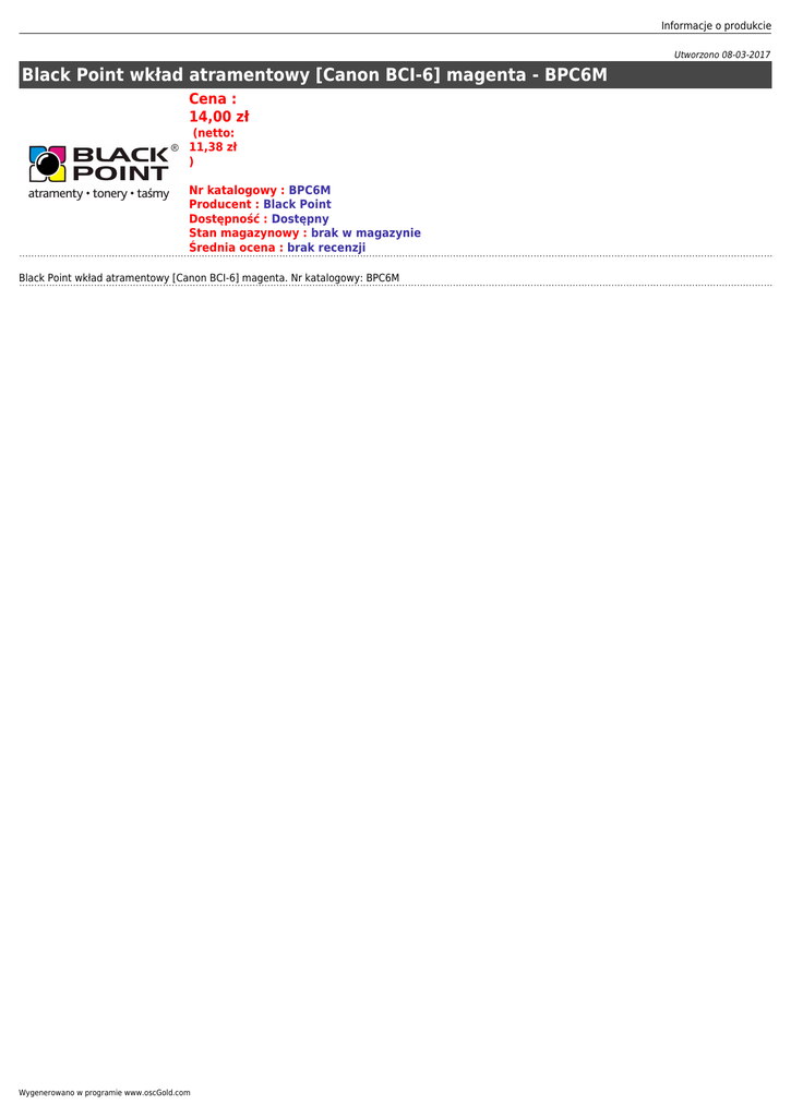 Informacje o produkcie Utworzono 08-03-2017 Black Point wkład atramentowy [Canon BCI-6] magenta - BPC6M Cena : 14,00 zł (netto: 11,38 zł ) Nr katalogowy : BPC6M Producent : Black Point Dostępność : Dostępny Stan magazynowy : brak w magazynie Średnia ocena : brak recenzji Black Point wkład atramentowy [Canon BCI-6] magenta. Nr katalogowy: BPC6M Wygenerowano w programie www.oscGold.com
