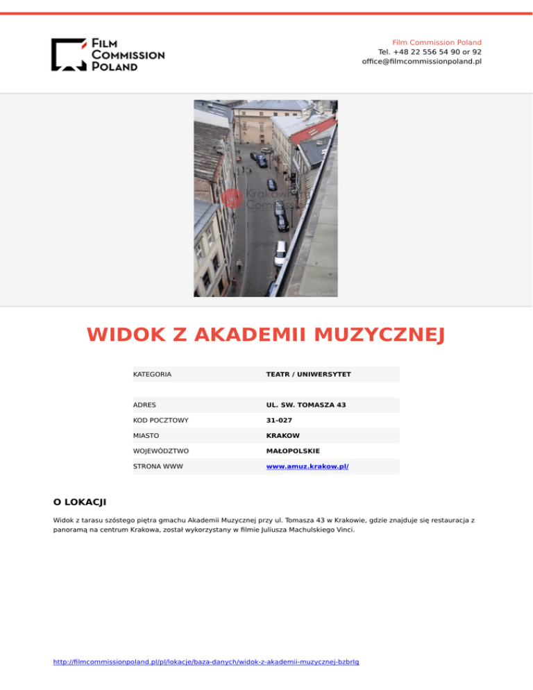Film Commission Poland Tel. +48 22 556 54 90 or 92 office@filmcommissionpoland.pl WIDOK Z AKADEMII MUZYCZNEJ KATEGORIA TEATR / UNIWERSYTET ADRES UL. SW. TOMASZA 43 KOD POCZTOWY 31-027 MIASTO KRAKOW WOJEWÓDZTWO MAŁOPOLSKIE STRONA WWW www.amuz.krakow.pl/ O LOKACJI Widok z tarasu szóstego piętra gmachu Akademii Muzycznej przy ul. Tomasza 43 w Krakowie, gdzie znajduje się restauracja z panoramą na centrum Krakowa, został wykorzystany w filmie Juliusza Machulskiego Vinci. http://filmcommissionpoland.pl/pl/lokacje/baza-danych/widok-z-akademii-muzycznej-bzbrIg