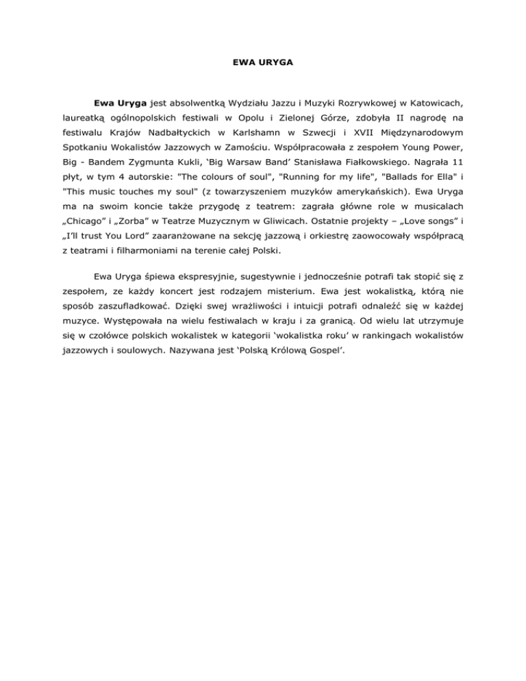 EWA URYGA Ewa Uryga jest absolwentką Wydziału Jazzu i Muzyki Rozrywkowej w Katowicach, laureatką ogólnopolskich festiwali w Opolu i Zielonej Górze, zdobyła II nagrodę na festiwalu Krajów Nadbałtyckich w Karlshamn w Szwecji i XVII Międzynarodowym Spotkaniu Wokalistów Jazzowych w Zamościu. Współpracowała z zespołem Young Power, Big - Bandem Zygmunta Kukli, ‘Big Warsaw Band’ Stanisława Fiałkowskiego. Nagrała 11 płyt, w tym 4 autorskie: "The colours of soul", "Running for my life", "Ballads for Ella" i "This music touches my soul" (z towarzyszeniem muzyków amerykańskich). Ewa Uryga ma na swoim koncie takŜe przygodę z teatrem: zagrała główne role w musicalach „Chicago” i „Zorba” w Teatrze Muzycznym w Gliwicach. Ostatnie projekty – „Love songs” i „I’ll trust You Lord” zaaranŜowane na sekcję jazzową i orkiestrę zaowocowały współpracą z teatrami i filharmoniami na terenie całej Polski. Ewa Uryga śpiewa ekspresyjnie, sugestywnie i jednocześnie potrafi tak stopić się z zespołem, ze kaŜdy koncert jest rodzajem misterium. Ewa jest wokalistką, którą nie sposób zaszufladkować. Dzięki swej wraŜliwości i intuicji potrafi odnaleźć się w kaŜdej muzyce. Występowała na wielu festiwalach w kraju i za granicą. Od wielu lat utrzymuje się w czołówce polskich wokalistek w kategorii ‘wokalistka roku’ w rankingach wokalistów jazzowych i soulowych. Nazywana jest ‘Polską Królową Gospel’.