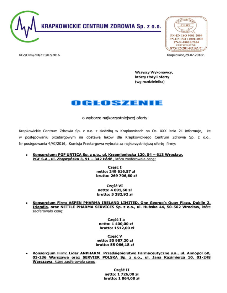 KCZ/ORG/ZM/211/07/2016 Krapkowice,29.07.2016r. Wszyscy Wykonawcy, którzy złożyli oferty (wg rozdzielnika) o wyborze najkorzystniejszej oferty Krapkowickie Centrum Zdrowia Sp. z o.o. z siedzibą w Krapkowicach na Os. XXX lecia 21 informuje, że w postępowaniu przetargowym na dostawę leków dla Krapkowickiego Centrum Zdrowia Sp. z o.o., Nr postępowania 4/VI/2016, Komisja Przetargowa wybrała za najkorzystniejszą ofertę firmy: Konsorcjum: PGF URTICA Sp. z o.o., ul. Krzemieniecka 120, 54 – 613 Wrocław, PGF S.A., ul. Zbąszyńska 3, 91 – 342 Łódź , która zaoferowała cenę: Część I netto: 249 616,57 zł brutto: 269 706,60 zł Część VI netto: 4 891,60 zł brutto: 5 282,92 zł Konsorcjum Firm: ASPEN PHARMA IRELAND LIMITED, One George’s Quay Plaza, Dublin 2, Irlandia, oraz NETTLE PHARMA SERVICES Sp. z o.o., ul. Hubska 44, 50-502 Wrocław, które zaoferowało cenę: Część I a netto: 1 400,00 zł brutto: 1512,00 zł Część V netto: 50 987,20 zł brutto: 55 066,18 zł Konsorcjum Firm: Lider ANPHARM Przedsiębiorstwo Farmaceutyczne s.a., ul. Annopol 6B, 03-236 Warszawa oraz SERVIER POLSKA Sp. z o.o., ul. Jana Kazimierza 10, 01-248 Warszawa, które zaoferowało cenę: Część II netto: 1 726,00 zł brutto: 1 864,08 zł SALUS INTERNATIONAL Sp. z o.o., ul. Pułaskiego 9, 40-273 Katowice, która zaoferowała cenę: Część III netto: 4 303,20 zł brutto: 4 627,78 zł Sanofi-Aventis Sp. z o.o., ul. Bonifraterska 17, 00 – 203 Warszawa, która zaoferowała cenę: Część IV netto: 9 962,85 zł brutto: 10 759,88 zł Wybrane oferty posiadały najkorzystniejsze ceny otrzymując maksymalną ilość punktów po zastosowaniu wzoru dla kryterium cena wg wzoru z SIWZ, które były kryterium w niniejszym postępowaniu. Ponadto oferty spełniały pozostałe wymagania przewidziane dla złożenia oferty. Streszczenie oceny i porównania złożonych ofert ww. postępowaniu Część zamówienia Numer oferty Nazwa Wykonawcy Liczba pkt w kryterium cena 2 Konsorcjum: PGF Urtica Sp. z o.o., PGF S.A. 1 FARMACOL S.A. Ia 6 97,00 II 3 III IV V 5 4 6 VI 2 Konsorcjum Firm: ASPEN PHARMA IRELAND LIMITED, NETTLE PHARMA SERVICES Sp. z o.o. Konsorcjum Firm: Lider ANPHARM Przedsiębiorstwo Farmaceutyczne s.a. SERVIER POLSKA Sp. z o.o. SALUS INTERNATIONAL Sp. z o.o. Sanofi - Aventis Sp. z o.o. Konsorcjum Firm: ASPEN PHARMA IRELAND LIMITED, NETTLE PHARMA SERVICES Sp. z o.o. Konsorcjum: PGF Urtica Sp. z o.o., PGF S.A. I 100,00 Liczba pkt w kryterium Termin dostawy 3 100,00 95,57 3 98,57 3 100,00 3 100,00 97,00 97,00 97,00 3 3 100,00 100,00 3 100,00 97,00 3 100,00 97,00 Razem Działając na podstawie art. 92 ust.1 pkt. 2 Prawa zamówień publicznych Zamawiający zawiadamia, że w prowadzonym postępowaniu nie została odrzucona żadna oferta. Działając na podstawie art. 92 ust. 1 pkt. 3 Prawa zamówień publicznych Zamawiający zawiadamia, że w prowadzonym postępowaniu nie wykluczono żadnego Wykonawcy. Działając na podstawie art. 92 ust. 1 pkt. 4 Prawa zamówień publicznych Zamawiający informuje, że podpisanie umowy z wyłonionymi Wykonawcami nastąpi zgodnie z art. 94 ust. 1 pkt. 2. Z poważaniem Prezes Zarządu Marcin Misiewicz Otrzymują: 1. PGF Urtica Sp. z o.o., PGF S.A., ul. Krzemieniecka 120, 54 – 613 Wrocław 2. Sanofi Aventis Sp. z o.o., ul. Bonifraterska 17, 00 – 203 Warszawa 3. FARMACOL S.A., ul. Rzepakowa 2, 40-541 Katowice 4. Konsorcjum Firm: Lider ANPHARM Przedsiębiorstwo Farmaceutyczne s.a. SERVIER POLSKA Sp. z o.o., ul. Annopol 6B, 03-236 Warszawa 5. SALUS INTERNATIONAL Sp. z o.o., ul. Pułaskiego 9, 40-273 Katowice 6. Konsorcjum Firm: ASPEN PHARMA IRELAND LIMITED, NETTLE PHARMA SERVICES Sp. z o.o., ul. Hubska 44, 50-502 Wrocław