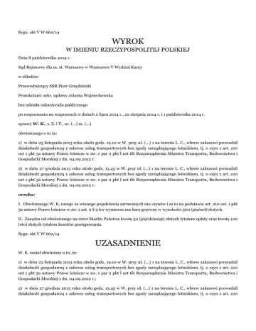 Sygn. akt V W 662/14 WYROK W IMIENIU RZECZYPOSPOLITEJ POLSKIEJ Dnia 8 października 2014 r. Sąd Rejonowy dla m. st. Warszawy w Warszawie V Wydział Karny w składzie: Przewodniczący SSR Piotr Grzędziński Protokolant: sekr. sądowy Jolanta Wojciechowska bez udziału oskarżyciela publicznego po rozpoznaniu na rozprawach w dniach 2 lipca 2014 r., 22 sierpnia 2014 r. i 1 października 2014 r. sprawy W. K., s. Z. i T., ur. (...) m. (...) obwinionego o to że: 1) w dniu 23 listopada 2013 roku około godz. 19.10 w W. przy ul. (...) 1 na terenie L. C., wbrew zakazowi prowadził działalność gospodarczą z zakresu usług transportowych bez zgody zarządzającego lotniskiem, tj. o czyn z art. 210 ust 1 pkt 5a ustawy Prawo lotnicze w zw. z par 2 pkt l ust 6b Rozporządzenia Ministra Transportu, Budownictwa i Gospodarki Morskiej z dn. 04.09.2012 r. 2) w dniu 27 grudnia 2013 roku około godz. 13.45 w W. przy ul. (...) 1 na terenie L. C., wbrew zakazowi prowadził działalność gospodarczą z zakresu usług transportowych bez zgody zarządzającego lotniskiem, tj. o czyn z art. 210 ust 1 pkt 5a ustawy Prawo lotnicze w zw. z par 2 pkt l ust 6b Rozporządzenia Ministra Transportu, Budownictwa i Gospodarki Morskiej z dn. 04.09.2012 r. orzeka: I. Obwinionego W. K. uznaje za winnego popełnienia zarzucanych mu czynów i za to na podstawie art. 210 ust. 1 pkt 5a ustawy Prawo lotnicze w zw. z art. 9 § 2 kw wymierza mu karę grzywny w wysokości 500 (pięćset) złotych. II. Zasądza od obwinionego na rzecz Skarbu Państwa kwotę 50 (pięćdziesiąt) złotych tytułem opłaty oraz kwotę 100 (sto) złotych tytułem kosztów postępowania. Sygn. akt V W 662/14 UZASADNIENIE W. K. został obwiniony o to, że: 1) w dniu 23 listopada 2013 roku około godz. 19.10 w W. przy ul. (...) 1 na terenie L. C., wbrew zakazowi prowadził działalność gospodarczą z zakresu usług transportowych bez zgody zarządzającego lotniskiem, tj. o czyn z art. 210 ust 1 pkt 5a ustawy Prawo lotnicze w zw. z par 2 pkt l ust 6b Rozporządzenia Ministra Transportu, Budownictwa i Gospodarki Morskiej z dn. 04.09.2012 r.; 2) w dniu 27 grudnia 2013 roku około godz. 13.45 w W. przy ul. (...) 1 na terenie L. C., wbrew zakazowi prowadził działalność gospodarczą z zakresu usług transportowych bez zgody zarządzającego lotniskiem, tj. o czyn z art. 210 ust 1 pkt 5a ustawy Prawo lotnicze w zw. z par 2 pkt l ust 6b Rozporządzenia Ministra Transportu, Budownictwa i Gospodarki Morskiej z dn. 04.09.2012 r. Na podstawie zgromadzonego i ujawnionego w toku rozprawy głównej materiału dowodowego Sąd ustalił następujący stan faktyczny: W. K. z zawodu jest taksówkarzem. W dniu 23 listopada 2013 roku około godz. 19.10 w związku z prowadzoną działalnością gospodarczą przebywał on na terenie (...) im. (...) w W., gdzie zaproponował napotkanemu mężczyźnie – obywatelowi R.: D. B. skorzystanie z wykonywanych przez niego usług transportowych. Następnie udał się z w/w mężczyzną w kierunku parkingu wielopoziomowego. Zachowanie W. K. zaobserwował pracownik Służby Ochrony L. M. C., który udał się za w/w mężczyznami, a następnie zatrzymał taksówkarza. Z uwagi na zachowanie W. K., który podczas podjętej przez niego interwencji zachowywał się w ocenie w/w pracownika niekulturalnie oraz oddalił się wraz z pasażerem z miejsca zdarzenia w kierunku parkingu wielopoziomowego znajdującego się na lotnisku, M. C. wezwał funkcjonariuszy Policji, którzy znajdowali się na podjeździe przed halą przylotów (...) (...) W związku z tym, iż W. K. swoją działalność prowadził bez zgody zarządzającego (...) im. (...) w W. Przedsiębiorstwa Państwowego (...), został na niego nałożony mandat karny kredytowany w wysokości 100 złotych. W. K. skorzystał z przysługującego mu prawa i nie przyjął mandatu. W dniu 27 grudnia 2013 roku około godz. 13.45 W. K. ponownie przebywał na terenie (...) im. (...) w W.. Znajdował się on w grupie innych taksówkarzy i ponownie proponował napotkanym pasażerom skorzystanie z wykonywanych przez niego usług transportowych. Uwagę na niewłaściwe zachowanie W. K. oraz innych przebywających z nim osób, zwrócił pracownik Służby Ochrony L. J. J., który udał się w kierunku w/w osób, informując jednego z pasażerów, któremu oferowano usługi taksówkowe, iż przed (...) „przyloty” znajduje się postój taksówek rekomendowanych przez L. C.. Od tego momentu W. K. zaczął zachowywać się niewłaściwie wobec J. J., utrudniając mu obserwację pozostałych osób oferujących usługi taksówkowe. Po upływie godziny, gdy J. J. opuścił teren hali przylotów, W. K. zablokował swoim ciałem wejście na teren (...), uniemożliwiając w ten sposób J. J. wykonywanie obowiązków służbowych. Z uwagi na jego zachowanie na miejsce zdarzenia został wezwany patrol Policji. W związku z tym, iż W. K. swoją działalność prowadził bez zgody zarządzającego (...) im. (...) w W. Przedsiębiorstwa Państwowego (...), został na niego nałożony mandat karny kredytowany w wysokości 500 złotych. W. K. skorzystał z przysługującego mu prawa i nie przyjął mandatu. Powyższy stan faktyczny Sąd ustalił na podstawie: częściowych wyjaśnień obwinionego W. K. /k. 46-47, 48-49/, zeznań świadków: M. C. /k. 47-48, 4v/, M. D. /k. 48, 11v/, J. J. /k. 52-53, 28v/, P. S. /k. 53, 21v/, częściowych zeznań świadka R. S. /k. 53-54/, zapisu z płyty CD odtworzonej na rozprawie głównej (k. 49) a także dokumentów w postaci notatek urzędowych /k. 10/. Obwiniony W. K. nie przyznał się do zarzuconych mu czynów. Odnosząc się do pierwszego z zarzutów dotyczącego zdarzenia, które miało miejsce w dniu 23 listopada 2013 roku, zaprzeczył, aby wówczas prowadził on działalność gospodarczą. Jego zdaniem nie można bowiem zaliczyć do prowadzenia działalności gospodarczej tego, iż tego dnia odstąpił on bilet transportu miejskiego i chciał pokazać miejs