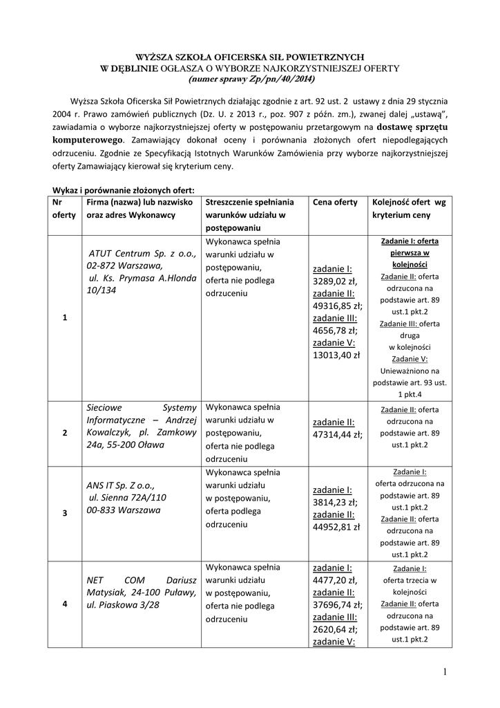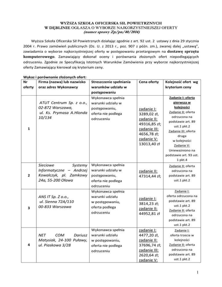 WYŻSZA SZKOŁA OFICERSKA SIŁ POWIETRZNYCH W DĘBLINIE OGŁASZA O WYBORZE NAJKORZYSTNIEJSZEJ OFERTY (numer sprawy Zp/pn/40/2014) Wyższa Szkoła Oficerska Sił Powietrznych działając zgodnie z art. 92 ust. 2 ustawy z dnia 29 stycznia 2004 r. Prawo zamówień publicznych (Dz. U. z 2013 r., poz. 907 z późn. zm.), zwanej dalej „ustawą”, zawiadamia o wyborze najkorzystniejszej oferty w postępowaniu przetargowym na dostawę sprzętu komputerowego. Zamawiający dokonał oceny i porównania złożonych ofert niepodlegających odrzuceniu. Zgodnie ze Specyfikacją Istotnych Warunków Zamówienia przy wyborze najkorzystniejszej oferty Zamawiający kierował się kryterium ceny. Wykaz i porównanie złożonych ofert: Nr Firma (nazwa) lub nazwisko oferty oraz adres Wykonawcy Streszczenie spełniania warunków udziału w postępowaniu Wykonawca spełnia ATUT Centrum Sp. z o.o., warunki udziału w 02-872 Warszawa, postępowaniu, ul. Ks. Prymasa A.Hlonda oferta nie podlega 10/134 odrzuceniu 1 2 3 4 Sieciowe Systemy Informatyczne – Andrzej Kowalczyk, pl. Zamkowy 24a, 55-200 Oława ANS IT Sp. Z o.o., ul. Sienna 72A/110 00-833 Warszawa Wykonawca spełnia warunki udziału w postępowaniu, oferta nie podlega odrzuceniu Wykonawca spełnia warunki udziału w postępowaniu, oferta podlega odrzuceniu Wykonawca spełnia NET COM Dariusz warunki udziału Matysiak, 24-100 Puławy, w postępowaniu, ul. Piaskowa 3/28 oferta nie podlega odrzuceniu Cena oferty zadanie I: 3289,02 zł, zadanie II: 49316,85 zł; zadanie III: 4656,78 zł; zadanie V: 13013,40 zł zadanie II: 47314,44 zł; zadanie I: 3814,23 zł; zadanie II: 44952,81 zł zadanie I: 4477,20 zł, zadanie II: 37696,74 zł; zadanie III: 2620,64 zł; zadanie V: Kolejność ofert wg kryterium ceny Zadanie I: oferta pierwsza w kolejności Zadanie II: oferta odrzucona na podstawie art. 89 ust.1 pkt.2 Zadanie III: oferta druga w kolejności Zadanie V: Unieważniono na podstawie art. 93 ust. 1 pkt.4 Zadanie II: oferta odrzucona na podstawie art. 89 ust.1 pkt.2 Zadanie I: oferta odrzucona na podstawie art. 89 ust.1 pkt.2 Zadanie II: oferta odrzucona na podstawie art. 89 ust.1 pkt.2 Zadanie I: oferta trzecia w kolejności Zadanie II: oferta odrzucona na podstawie art. 89 ust.1 pkt.2 1 2806,40 zł Zadanie III: oferta pierwsza w kolejności Zadanie V: oferta odrzucona na podstawie art. 89 ust.1 pkt.2 Z przedmiotowego postępowania odrzucono: - ofertę firmy ATUT Centrum Sp. z o.o. w zakresie zadania II; - ofertę firmy Sieciowe Systemy Informatyczne Adrzej Kowalczyk w zakresie zadania II; - ofertę firmy ANS IT Sp. z o.o. w zakresie zadania I i II; - ofertę firmy NetCom Dariusz Matysiak w zakresie zadania II i V. W przedmiotowym postępowaniu unieważniono zadania IV – komputery zgodnie z art. 93 ust. 1 pkt. 1; zadania V - akcesoria sieciowe i części elektroniczne zgodnie z art. 93 ust. 1 pkt. 4 oraz zadania VI – akcesoria serwerowe zgodnie z art. 93 ust. 1 pkt. 1 Z przedmiotowego postępowania nie wykluczono żadnego Wykonawcy. Na podstawie oceny spełniania warunków udziału w postępowaniu oraz kryteriów oceny ofert ustalono, iż: - w zakresie zadania I: oferta nr 1 firmy ATUT Centrum Sp. z o.o., 02-872 Warszawa, ul. Ks. Prymasa A.Hlonda 10/134 - w zakresie zadania III: oferta nr 4 firmy NET COM Dariusz Matysiak, 24-100 Puławy, ul. Piaskowa 3/28 odpowiadają wszystkim wymaganiom określonym w ustawie oraz w specyfikacji istotnych warunków zamówienia i została oceniona jako najkorzystniejsza w oparciu o podane w specyfikacji kryterium wyboru. Zamawiający działając zgodnie z art. 92 ust. 1 pkt. 4 ustawy zawiadamia, że umowa w sprawie zamówienia publicznego może być zawarta w terminie nie krótszym niż 5 dni od dnia przekazania zawiadomienia o wyborze najkorzystniejszej oferty. Data opublikowania ogłoszenia: 12 sierpnia 2014 r. KANCLERZ Wyższej Szkoły Oficerskiej Sił Powietrznych mgr Waldemar BIENIEK 2