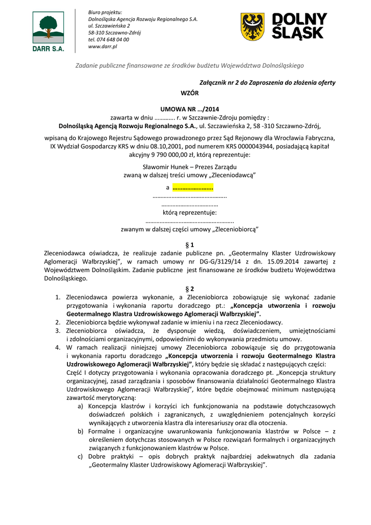 Biuro projektu: Dolnośląska Agencja Rozwoju Regionalnego S.A. ul. Szczawieńska 2 58-310 Szczawno-Zdrój tel. 074 648 04 00 www.darr.pl Zadanie publiczne finansowane ze środków budżetu Województwa Dolnośląskiego Załącznik nr 2 do Zaproszenia do złożenia oferty WZÓR UMOWA NR …/2014 zawarta w dniu …………. r. w Szczawnie-Zdroju pomiędzy : Dolnośląską Agencją Rozwoju Regionalnego S.A., ul. Szczawieńska 2, 58 -310 Szczawno-Zdrój, wpisaną do Krajowego Rejestru Sądowego prowadzonego przez Sąd Rejonowy dla Wrocławia Fabryczna, IX Wydział Gospodarczy KRS w dniu 08.10,2001, pod numerem KRS 0000043944, posiadającą kapitał akcyjny 9 790 000,00 zł, którą reprezentuje: Sławomir Hunek – Prezes Zarządu zwaną w dalszej treści umowy „Zleceniodawcą” a ……………………. ……………………………………….. ……………………………… którą reprezentuje: ……………………………………………….. zwanym w dalszej części umowy „Zleceniobiorcą” §1 Zleceniodawca oświadcza, że realizuje zadanie publiczne pn. „Geotermalny Klaster Uzdrowiskowy Aglomeracji Wałbrzyskiej”, w ramach umowy nr DG-G/3129/14 z dn. 15.09.2014 zawartej z Województwem Dolnośląskim. Zadanie publiczne jest finansowane ze środków budżetu Województwa Dolnośląskiego. 1. 2. 3. 4. §2 Zleceniodawca powierza wykonanie, a Zleceniobiorca zobowiązuje się wykonać zadanie przygotowania i wykonania raportu doradczego pt.: „Koncepcja utworzenia i rozwoju Geotermalnego Klastra Uzdrowiskowego Aglomeracji Wałbrzyskiej”. Zleceniobiorca będzie wykonywał zadanie w imieniu i na rzecz Zleceniodawcy. Zleceniobiorca oświadcza, że dysponuje wiedzą, doświadczeniem, umiejętnościami i zdolnościami organizacyjnymi, odpowiednimi do wykonywania przedmiotu umowy. W ramach realizacji niniejszej umowy Zleceniobiorca zobowiązuje się do przygotowania i wykonania raportu doradczego „Koncepcja utworzenia i rozwoju Geotermalnego Klastra Uzdrowiskowego Aglomeracji Wałbrzyskiej”, który będzie się składać z następujących części: Część I dotyczy przygotowania i wykonania opracowania doradczego pt. „Koncepcja struktury organizacyjnej, zasad zarządzania i sposobów finansowania działalności Geotermalnego Klastra Uzdrowiskowego Aglomeracji Wałbrzyskiej”, które będzie obejmować minimum następującą zawartość merytoryczną: a) Koncepcja klastrów i korzyści ich funkcjonowania na podstawie dotychczasowych doświadczeń polskich i zagranicznych, z uwzględnieniem potencjalnych korzyści wynikających z utworzenia klastra dla interesariuszy oraz dla otoczenia. b) Formalne i organizacyjne uwarunkowania funkcjonowania klastrów w Polsce – z określeniem dotychczas stosowanych w Polsce rozwiązań formalnych i organizacyjnych związanych z funkcjonowaniem klastrów w Polsce. c) Dobre praktyki – opis dobrych praktyk najbardziej adekwatnych dla zadania „Geotermalny Klaster Uzdrowiskowy Aglomeracji Wałbrzyskiej”. Biuro projektu: Dolnośląska Agencja Rozwoju Regionalnego S.A. ul. Szczawieńska 2 58-310 Szczawno-Zdrój tel. 074 648 04 00 www.darr.pl Zadanie publiczne finansowane ze środków budżetu Województwa Dolnośląskiego d) Koncepcja Geotermalnego Klastra Uzdrowiskowego Aglomeracji Wałbrzyskiej: Struktura klastra – lider klastra i jego interesariusza; Zasady zarządzania klastrem – możliwe struktury organizacyjne wraz z rekomendacją optymalnego rozwiązania, podstawowe zasady zarządzania; Źródła finansowania klastra – identyfikacja źródła finansowania, ze szczególnym uwzględnieniem Polityki Spójności UE w okresie 2014 – 2020. oraz Część II dotyczy przygotowania i wykonania opracowania doradczego pt. „Strategia rozwoju działalności Geotermalnego Klastra Uzdrowiskowego Aglomeracji Wałbrzyskiej”, które będzie obejmować minimum następującą zawartość merytoryczną: a) Analiza potencjału – analiza potencjału rozwoju klastra (społeczny, dotyczący infrastruktury gospodarczej) na podstawie danych pochodzących przede wszystkim z danych GUS. b) Analiza SWOT – słabe, silne, zagrożenia i szanse związane z potencjałem rozwoju klastra. c) Kierunki rozwoju – kierunki rozwoju klastra, z uwzględnieniem scenariuszy alternatywnych w sytuacji braku wystarczającego potencjału wód termalnych. d) Komplementarność strategii z innymi dokumentami strategicznymi – w tym: Europa 2020, SRK 2020, SRWD 2020, RPO WD 2014 – 2020, Strategia ZIT AW. e) Wdrażanie strategii – najważniejsze zasady dotyczące wdrażania strategii rozwoju działalności klastra. 5. Powyższe niezależne opracowania doradcze, wchodzące w skład raportu doradczego, będą służyć zaprojektowaniu utworzenia i rozwinięcia działalności Geotermalnego Klastra Uzdrowiskowego Aglomeracji Wałbrzyskiej. Opracowany raport doradczy powinien zawierać co najmniej: spis treści, wprowadzenie, cel i opis przedmiotu dokumentu, opis okoliczności towarzyszących tworzeniu opracowania, bibliografię, spis wykresów i tabel ( w tym wykorzystane źródła, ewentualne zastawienia danych). 6. Zleceniobiorca przekaże Zleceniodawcy autorskie opracowanie wykonane przez Zleceniobiorcę w wersji elektronicznej na płycie CD lub DVD w wersji .doc i PDF oraz drukowanej, trwale spiętej w 3 egzemplarzach. Wykresy i tabele powinny zostać wykonane w programie MS Word i MS Excel (i przekazanie Zleceniodawcy w wersji umożliwiającej edytowanie w celu opracowania składu graficznego publikacji). §3 1. Zleceniobiorca odpowiada za formalną i merytoryczną poprawność przygotowania zadania w zakresie określonym w §2 niniejszej umowy. 2. Zleceniobiorca ponosi pełną odpowiedzialność za wszystkie swoje działania i zaniechania w zakresie wykonywania zadania określonego niniejszą umową. §4 1. Zleceniobiorca oświadcza, że opracowanie wykonane w ramach niniejszej umowy nosi znamiona utworu w rozumieniu Ustawy o prawach auto