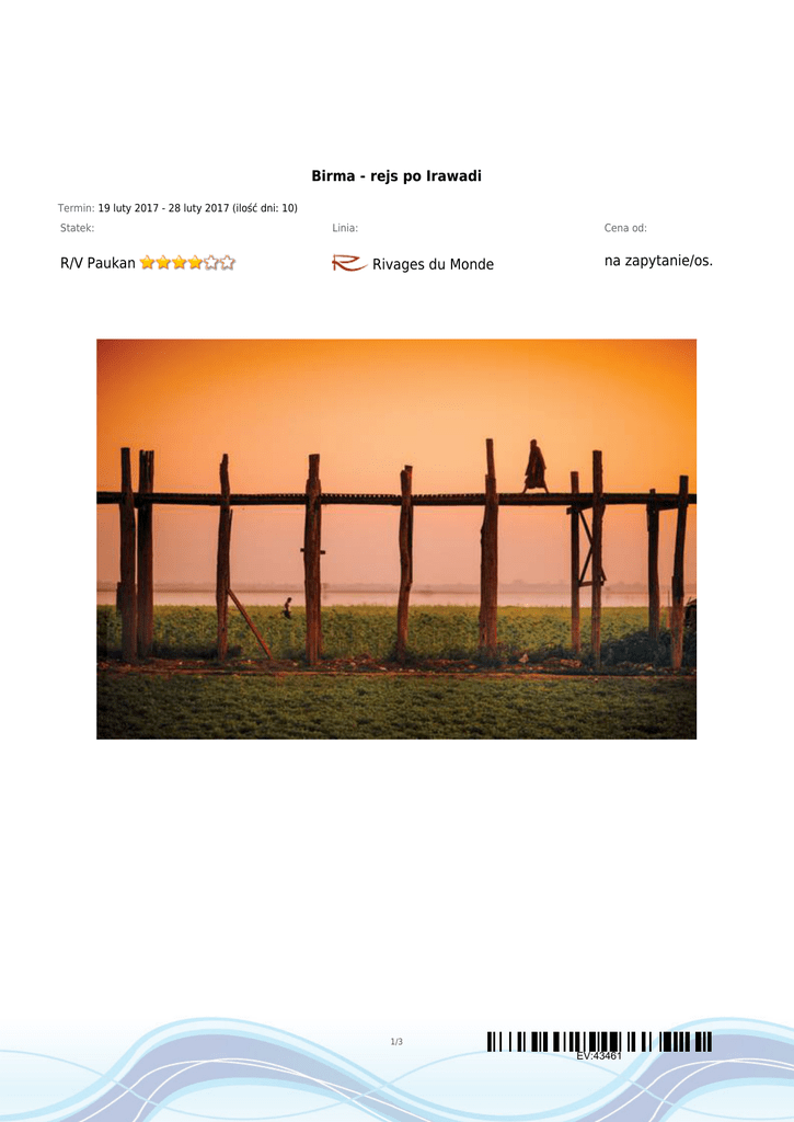 Birma - rejs po Irawadi Termin: 19 luty 2017 - 28 luty 2017 (ilość dni: 10) Statek: R/V Paukan Linia: Cena od: Rivages du Monde na zapytanie/os. 1/3 EV:43461 TRASA REJSU dzień 1 Data Port Wpłynięcie Wypłynięcie niedziela 19.02.2017 Rangun, (Birma) --:-- --:-- Legenda Mjanma Przylot do Birmy. Transfer z lotniska w Rangun do hotelu i lunch w pobliskiej restauracji. Po południu wycieczka po Rangun, nazywanym "Ogrodem Wschodu". Późnym popołudniem spacer na wzniesienie Thein Gottara, gdzie znajduje się zachwycająca świątynia Szwedagon. Obiad w restauracji i powrót do hotelu. dzień 2 poniedziałek 20.02.2017 Rangun, (Birma) --:-- --:-- Mjanma Wycieczka do niewielkiego miasteczka Thanlyin (ang. Syriam). Jednym z punktów programu będzie wizyta w świątyni Ye-Le Pogoda z ok. III w. p. n. e. Znajduje się tam duży zbiór dzieł sztuki. Powrót do Rangun i zwiedzanie Pagody Botahtaung i Pagody Chaukhtatgyi. Ptzystanek na Bogyoke Market (daw. Scott's Market) z ciekawą architekturą oraz sklepami z rękodziełem. Obiad i nocleg w hotelu. dzień 3 wtorek 21.02.2017 --:-- Mandalay, (Birma) --:-- Mjanma Po śniadaniu transfer na lotnisko i przelot do Mandalay. Zaokrętowanie na statek R/V Paukan. Rejs w kierunku Mingun. dzień 3 wtorek 21.02.2017 Mingun, (Birma) --:-- --:-- Mjanma Zwiedzanie miasta z wieloma starożytnymi pałacami i miejscami kultu religijnego. Powrót na pokład. Kolacja i nocleg na statku. dzień 4 środa 22.02.2017 Mandalay, (Birma) --:-- --:-- Mjanma Przed południem wizyta w centrum miasta Mandalay pełnego zabytków i miejsc kultu religijnego. dzień 4 środa 22.02.2017 Amayabuya --:-- --:-- Mjanma Wizyta w tradycyjnej fabryce jedwabiu. Kolejnym punktem programu będzie most U-Bain Bridge czyli najdłuższy tekowy most świata. Ma on długość aż 1,2km. Tam tez podziwiać będziemy zachód słońca. dzień 5 czwartek 23.02.2017 Sikong --:-- --:-- Mjanma O poranku zwiedzanie zabytkowego centrum Sikong. Lunch na pokładzie. dzień 5 czwartek 23.02.2017 Ava, (Birma) --:-- --:-- Mjanma Zwiedzanie starożytnego miasta, stolicy Birmy od 1364 do 1841 roku. Powrót na kolację na pokładzie i rejs w kierunku Munywy. dzień 6 piątek 24.02.2017 Munywa --:-- --:-- Mjanma Zwiedzanie miasta. Przejazd autobusem i zwiedzanie jaskiń Hpo Win Daung z setkami posągów Buddy z XIV i XV wieku. Powrót do Munywy na lunch. Po południu zwiedzanie pagody Sambuddhai Kat Kyaw z ponad 500 tysiącami posągów Buddy. Powrót na statek i kolacja na pokładzie. dzień 7 sobota 25.02.2017 --:-- Yandabo, (Birma) --:-- Mjanma Wczesnym rankiem przypłynięcie do wioski, której mieszkańcy specjalizują się szczególnie się w wyrabianiu naczyń. Można tutaj podejrzeć wyjątkową technikę ich tworzenia. Wizyta w szkole oraz w miejscowym klasztorze. Powrót na statek i lunch na pokładzie. Po południu spacer z przewodnikiem po wiosce Shwe Pyi Thar. Kolacja na pokładzie. dzień 8 niedziela 26.02.2017 Pagan, (Birma) --:-- --:-- Mjanma 2/3 EV:43461 Data Port Wpłynięcie Wypłynięcie Legenda Całodzienne zwiedzanie miasta i okolic z zachwycającymi świątyniami. dzień 9 poniedziałek 27.02.2017 Pagan, (Birma) --:-- --:-- Mjanma Całodzienna wycieczka na Mount Popa, wygasły wulkan zlokalizowany 65km. na południowy-zachód od Pagan. Na szczycie znajduje się buddyjski klasztor i aby się tam dostać, konieczne jest przejście dokładnie 777 schodów. Drogę urozmaicają skaczące wokół małpy. Lunch w miejscowym resorcie. Powrót na statek, kolacja i nocleg na pokładzie. dzień 10 wtorek 28.02.2017 Pagan, (Birma) --:-- --:-- Mjanma Po śniadaniu wyokrętowanie ze statku. Transfer na lotnisko i przelot do Rangun. Obiad w centrum miasta, wizyta w Muzeum Narodowym. CENNIK Cena katalogowa Kabina zewnętrzna z oknem €4 410.00 Kabina zewnętrzna deluxe €4 810.00 Suite (apartament) €5 870.00 Kabina jednoosobowa Opłaty portowe Cena promocyjna na zapytanie w cenie Uwaga! Ceny za osobę w kabinie dwuosobowej. 3/3 EV:43461