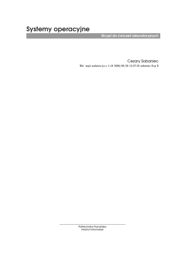 Systemy operacyjne Skrypt do ćwiczeń laboratoryjnych Cezary Sobaniec $Id: sop1-zadania.lyx,v 1.19 2006/09/26 13:37:25 sobaniec Exp $ Politechnika Poznańska Instytut Informatyki Spis treści 1 2 3 4 5 6 7 Wprowadzenie 1.1 Podstawy . . . . . . . . . . . . . . . . . . . . . . . . . . 1.2 Pomoc systemowa . . . . . . . . . . . . . . . . . . . . . . . 1.3 Interpreter poleceń . . . . . . . . . . . . . . . . . . . . . . . 2 System plików 2.1 Katalogi i pliki . . . 2.2 Prawa dostępu . . . 2.3 Wyszukiwanie plików . 2.4 Dowiązania . . . . . 4 . . . . . . . . . . . . . . . . . . . . . . . . . . . . . . . . . . . . 4 4 5 6 Edytory 3.1 Edytor vi . . . . . . . . . . . . . . . . . . . . . . . . . . 3.2 Edytor emacs . . . . . . . . . . . . . . . . . . . . . . . . . 7 Procesy 4.1 Lista procesów . . 4.2 Sygnały . . . . . 4.3 Priorytety procesów 4.4 Obsługa procesów w 9 . . . . . . . . . . . . . . . . . . . . . . . . . . . interpreterze poleceń Potoki 5.1 Filtr cat . . . . . 5.2 Filtry head, tail . . 5.3 Filtr grep . . . . . 5.4 Filtry wc, tr . . . . 5.5 Filtry cut, sort, uniq . . . . . . . . . . . . . . . . . . . . . . . . . . . . . . . . . . . . . . . . . . . . . . . . . . . . . . . . . . . . . . . . . . . . . . . . . . . . . . . . . . . . . . . . . . . . 2 2 3 . . . . 7 7 . 9 . 9 . 9 . 10 11 . . . . . . . . . . 11 11 11 12 12 Interpreter poleceń 6.1 Zmienne środowiskowe . . . . . . . . . . . . . . . . . . . . . 6.2 Aliasy i funkcje . . . . . . . . . . . . . . . . . . . . . . . . 6.3 Konfiguracja . . . . . . . . . . . . . . . . . . . . . . . . . 13 Programowanie w sh 7.1 Argumenty . . . . . 7.2 Instrukcja warunkowa 7.3 Pętle for i while . . 7.4 Wczytywanie wartości 7.5 Zadania zaawansowane 14 . . . . . . . . . . . . . . . . . . . . . . . . . . . . . . . . . . . . . . . . . . . . . . . . . . . . . . . . . . . . . . . . . . . . . . . . . . . . . . . . . . . . . . . . . . . . . . . . . . . . . . . . . . . . . . . . . . . . . . . . . . . . . . . . . . . . . . . . . . . . . . . . . . . . . . . . . . . . . . . . . . . . . . . . . . . . . . . . . . . . . . . . . . . . . . . . . . . . . . . . 13 13 13 14 14 14 15 15 1 Wprowadzenie Aktualna wersja niniejszego dokumentu jest dostępna w postaci elektronicznej pod adresem: http://www.cs.put.poznan.pl/csobaniec/Students/Sop/sop1-zadania.pdf 1.1 Podstawy 1. Logowanie do systemu. Zmiana hasła komendą passwd. Wylogowanie z systemu. 2. Konsole wirtualne. Tryb graficzny. Emulator terminala. 3. Wydawanie komend w systemie Unix. Przełączniki i argumenty. Podstawowe komendy: ls, pwd, cd. 4. Hierarchia katalogów: hier(7). 1.2 Pomoc systemowa 1. Przeglądarka more: q — wyjście, Enter , j , k — przewijanie liniami, Spa , Ctrl-f , Ctrl-b — przewijanie stronami, G — koniec pliku, / — wyszukiwanie tekstu. 2. Polecenie man. Pomoc systemowa po polsku. Budowa strony pomocy systemowej. Sekcje pomocy systemowej. 3. Programy pomocnicze: apropos, whatis, whereis. 4. Program info. 3 1.3 Interpreter poleceń 1.3 Interpreter poleceń 1. Praca z interpreterem poleceń: przywoływanie ostatnich komend, uzupełnianie nazw plików. 2. Przerywanie działania poleceń: ( Shift–PgUp , Shift–PgDn ). Ctrl–C . Przewijanie zawartości okna terminala 3. Nazwy uogólnione. Znaki specjalne: *, ? i []. (a) wyświetl listę jednoznakowych programów (b) wyświetl programy dwuliterowe złożone z liter „a”, „b” i „c” (c) wyświetl programy zawierające przynajmniej jedną wielką literę i jedną cyfrę 2 System plików 2.1 Katalogi i pliki 1. Utwórz katalog abc w katalogu domowym. Utwórz następnie katalog xyz w katalogu abc. Utwórz strukturę katalogów x1/x2/x3 w katalogu bieżącym korzystając z przełącznika -p polecenia mkdir. Usuń całą strukturę podkatalogów jednym wywołaniem polecenia rmdir. 2. Skopiuj wszystkie pliki z katalogu domowego kończące się na .c i .txt do katalogu abc. Przejdź do katalogu abc/xyz i skopiuj do niego wszystkie pliki kończące się na .txt z katalogu macierzystego. Następnie skopiuj całą strukturę katalogów abc tworząc analogiczną strukturę o nazwie abc2 (kopiowanie rekurencyjne). Zbadaj działanie przełącznika -i polecenia cp przy ponownej próbie kopiowania takiej struktury (zobacz man cp!). Zbadaj również działanie przełącznika -v. 3. Usuń wszystkie pliki z katalogu abc2/xyz. Usuń całą strukturę katalogów abc2 wraz z plikami (usuwanie rekurencyjne). Sprawdź działanie przełączników -i i -f polecenia rm. Przełącznik -f sprawdź w odniesieniu do plików tylko do odczytu (zobacz punkt 2.2). 4. Zmień nazwy wybranych plików poleceniem mv. Przenieś katalog abc/xyz do katalogu bieżącego tworząc w ten sposób katalog xyz w katalogu domowym. Przenieś wybrany plik z katalogu abc do katalogu xyz zmieniając jednocześnie jego nazwę. Sprawdź działanie przełączników -i i -f polecenia mv. 2.2 Prawa dostepu ˛ 1. Zinterpretuj następujące prawa dostępu: -rwxr-xr-x -rw-rw----r-----r--rwxrwxrwx -r-xr--r-- 1 1 1 1 1 daniel kamil marek daniel witek users students users students users 164 24250 28014 4563 4611 Feb 21 17:19 test2 May 27 2002 dane.txt Feb 21 17:43 przyklad.jpg Mar 8 04:43 pomoc.html Mar 8 04:42 pasjans 2.3 Wyszukiwanie plików 5 (a) Które pliki mogą być modyfikowane przez użytkownika daniel należącego do grup users i students? (b) Które pliki mogą być czytane przez użytkownika marek będącego członkiem grupy students? (c) Kto może wykonywać program pasjans? 2. Dla wybranych plików: dodaj prawo zapisu dla grupy, odejmij prawo zapisu dla właściciela, dodaj prawo do wykonywania dla wszystkich użytkowników, ustaw prawa użytkownika na rwx, usuń wszystkie prawa dla grupy i pozostałych użytkowników, ustaw prawa dla wszystkich użytkowników na rw. 3. Ustaw prawa dostępu do wybranych plików na takie, jak w przykładzie z punktu 1 korzystając z notacji numerycznej. 4. Zweryfikuj swoje prawa dostępu do plików /etc/passwd, /etc/shadow, /var/mail/xxx, 