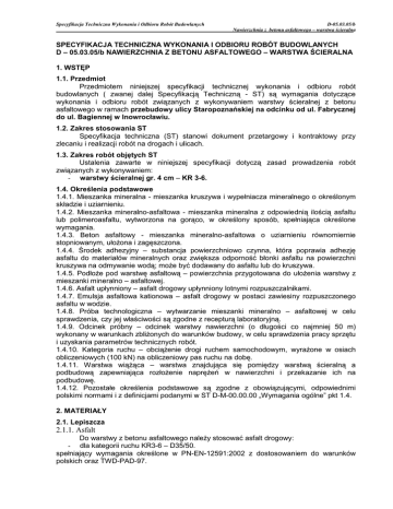Specyfikacja Techniczna Wykonania i Odbioru Robót Budowlanych D-05.03.05/b Nawierzchnia z betonu asfaltowego – warstwa ścieralna SPECYFIKACJA TECHNICZNA WYKONANIA I ODBIORU ROBÓT BUDOWLANYCH D – 05.03.05/b NAWIERZCHNIA Z BETONU ASFALTOWEGO – WARSTWA ŚCIERALNA 1. WSTĘP 1.1. Przedmiot Przedmiotem niniejszej specyfikacji technicznej wykonania i odbioru robót budowlanych ( zwanej dalej Specyfikacją Techniczną - ST) są wymagania dotyczące wykonania i odbioru robót związanych z wykonywaniem warstwy ścieralnej z betonu asfaltowego w ramach przebudowy ulicy Staropoznańskiej na odcinku od ul. Fabrycznej do ul. Bagiennej w Inowrocławiu. 1.2. Zakres stosowania ST Specyfikacja techniczna (ST) stanowi dokument przetargowy i kontraktowy przy zlecaniu i realizacji robót na drogach i ulicach. 1.3. Zakres robót objętych ST Ustalenia zawarte w niniejszej specyfikacji dotyczą zasad prowadzenia robót związanych z wykonywaniem: - warstwy ścieralnej gr. 4 cm – KR 3-6. 1.4. Określenia podstawowe 1.4.1. Mieszanka mineralna - mieszanka kruszywa i wypełniacza mineralnego o określonym składzie i uziarnieniu. 1.4.2. Mieszanka mineralno-asfaltowa - mieszanka mineralna z odpowiednią ilością asfaltu lub polimeroasfaltu, wytworzona na gorąco, w określony sposób, spełniająca określone wymagania. 1.4.3. Beton asfaltowy - mieszanka mineralno-asfaltowa o uziarnieniu równomiernie stopniowanym, ułoŜona i zagęszczona. 1.4.4. Środek adhezyjny – substancja powierzchniowo czynna, która poprawia adhezję asfaltu do materiałów mineralnych oraz zwiększa odporność błonki asfaltu na powierzchni kruszywa na odmywanie wodą; moŜe być dodawany do asfaltu lub do kruszywa. 1.4.5. PodłoŜe pod warstwę asfaltową – powierzchnia przygotowana do ułoŜenia warstwy z mieszanki mineralno – asfaltowej. 1.4.6. Asfalt upłynniony – asfalt drogowy upłynniony lotnymi rozpuszczalnikami. 1.4.7. Emulsja asfaltowa kationowa – asfalt drogowy w postaci zawiesiny rozpuszczonego asfaltu w wodzie. 1.4.8. Próba technologiczna – wytwarzanie mieszanki mineralno – asfaltowej w celu sprawdzenia, czy jej właściwości są zgodne z recepturą laboratoryjną. 1.4.9. Odcinek próbny – odcinek warstwy nawierzchni (o długości co najmniej 50 m) wykonany w warunkach zbliŜonych do warunków budowy, w celu sprawdzenia pracy sprzętu i uzyskania parametrów technicznych robót. 1.4.10. Kategoria ruchu – obciąŜenie drogi ruchem samochodowym, wyraŜone w osiach obliczeniowych (100 kN) na obliczeniowy pas ruchu na dobę. 1.4.11. Warstwa wiąŜąca – warstwa znajdująca się pomiędzy warstwą ścieralną a podbudową zapewniająca rozłoŜenie napręŜeń w nawierzchni i przekazanie ich na podbudowę. 1.4.12. Pozostałe określenia podstawowe są zgodne z obowiązującymi, odpowiednimi polskimi normami i z definicjami podanymi w ST D-M-00.00.00 „Wymagania ogólne” pkt 1.4. 2. MATERIAŁY 2.1. Lepiszcza 2.1.1. Asfalt Do warstwy z betonu asfaltowego naleŜy stosować asfalt drogowy: - dla kategorii ruchu KR3-6 – D35/50. spełniający wymagania określone w PN-EN-12591:2002 z dostosowaniem do warunków polskich oraz TWD-PAD-97. Specyfikacja Techniczna Wykonania i Odbioru Robót Budowlanych D-05.03.05/b Nawierzchnia z betonu asfaltowego – warstwa ścieralna Tablica 1. Wymagania dla D 35/50 Lp. Cechy asfaltu Wymagania 1 2 3 4 Penetracja w temp. 25°C, 0,1 mm Temperatura mięknienia, °C Temperatura zapłonu nie niŜsza niŜ, °C Zawartość skład. rozpuszczalnych, nie mniej niŜ, % m/m Zmiany masy po starzeniu, nie więcej niŜ, % m/m Pozostała penetracja po starzeniu, nie mniej niŜ, % Temp. mięknienia po starzeniu, nie mniej niŜ, °C Zawartość parafiny, nie więcej niŜ, % Wzrost temp. mięknienia po starzeniu, nie więcej niŜ, °C 35 ÷ 50 50 ÷ 58 240 PN-EN 1426 PN-EN 1427 PN-EN 22592 99 PN-EN 12592 0,5 PN-EN 12607-1 53 PN-EN 1426 52 2,2 PN-EN 1427 PN-EN 12606-1 5 6 7 8 9 8 Metody badań wg PN-EN 1427 Rodzaj lepiszcza i jego pochodzenie oraz uzgodnienie z dostawcą (producentem) zasady jakościowego odbioru lepiszczy, powinny być akceptowane przez InŜyniera. Zabrania się stosowania do tego samego asortymentu robót, lepiszczy pochodzących od róŜnych producentów. Zmiana dostawcy (producenta) lepiszcza w trakcie trwania robót, wymaga zgody InŜyniera oraz sprawdzenia receptury na mieszankę mineralno-bitumiczną. Asfalt powinien być składowany w zbiornikach, których konstrukcja i uŜyte do ich wykonania materiały wykluczają moŜliwość zanieczyszczenia asfaltu. Zbiorniki powinny być wyposaŜone w automatyczne urządzenia grzewcze - olejowe, parowe lub elektryczne. Nie dopuszcza się ogrzewania asfaltu otwartym ogniem. Zbiornik roboczy otaczarki powinien być izolowany termicznie, posiadać automatyczny system grzewczy zdolny do utrzymania zadanej temperatury z tolerancją ± 5 0C oraz posiadać układ cyrkulacji asfaltu. Wylot rury powrotnej musi znajdować się w zbiorniku poniŜej zwierciadła gorącego asfaltu. Zaleca się stosowanie izolowanych termicznie metalowych zbiorników pionowych, wyposaŜonych w elektryczny system grzewczy. 2.1.2. Emulsja asfaltowa kationowa NaleŜy stosować drogowe kationowe emulsje asfaltowe spełniające wymagania określone w WT.EmA-99. 2.2. Wypełniacz NaleŜy stosować wypełniacz podstawowy produkowany ze skał wapiennych drobnoziarnistych lub bezpostaciowych ze starych formacji geologicznych wapienia. Zawartość węglanu wapnia (CaCO3) w skałach powinna być nie mniejsza niŜ 90%. Wypełniacz powinien spełniać następujące wymagania wg Zeszytu nr 56 IBDiM Wwa. Tablica 2. Wymagania dla wypełniacza Gatunek Lp. Cecha materiału I 1 1 2 3 4 2 Zawartość węglanu wapnia nie mniej niŜ (%) Wilgotność mączki wapiennej, nie więcej niŜ (%) Górna granica wielkości ziarn mączki wapiennej odpowiadająca wymiarowi oczek sit kontrolnych, mm Zawartość wypełniacza w mączce wapiennej, nie mniej Badania wg pkt. Zeszytu nr 56 3
