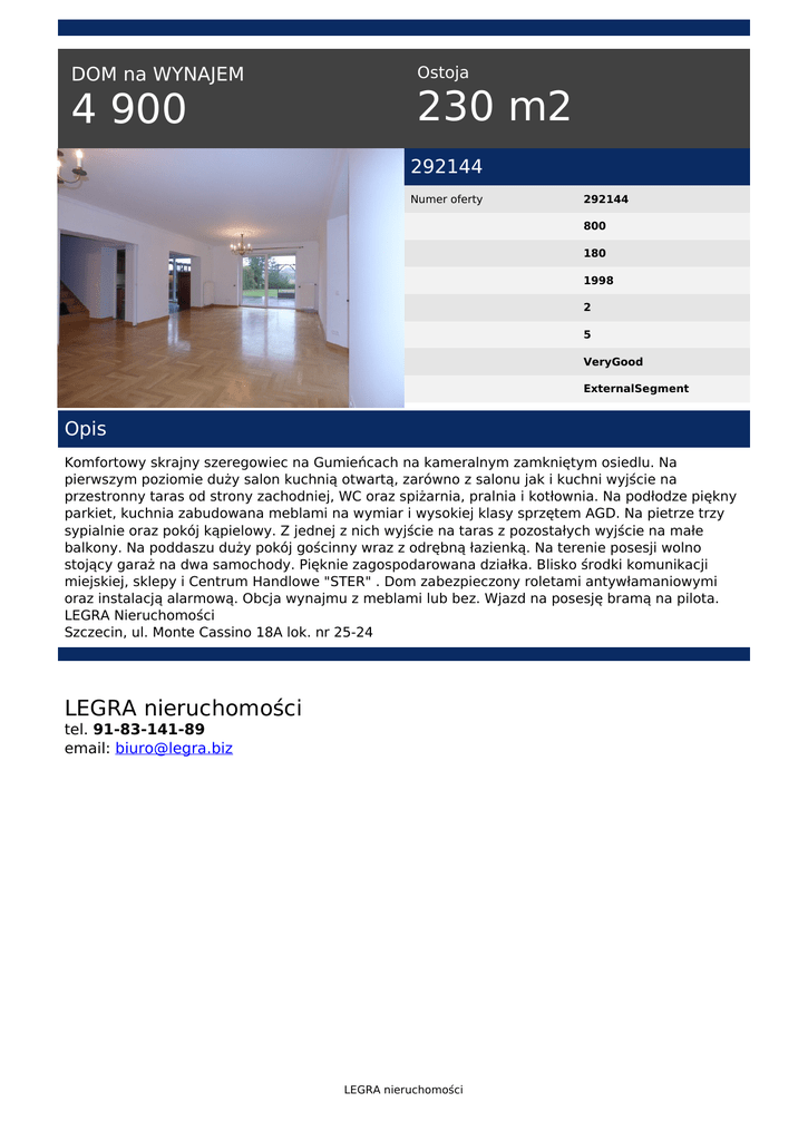 DOM na WYNAJEM 4 900 Ostoja 230 m2 292144 Numer oferty 292144 800 180 1998 2 5 VeryGood ExternalSegment Opis Komfortowy skrajny szeregowiec na Gumieńcach na kameralnym zamkniętym osiedlu. Na pierwszym poziomie duży salon kuchnią otwartą, zarówno z salonu jak i kuchni wyjście na przestronny taras od strony zachodniej, WC oraz spiżarnia, pralnia i kotłownia. Na podłodze piękny parkiet, kuchnia zabudowana meblami na wymiar i wysokiej klasy sprzętem AGD. Na pietrze trzy sypialnie oraz pokój kąpielowy. Z jednej z nich wyjście na taras z pozostałych wyjście na małe balkony. Na poddaszu duży pokój gościnny wraz z odrębną łazienką. Na terenie posesji wolno stojący garaż na dwa samochody. Pięknie zagospodarowana działka. Blisko środki komunikacji miejskiej, sklepy i Centrum Handlowe "STER" . Dom zabezpieczony roletami antywłamaniowymi oraz instalacją alarmową. Obcja wynajmu z meblami lub bez. Wjazd na posesję bramą na pilota. LEGRA Nieruchomości Szczecin, ul. Monte Cassino 18A lok. nr 25-24 LEGRA nieruchomości tel. 91-83-141-89 email: [email protected] LEGRA nieruchomości Powered by TCPDF (www.tcpdf.org)