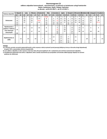Harmonogram C3 odbioru odpadów komunalnych - nieruchomości, na których są świadczone usługi hotelarskie Rejon: Sarbinowo, Gąski, Chłopy, Paprotno w okresie : od 01.01.2017 r. do 31.12.2017 r. Rodzaj odpadów Zmieszane Opakowania z papieru i tektury oraz tworzyw sztucznych Opakowania ze szkła Styczeń pn. pt. 2 9 16 23 30 2 Luty pn pt. 6 13 20 27 Marzec Kwiecień Maj pn. pt. pn pt. pn. pt. 6 3 4 czw. 13 10 8 20 18 wt. 15 27 24 22 29 13 13 10 8 27 27 24 22 16 30 Czerwiec pn. czw. 1 5 8 12 15 19 22 26 29 1 8 15 22 29 12 13 10 10 7 5 26 Lipiec pn. czw. 3 6 10 13 17 20 24 27 31 6 13 20 27 3 10 17 24 31 Sierpień pn. czw 3 7 10 14 17 21 24 28 31 3 10 17 24 31 Wrzesień Październik Listopad Grudzień pn. czw pn. pt. pn. pt. pn. pt. 4 7 2 6 4 11 14 9 13 11 18 21 16 20 18 25 28 23 27 27 śr. 30 7 14 9 6 4 21 28 23 20 18 7 14 21 28 11 20 25 Uwaga: a) w okresie czerwiec-wrzesień pojemniki/worki w dniu wywozu należy wystawić przed posesję (oklejoną stroną w kierunku drogi dojazdowej) do godz.7:00 w pozostałym okresie do godz.8:00 , b) czas odbioru odpadów w dniu wywozu może być różny dla poszczególnych ulic i uzależniony jest od ilości wystawianych odpadów , c) nieodebranie pojemnika lub worka z odpadami, które zostały wystawione po przejeździe samochodu odbierającego odpady nie stanowi podstaw do reklamacji. 17 15
