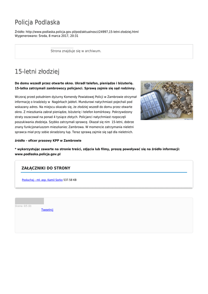 Policja Podlaska Źródło: http://www.podlaska.policja.gov.pl/pod/aktualnosci/24997,15-letni-zlodziej.html Wygenerowano: Środa, 8 marca 2017, 20:31 Strona znajduje się w archiwum. 15-letni złodziej Do domu wszedł przez otwarte okno. Ukradł telefon, pieniądze i biżuterię. 15-latka zatrzymali zambrowscy policjanci. Sprawą zajmie się sąd rodzinny. Wczoraj przed południem dyżurny Komendy Powiatowej Policji w Zambrowie otrzymał informację o kradzieży w Nagórkach Jabłoń. Mundurowi natychmiast pojechali pod wskazany adres. Na miejscu okazało się, że złodziej wszedł do domu przez otwarte okno. Z mieszkania zabrał pieniądze, biżuterię i telefon komórkowy. Pokrzywdzony straty oszacował na ponad 4 tysiące złotych. Policjanci natychmiast rozpoczęli poszukiwania złodzieja. Szybko zatrzymali sprawcę. Okazał się nim 15-letni, dobrze znany funkcjonariuszom mieszkaniec Zambrowa. W momencie zatrzymania nieletni sprawca miał przy sobie skradziony łup. Teraz sprawą zajmie się sąd dla nieletnich. źródło – oficer prasowy KPP w Zambrowie * wykorzystując zawarte na stronie treści, zdjęcia lub filmy, proszę powoływać się na źródło informacji: www.podlaska.policja.gov.pl ZAŁĄCZNIKI DO STRONY Posłuchaj - mł. asp. Kamil Sorko 537.58 KB Ocena: 0/5 (0) Tweetnij