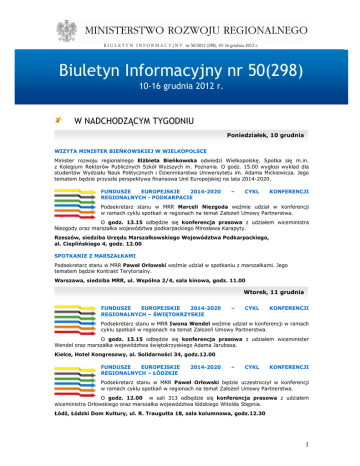 B I U L E T Y N I N F O R M A C Y J N Y nr 50/2012 (298), 10-16 grudnia 2012 r. Biuletyn Informacyjny nr 50(298) 10-16 grudnia 2012 r. W NADCHODZĄCYM TYGODNIU Poniedziałek, 10 grudnia WIZYTA MINISTER BIEŃKOWSKIEJ W WIELKOPOLSCE Minister rozwoju regionalnego Elżbieta Bieńkowska odwiedzi Wielkopolskę. Spotka się m.in. z Kolegium Rektorów Publicznych Szkół Wyższych m. Poznania. O godz. 15.00 wygłosi wykład dla studentów Wydziału Nauk Politycznych i Dziennikarstwa Uniwersytetu im. Adama Mickiewicza. Jego tematem będzie przyszła perspektywa finansowa Unii Europejskiej na lata 2014-2020. FUNDUSZE EUROPEJSKIE 2014-2020 REGIONALNYCH - PODKARPACIE – CYKL KONFERENCJI Podsekretarz stanu w MRR Marceli Niezgoda weźmie udział w konferencji w ramach cyklu spotkań w regionach na temat Założeń Umowy Partnerstwa. O godz. 13.15 odbędzie się konferencja prasowa z udziałem wiceministra Niezgody oraz marszałka województwa podkarpackiego Mirosława Karapyty. Rzeszów, siedziba Urzędu Marszałkowskiego Województwa Podkarpackiego, al. Cieplińskiego 4, godz. 12.00 SPOTKANIE Z MARSZAŁKAMI Podsekretarz stanu w MRR Paweł Orłowski weźmie udział w spotkaniu z marszałkami. Jego tematem będzie Kontrakt Terytorialny. Warszawa, siedziba MRR, ul. Wspólna 2/4, sala kinowa, godz. 11.00 Wtorek, 11 grudnia FUNDUSZE EUROPEJSKIE 2014-2020 REGIONALNYCH – ŚWIĘTOKRZYSKIE – CYKL KONFERENCJI Podsekretarz stanu w MRR Iwona Wendel weźmie udział w konferencji w ramach cyklu spotkań w regionach na temat Założeń Umowy Partnerstwa. O godz. 13.15 odbędzie się konferencja prasowa z udziałem wiceminister Wendel oraz marszałka województwa świętokrzyskiego Adama Jarubasa. Kielce, Hotel Kongresowy, al. Solidarności 34, godz.12.00 FUNDUSZE EUROPEJSKIE REGIONALNYCH – ŁÓDZKIE 2014-2020 – CYKL KONFERENCJI Podsekretarz stanu w MRR Paweł Orłowski będzie uczestniczył w konferencji w ramach cyklu spotkań w regionach na temat Założeń Umowy Partnerstwa. O godz. 12.00 w sali 313 odbędzie się konferencja prasowa z udziałem wiceministra Orłowskiego oraz marszałka województwa łódzkiego Witolda Stępnia. Łódź, Łódzki Dom Kultury, ul. R. Traugutta 18, sala kolumnowa, godz.12.30 1 B I U L E T Y N I N F O R M A C Y J N Y nr 50/2012 (298), 10-16 grudnia 2012 r. Środa, 12 grudnia WIZYTA AMBASADORA CHIN Minister rozwoju regionalnego Elżbieta Bieńkowska spotka się z delegacją Ambasady Chińskiej Republiki Ludowej której będzie przewodniczył ambasador Xu Jian. Warszawa, siedziba MRR, ul. Wspólna 2/4, godz. 9.00 FUNDUSZE EUROPEJSKIE 2014-2020 REGIONALNYCH – KUJAWSKO-POMORSKIE – CYKL KONFERENCJI Podsekretarz stanu w MRR Paweł Orłowski weźmie udział w konferencji w ramach cyklu spotkań w regionach na temat założeń do Umowy Partnerstwa. O godz. 12.00 odbędzie się konferencja prasowa z udziałem wiceministra Orłowskiego oraz marszałka województwa kujawsko-pomorskiego Piotra Całbeckiego. Toruń, Centrum Dialogu, Pl. Bł. S. Frelichowskiego 1, godz. 12.30 POSIEDZENIE KOMITETU MONITORUJĄCEGO STRATEGIĘ WYKORZYSTANIA FUNDUSZU SPÓJNOŚCI Sekretarz stanu w MRR Adam Zdziebło otworzy posiedzenie Komitetu Monitorującego Strategię Wykorzystania Funduszu Spójności. Warszawa, siedziba MRR, ul. Wspólna 2/4, sala kinowa, godz. 11.00 Czwartek, 13 grudnia FUNDUSZE EUROPEJSKIE REGIONALNYCH – POMORZE 2014-2020 – CYKL KONFERENCJI Minister rozwoju regionalnego Elżbieta Bieńkowska oraz podsekretarz stanu w MRR Paweł Orłowski będą uczestniczyć w konferencji w ramach cyklu spotkań w regionach na temat Założeń Umowy Partnerstwa. O godz. 11.00 odbędzie się konferencja prasowa z udziałem minister Bieńkowskiej oraz marszałka województwa pomorskiego Mieczysława Struka. Gdańsk, Filharmonia Bałtycka, ul. Ołowianki 1, godz. 12.00 OTWARCIE PARKU NAUKOWO-TECHNOLOGICZNEGO POLSKA-WSCHÓD W SUWAŁKACH Podsekretarz stanu w MRR Iwona Naukowo-Technologicznego Polska-Wschód. Wendel weźmie udział w otwarciu Parku Suwałki, aula Parku Naukowo-Technologicznego, ul. Innowacyjna 1, godz. 11.00 Piątek, 14 grudnia POSIEDZENIE KOMITETU MONITORUJĄCEGO PROGRAM INNOWACYJNA GOSPODARKA Podsekretarz stanu w MRR Iwona Wendel weźmie udział w posiedzenie Komitetu Monitorującego Program Innowacyjna Gospodarka. Warszawa, siedziba MRR, ul. Wspólna 2/4, s. 5114, godz. 11.00 KONFERENCJA SPOŁECZNEGO PODSUMOWUJĄCA: SIEĆ NAUKI EUROPEJSKIEGO FUNDUSZU Podsekretarz stanu w MRR Paweł Orłowski weźmie udział w konferencji podsumowującej sieć współpracy Europejskiego Funduszu Społecznego: „Facing the challenge how to effectively suport public administration reforms by ESF funds”. Warszawa, siedziba MRR, ul. Wspólna 2/4, sala kinowa, godz. 9.00 2 B I U L E T Y N I N F O R M A C Y J N Y nr 50/2012 (298), 10-16 grudnia 2012 r. FUNDUSZE EUROPEJSKIE 2014-2020 W Wielkopolsce o Założeniach Umowy Partnerstwa - Istotne jest to w jaki sposób będziemy mogli wydatkować pieniądze z nowego budżetu Unii Europejskiej. Kluczowym elementem jest więc Umowa Partnerstwa, której założenia są tematem naszego dzisiejszego spotkania - powiedział marszałek województwa wielkopolskiego Marek Woźniak otwierając piątą z kolei konferencję konsultacyjną w regionach. Uczestniczyła w niej wiceminister rozwoju regionalnego Iwona Wendel. - Nie trzeba nikogo przekonywać, że Polska bardzo dobrze radzi sobie z wdrażaniem unijnych programów oraz w znakomity sposób korzysta z szansy, którą dają nam Fundusze Europejskie. Między innymi dzięki tym środkom, nasz kraj zanotował najwyższe tempo wzrostu gospodarczego w Unii Europejskiej w latach 2007-2011 - powiedziała wiceminister Wendel, prezentując najistotniejsze zapisy Założeń Umowy Partnerstwa. Dodała, że mimo iż jest to dokument ogólny, zostały w nim zarysowane cele i kierunki wsparcia, struktura programów operacyjnych, mechanizmy działania instrumentów terytorialnych, jak również zarys finansowania środkami euro
