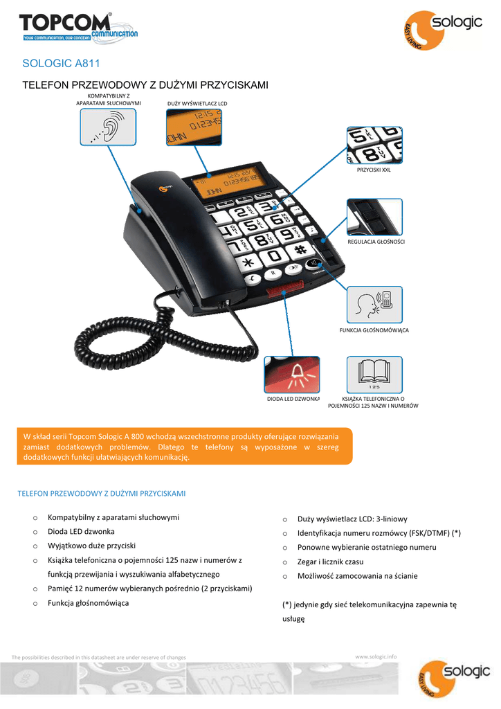 SOLOGIC A811 TELEFON PRZEWODOWY Z DUĩYMI PRZYCISKAMI KOMPATYBILNYZ APARATAMISBUCHOWYMI DUYWY_WIETLACZLCD PRZYCISKIXXL REGULACJAGBO_NO_CI FUNKCJAGBO_NOMÓWICA DIODALEDDZWONKA KSIKATELEFONICZNAO POJEMNO_CI125NAZWINUMERÓW WskųadseriiTopcomSologicA800wchodzČwszechstronneproduktyoferujČcerozwiČzania zamiast dodatkowych problemów. Dlatego te telefony sČ wyposaǏone w szereg dodatkowychfunkcjiuųatwiajČcychkomunikacjħ. TELEFONPRZEWODOWYZDUYMIPRZYCISKAMI o Kompatybilnyzaparatamisųuchowymi o DuǏywyƑwietlaczLCD:3Ͳliniowy o DiodaLEDdzwonka o Identyfikacjanumerurozmówcy(FSK/DTMF)(*) o WyjČtkowoduǏeprzyciski o Ponownewybieranieostatniegonumeru o KsiČǏkatelefonicznaopojemnoƑci125nazwinumerówz o Zegarilicznikczasu funkcjČprzewijaniaiwyszukiwaniaalfabetycznego o MoǏliwoƑđzamocowanianaƑcianie o Pamiħđ12numerówwybieranychpoƑrednio(2przyciskami) o FunkcjagųoƑnomówiČca (*)jedyniegdysieđtelekomunikacyjnazapewniatħ usųugħ Thepossibilitiesdescribedinthisdatasheetareunderreserveofchanges www.sologic.info