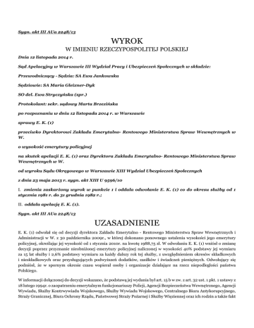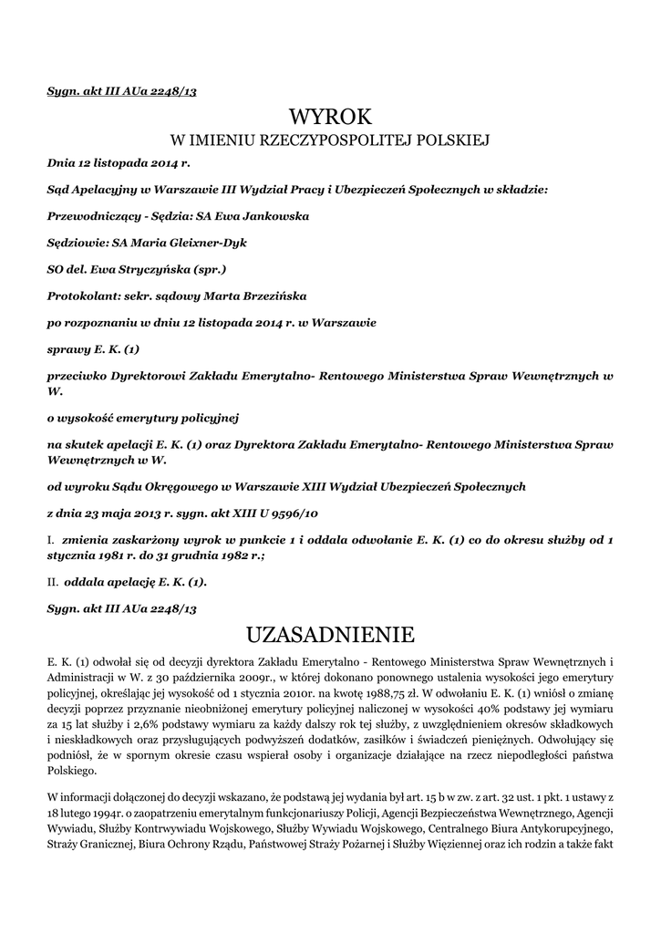 Sygn. akt III AUa 2248/13 WYROK W IMIENIU RZECZYPOSPOLITEJ POLSKIEJ Dnia 12 listopada 2014 r. Sąd Apelacyjny w Warszawie III Wydział Pracy i Ubezpieczeń Społecznych w składzie: Przewodniczący - Sędzia: SA Ewa Jankowska Sędziowie: SA Maria Gleixner-Dyk SO del. Ewa Stryczyńska (spr.) Protokolant: sekr. sądowy Marta Brzezińska po rozpoznaniu w dniu 12 listopada 2014 r. w Warszawie sprawy E. K. (1) przeciwko Dyrektorowi Zakładu Emerytalno- Rentowego Ministerstwa Spraw Wewnętrznych w W. o wysokość emerytury policyjnej na skutek apelacji E. K. (1) oraz Dyrektora Zakładu Emerytalno- Rentowego Ministerstwa Spraw Wewnętrznych w W. od wyroku Sądu Okręgowego w Warszawie XIII Wydział Ubezpieczeń Społecznych z dnia 23 maja 2013 r. sygn. akt XIII U 9596/10 I. zmienia zaskarżony wyrok w punkcie 1 i oddala odwołanie E. K. (1) co do okresu służby od 1 stycznia 1981 r. do 31 grudnia 1982 r.; II. oddala apelację E. K. (1). Sygn. akt III AUa 2248/13 UZASADNIENIE E. K. (1) odwołał się od decyzji dyrektora Zakładu Emerytalno - Rentowego Ministerstwa Spraw Wewnętrznych i Administracji w W. z 30 października 2009r., w której dokonano ponownego ustalenia wysokości jego emerytury policyjnej, określając jej wysokość od 1 stycznia 2010r. na kwotę 1988,75 zł. W odwołaniu E. K. (1) wniósł o zmianę decyzji poprzez przyznanie nieobniżonej emerytury policyjnej naliczonej w wysokości 40% podstawy jej wymiaru za 15 lat służby i 2,6% podstawy wymiaru za każdy dalszy rok tej służby, z uwzględnieniem okresów składkowych i nieskładkowych oraz przysługujących podwyższeń dodatków, zasiłków i świadczeń pieniężnych. Odwołujący się podniósł, że w spornym okresie czasu wspierał osoby i organizacje działające na rzecz niepodległości państwa Polskiego. W informacji dołączonej do decyzji wskazano, że podstawą jej wydania był art. 15 b w zw. z art. 32 ust. 1 pkt. 1 ustawy z 18 lutego 1994r. o zaopatrzeniu emerytalnym funkcjonariuszy Policji, Agencji Bezpieczeństwa Wewnętrznego, Agencji Wywiadu, Służby Kontrwywiadu Wojskowego, Służby Wywiadu Wojskowego, Centralnego Biura Antykorupcyjnego, Straży Granicznej, Biura Ochrony Rządu, Państwowej Straży Pożarnej i Służby Więziennej oraz ich rodzin a także fakt otrzymania od Instytutu Pamięci Narodowej informacji o przebiegu służby wnioskodawcy w organach bezpieczeństwa państwa, o których mowa w art. 2 ustawy z 18 października 2006r. o ujawnianiu informacji o dokumentach organów bezpieczeństwa państwa z lat 1944-1990 oraz treści tych dokumentów, sporządzonej na podstawie posiadanych przez IPN akt osobowych. W odpowiedzi na odwołanie Zakład Emerytalno – Rentowy Ministerstwa Spraw Wewnętrznych wniósł o jego oddalenie i podniósł, że zaskarżona decyzja jest zgodna ze wskazanymi w odwołaniu przepisami prawa, a tym samym odwołanie pozbawione jest podstaw prawnych. Wyrokiem z 23 maja 2013r. Sąd Okręgowy w Warszawie XIII Wydział Ubezpieczeń Społecznych zmienił zaskarżoną decyzję w ten sposób, że stwierdził, że okres służby E. K. (1) od 1 stycznia 1981r. do 31 grudnia 1982r. liczony jest wskaźnikiem podstawy wymiaru emerytury po 2,6% za każdy rok służby, a nadto oddalił odwołanie w pozostałym zakresie. Podstawą rozstrzygnięcia Sądu Okręgowego były następujące ustalenia faktyczne: E. K. (1), urodzony (...), w spornym okresie pełnił służbę od 16 czerwca 1972 r. do 17 kwietnia 1983r. pełnił służbę w Ministerstwie Spraw Wewnętrznych, przy czym od 16 czerwca 1972r.do 30 kwietnia 1979r. na stanowisku inspektora w Wydziale (...), a od 1 maja 1979r. do 17 kwietnia 1983r. w Wydziale (...) A na stanowisku inspektora. Decyzją z 24 listopada 1989r. odwołującemu się przyznano prawo do emerytury milicyjnej, która z tytułu wysługi lat wyniosła 64% podstawy wymiaru. W związku z wejściem w życie ustawy z 23 stycznia 2009r. o zmianie ustawy o zaopatrzeniu emerytalnym żołnierzy zawodowych oraz ich rodzin oraz ustawy o zaopatrzeniu emerytalnym funkcjonariuszy Policji, Agencji Bezpieczeństwa Wewnętrznego, Agencji Wywiadu, Służby Kontrwywiadu Wojskowego, Służby Wywiadu Wojskowego, Centralnego Biura Antykorupcyjnego, Straży Granicznej, Biura Ochrony Rządu, Państwowej Straży Pożarnej i Służby Więziennej oraz ich rodzin organ rentowy otrzymał informację z Instytutu Pamięci Narodowej z 27 sierpnia 2009r. o przebiegu służby odwołującego się w organach bezpieczeństwa państwa, o których mowa w art. 2 ustawy z 18 października 2006r. o ujawnianiu informacji o dokumentach organów bezpieczeństwa państwa z lat 1944-1990 oraz treści tych dokumentów, sporządzoną na podstawie posiadanych przez IPN akt osobowych. Z dokumentacji tej wynikało, że odwołujący się w okresie od 16 sierpnia 1972r. do 17 kwietnia 1983r. pełnił służbę w organach bezpieczeństwa państwa, o których mowa w art. 2 ustawy z 18 października 2006r. o ujawnianiu informacji o dokumentach organów bezpieczeństwa państwa z lat 1944-1990 oraz treści tych dokumentów. Wobec powyższego Dyrektor Zakładu Emerytalno-Rentowego Ministerstwa Spraw Wewnętrznych decyzją z 30 października 2009r. dokonał ponownego ustalenia wysokości emerytury policyjnej E. K. (1), określając ją od 1 stycznia 2010r. na kwotę 1988,75 zł. Wskaźnik podstawy wymiaru emerytury odwołującego się za okres służby w organach bezpieczeństwa obniżono z 2,6 % do 0,7 % podstawy wymiaru za każdy rok służby we wskazanym okresie. Ponownie ustalona wysokość emerytury z tytułu wysługi lat od 1 stycznia 2010r. wyniosła 52,22% podstawy wymiaru. Sąd stwierdził, że z relacji świadka A. M. (1) wynika, że odwołującego się poznał w 1963r. w trakcie studiów na (...). Świadek zeznał, że pracował w Ministerstwie (...)Spraw (...) w Wydziale Płac. W 1981r. lub 1982r. odwołujący się zatelefonował do świadka i poprosił o spotkanie, które miało na celu przekazanie inf