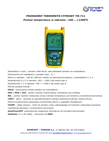 PRZENOŚNY TERMOMETR CYFROWY TM-711 Pomiar temperatury w zakresie –100 ...+1300oC Wyświetlacz 4 cyfry , wymiary 164x76x32 ,opis jednostek pomiaru na wyświetlaczu Przeznaczony do współpracy z sondami typu: K, J Mierzy w zakresie: -100 do 1300 stC (zależy od wybranej termopary), w jednostkach C, F, K Rozdzielczość 0.1 C w zakresie -100 ~ +200 C dla sondy typu K Rozdzielczość 1 C w zakresie -100 ~ +1300 C dla sondy typu K Miernik posiada funkcje : HOLD - zatrzymanie wyniku pomiaru na wyświetlaczu MAX / MIN / AVG - pomiar wartości maksymalnej, minimalnej oraz średniej REL - pomiar wartości relatywnej (zmian wartości temperatury od momentu uruchomienia tej funkcji) LIMIT - alarm - pozwala na zaprogramowanie wartości granicznych górnej i dolnej (Hi/Lo), których przekroczenie spowoduje uruchomienie alarmu z sygnałem dźwiękowym COUNT - układ czasowy - timer do pomiaru czasu upływającego od momenty rozpoczęcia pomiarów (użytkownik decyduje o uruchomieniu tej funkcji) AutoPowerOFF -automatyczne wyłączenie miernika po 20 minutach bezczynności Zasilanie: 4 x 1,5V (AAA) - czas pracy do 500h KOMPART – POMIAR s.c. ul. Balicka 100, 30-149 Kraków tel/fax 012 648 02 09, 012 626 07 89, mail: [email protected] www.kompartpomiar.pl SONDY TEMPERATURY POMIARY TEMPERATURY POWIERZCHNI SONDA TEMPERATURY TP-04 sonda typu K (NiCr/NiAL) do termometrów z wejściem K, do szybkich i precyzyjnych pomiarow na powierzchni (również nierównych), długość całkowita ok. 10cm, średnica 15mm, dł. przewodu kompensacyjnego 1m, termopara z elastyczną końcówką pomiarową umieszczona blisko rączki, zakres pomiarowy: -50 C do 400 C SONDA TEMPERATURY TK-32 (PROSTA) ORAZ TK33 (KĄTOWA) SONDA TEMPERATURY TP-02 sonda typu K (NiCr/NiAL) do termometrów z wejściem K, dotykowa do powierzchni, zakończona płaskim kółkiem o śr. 7mm część metalowa: długość 15,6cm średnica 3,2mm, rączka 10 cm z tworzywa, dł. przewodu kompensacyjnego 1m, zakres: -50 C do 700 C KOMPART – POMIAR s.c. ul. Balicka 100, 30-149 Kraków tel/fax 012 648 02 09, 012 626 07 89, mail: [email protected] www.kompartpomiar.pl POMIARY TEMPERATURY CIECZY I MATERIAŁÓW SYPKICH SONDA TEMPERATURY TP-01 sonda typu K (NiCr/NiAL) do termometrów z wejściem K, do cieczy i materiałów sypkich, część metalowa: długość 15,6cm średnica 3,2mm SONDA TEMPERATURY DO RUCHOMYCH POWIERZCHNI, OBRACAJĄCYCH SIĘ WALCÓW, TYP TK-35 Sonda wyposażona w specjalny, taśmowy, elastyczny element pomiarowy typu K i cztery rolki teflonowe, co umożliwia pomiar temperatury obiektów ruchomych. • elastyczny przewód spiralny (ok. 1,5 m) • zakończona typowym wtykiem “mini” do sond K Zakres pomiarowy: 0°C÷250°C Zastosowanie: powierzchnie gładkie ruchome INNE RĘCZNE SONDY WYKONUJEMY NA ZAMÓWIENIE KOMPART – POMIAR s.c. ul. Balicka 100, 30-149 Kraków tel/fax 012 648 02 09, 012 626 07 89, mail: [email protected] www.kompartpomiar.pl