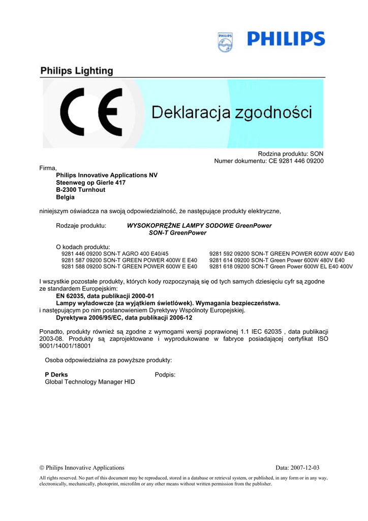 Rodzina produktu: SON Numer dokumentu: CE 9281 446 09200 Firma, Philips Innovative Applications NV Steenweg op Gierle 417 B-2300 Turnhout Belgia niniejszym oświadcza na swoją odpowiedzialność, że następujące produkty elektryczne, Rodzaje produktu: WYSOKOPRĘŻNE LAMPY SODOWE GreenPower SON-T GreenPower O kodach produktu: 9281 446 09200 SON-T AGRO 400 E40/45 9281 587 09200 SON-T GREEN POWER 400W E E40 9281 588 09200 SON-T GREEN POWER 600W E E40 9281 592 09200 SON-T GREEN POWER 600W 400V E40 9281 614 09200 SON-T Green Power 600W 480V E40 9281 618 09200 SON-T Green Power 600W EL E40 400V I wszystkie pozostałe produkty, których kody rozpoczynają się od tych samych dziesięciu cyfr są zgodne ze standardem Europejskim: EN 62035, data publikacji 2000-01 Lampy wyładowcze (za wyjątkiem świetlówek). Wymagania bezpieczeństwa. i następującym po nim postanowieniem Dyrektywy Wspólnoty Europejskiej. Dyrektywa 2006/95/EC, data publikacji 2006-12 Ponadto, produkty również są zgodne z wymogami wersji poprawionej 1.1 IEC 62035 , data publikacji 2003-08. Produkty są zaprojektowane i wyprodukowane w fabryce posiadającej certyfikat ISO 9001/14001/18001 Osoba odpowiedzialna za powyższe produkty: P Derks Global Technology Manager HID © Philips Innovative Applications Podpis: Data: 2007-12-03 All rights reserved. No part of this document may be reproduced, stored in a database or retrieval system, or published, in any form or in any way, electronically, mechanically, photoprint, microfilm or any other means without written permission from the publisher. Product family: SON Document Nr: CE 9281 446 09200 We, Philips Innovative Applications NV Steenweg op Gierle 417 B-2300 Turnhout Belgium declare under our responsibility that the electrical products, Product types: HIGH PRESSURE SODIUM GreenPower LAMPS SON-T GreenPower With product codes: 9281 446 09200 SON-T AGRO 400 E40/45 9281 587 09200 SON-T GREEN POWER 400W E E40 9281 588 09200 SON-T GREEN POWER 600W E E40 9281 592 09200 SON-T GREEN POWER 600W 400V E40 9281 614 09200 SON-T Green Power 600W 480V E40 9281 618 09200 SON-T Green Power 600W EL E40 400V And any products supplied by us with codes beginning with the same 10 digits are in conformity with the European standard: EN 62035, date of issue 2000-01 Discharge lamps (excluding fluorescent lamps) safety specifications. following the provisions of EC-Directive Directive 2006/95/EC, date of issue 2006-12 In addition the products also comply with the requirements of revised IEC 62035 version 1.1, date of issue 2003-08. The products are designed and manufactured in a factory certified to ISO 9001/14001/18001 Responsible and authorized for this product: P Derks Global Technology Manager HID © Philips Innovative Applications Signature: Date: 03 December 2007 All rights reserved. No part of this document may be reproduced, stored in a database or retrieval system, or published, in any form or in any way, electronically, mechanically, photoprint, microfilm or any other means without written permission from the publisher.