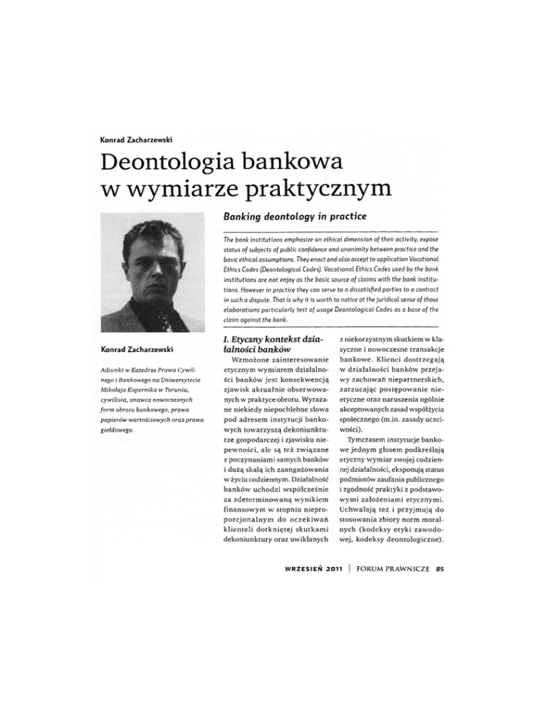 Konrad Zacharzewski Deontologia bankowa w wymiarze praktycznym Banking deontology in practice The bank institutions emphasize an ethical dimension status of subjects of public confidence and unanimity basie ethical assumptions. They enact and also accept to application Ethics Codes (Deontological institutions of their activity, between prądice Codes). Vocational are not enjoy as the basie source of claims with the bank Adiunkt w Katedrze nego i Bankowego Mikołaja Kopernika cywilista, znawca form obrotu papierów giełdowego. w wartościowych claim against the bank. why it is worth to notice ot the juridicalsense test of usage Deontological ofthose Codes as a base of the z niekorzystnym skutkiem w klasyczne i nowoczesne transakcje Wzmożone zainteresowanie b a n k o w e . Klienci dostrzegają w działalności banków przeja- Uniwersytecie ści b a n k ó w jest konsekwencją w y zachowań niepartnerskich, Toruniu, zjawisk aktualnie obserwowa- zarzucając p o s t ę p o w a n i e nie- nych w praktyce obrotu. Wyraża- etyczne oraz naruszenia ogólnie ne niekiedy niepochlebne słowa akceptowanych zasad współżycia Cywil- nowoczesnych bankowego, particularly institu- parties to a contract etycznym wymiarem działalno- Prawa na elaborations I. Etyczny kontekst działalności banków Konrad Zacharzewski Vocational Ethics Codes used by the bank tions. However in practice they can sen/e to a dissatisfied in such a dispute. Thatis expose and the prawa oraz prawa pod adresem instytucji banko- społecznego (m.in. zasady uczci- w y c h towarzyszą dekoniunktu- wości). rze gospodarczej i zjawisku nie- Tymczasem instytucje banko- pewności, ale są też z w i ą z a n e we j e d n y m głosem podkreślają z poczynaniami samych banków etyczny w y m i a r swojej codzien- i dużą skalą ich zaangażowania nej działalności, eksponują status w życiu codziennym. Działalność podmiotów zaufania publicznego banków uchodzi współcześnie i zgodność praktyki z podstawo- za zdeterminowaną w y n i k i e m w y m i założeniami etycznymi. f i n a n s o w y m w stopniu niepro- U c h w a l a j ą też i p r z y j m u j ą do p o r c j o n a l n y m do o c z e k i w a ń stosowania zbiory norm moral- klienteli d o t k n i ę t e j s k u t k a m i nych ( k o d e k s y etyki zawodo- dekoniunktury oraz uwikłanych wej, kodeksy deontologiczne). W R Z E S I E Ń 2011 I FORUM PRAWNICZE 85 ARTYKUŁY W praktyce kodeksy etyki zawodowej stosowane klauzule generalne i zwroty niedookreślone prze- przez instytucje bankowe nie są wykorzystywane widziane w obowiązującym ustawodawstwie. Za jako podstawowe źródło roszczeń w sporach banko- pomocą klauzul generalnych pierwiastek etyczny wych. Odgrywają w tej mierze rolę najwyżej drugo- przenika do prawa pozytywnego. Znaczenie klauzul planową. Z pewnością jednak deskrypcja kodeksów generalnych adekwatnych w stosunkach bankowych, etyki zawodowej może posłużyć niezadowolonym ale wywodzących się głównie z kodeksu cywilnego, kontrahentom w takim sporze. Praktyczna płaszczy- zostało przekonująco zidentyfikowane w nauce zna zastosowania kodeksów etyki zawodowej branży i w judykaturze. Zasady współżycia społecznego, bankowej nie może zatem ujść uwadze, przynajmniej najlepiej jak się wydaje poznane kryterium oceny ze względu na dostrzeganą niekiedy potrzebę poszu- stosunków prawnych z perspektywy przyjętych zało- kiwania nowych argumentów przeciwstawianych żeń moralnych i dość często powoływane w orzeczni- kontraktowej i ekonomicznej przewadze banków. ctwie jako podstawa rozstrzygnięcia, stanowią jedno Fundament etyczny działalności profesjonalistów ma z kryteriów ograniczających swobodę kształtowania charakter relatywnie trwały i niepodatny na wpływ stosunku obligacyjnego na podstawie umowy. Umo- coraz to nowych postaci działań bezprawnych. Uni- w y zasadniczo nie mogą pozostawać w sprzeczności wersalne i niezmienne są również podstawy wyko- z zasadami współżycia społecznego (art. 353 1 k.c.). rzystania kodeksów deontologicznych w praktyce Natomiast wśród przepisów aktualnie obowią- kontraktowej. Dlatego ze względu na stosunkowo zującego prawa bankowego z 1997 r.1 nie występują powszechne przedostawanie się do pragmatyki ban- wypowiedzi normatywne podatne na ocenę z punktu kowej pierwiastka etyki zawodowej ujętego w formę widzenia moralnych kryteriów ocennych i przydat- kodeksów deontologicznych, warto zwrócić uwagę ne do zastosowania w sporze z bankiem. Znacznie na jurydyczne znaczenie takich opracowań, ze szcze- więcej przykładów dostarczają zaś przepisy banko- gólnym uwzględnieniem próby potraktowania ich wych dyrektyw europejskich, ze względu na sposób jako ewentualnej podstawy roszczenia przeciwko redakcji tekstów prawa europejskiego, podyktowany bankowi. dość oczywistą potrzebą ogólności. Podstawowe znaczenie odgrywają z pewnością przepisy dyrektywy II. Źródła pierwiastka etycznego w stosunkach bankowych Źródłem stosunku pomiędzy bankiem a klientem 2004/39/WE Parlamentu Europejskiego i Rady z dnia 21 kwietnia 2004 r. w sprawie rynków instrumentów finansowych (MiFID)2. Dyrektywa MiFID znajduje jest przede wszystkim umowa. Regulaminy i umo- zastosowanie w stosunkach bankowych w zakresie w y bankowe nie zawierają na ogół wypowiedzi świadczenia niektórych usług finansowych (inwe- podatnych na ocenę z punktu widzenia kryteriów stycyjnych) budzących żywe kontrowersje (m.in. moralnych. Zwycięża tutaj formalizm kontraktowy, tzw. walutowych strategii opcyjnych). Przepis art. działający na korzyść banków jako autorów wzorców 19 ust. 1 dyrektywy nie nakłada na banki żadnych umowy. Banki korzystają z dobrodziejstw zasady au- powinności w sposób bezpośredni. Jednakże wynika tonomii woli i kształtują źródło stosunku obligacyj- z niego, że państwa członkowskie UE mają zapewnić nego w taki sposób, że do regulaminów i umów nie