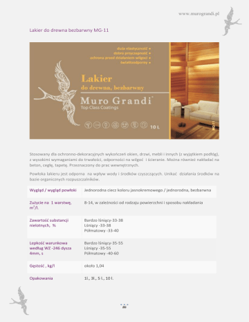 www.murograndi.pl Lakier do drewna bezbarwny MG-11 Stosowany dla ochronno-dekoracyjnych wykończeń okien, drzwi, mebli i innych (z wyjątkiem podłóg), z wysokimi wymaganiami do trwałości, odporności na wilgoć i ścieranie. Można również nakładać na beton, cegłę, tapetę. Przeznaczony do prac wewnętrznych. Powłoka lakieru jest odporna na wpływ wody i środków czyszczących. Unikać działania środków na bazie organicznych rozpuszczalników. Wygląd / wygląd powłoki Jednorodna ciecz koloru jasnokremowego / jednorodna, bezbarwna Zużycie na 1 warstwę, m2/l. 8-14, w zależności od rodzaju powierzchni i sposobu nakładania Zawartość substancji nielotnych, % Bardzo lśniący-33-38 Lśniący -33-38 Półmatowy -33-40 Lepkość warunkowa według WZ -246 dysza 4mm, s Bardzo lśniący-35-55 Lśniący -35-55 Półmatowy -40-60 Gęstość , kg/l około 1,04 Opakowania 1l., 3l., 5 l., 10 l. 86 www.murograndi.pl OPIS PRODUKTU Właściwości Gwarancja jakości wysoka twardość elastyczny wodoodporny może być barwiony pastami pigmentowymi zachowuje kolor i odcień drewna nie żółknie łatwy w polerowaniu Zaleca się przechowywać w oryginalnym, hermetycznie zamkniętym pojemniku przy temperaturze od + 5˚C do +30˚C, w miejscu niedostępnym dla dzieci. Chronić przed bezpośrednim działaniem promieni słonecznych oraz urządzeń grzejnych. Gwarantowany czas przechowywania: 18 miesięcy od daty wyprodukowania. INSTRUKCJA ZASTOSOWANIA Ogólne zalecenia Nakładanie warstwy lakieru przeprowadzać na suchej i czystej powierzchni nie zaatakowanej przez grzyby i pleśnie. Wilgotność drewna nie powinna przekraczać 10%. Prace przeprowadzać w temperaturach 10-30oC i wilgotności względnej 5070%. Nie zaleca się lakierowania powierzchni przy nadmiernym kurzeniu i przeciągu. Przed zastosowaniem lakier wymieszać i odstawić na 15 min. Lakier jest gotowy do pracy, dopuszcza się rozcieńczenie wodą do 5%. Przygotowanie powierzchni Powierzchnia przygotowana do nakładania materiału powinna być sucha, trwała, i oczyszczona z brudu. Zaleca się przepolerowanie powierzchni papierem ściernym o uziarnieniu 240 W przypadku zaatakowania powierzchni przez grzyby, pleśń lub wodorosty, należy je usunąć tak jak zabrudzenia, a następnie obrobić antyseptycznym gruntem BIOimpregnat MG-011 zgodnie z instrukcją. Dla osiągnięcia lepszej wytrzymałości i zapewnienia równomiernego wchłaniania wody powierzchnie przed malowaniem zagruntować gruntem MG-02 dla podłoży drewnianych. Nanoszenie materiału Nakładać 87 za pomocą pędzla, szczotki lub www.murograndi.pl pistoletem na przygotowaną powierzchnię od 2 do 3 warstw. Zaleca się polerować nie wcześniej niż po 3 godzinach. Czas schnięcia jednej warstwy przy temperaturze +(20±2)˚C i wilgotności względnej (50-70) %. W celu osiągnięcia końcowych właściwości lakieru (3-4 tygodnie) nie jest zalecane intensywne czyszczenie za pomocą środków czyszczących. W razie potrzeby dopuszcza się oczyszczenie na pomocą wilgotnej szmatki. Zastosowanie Końcową wytrzymałość i trwałość przed zabrudzeniami i obciążeniami mechanicznymi osiąga się nie wcześniej niż po 14 dniach. Czyszczenie instrumentów Instrumenty należy umyć wodą od razu po zakończeniu pracy. Przy krótkotrwałych przerwach w pracy instrument należy chronić przed wyschnięciem, owijając folią. Wyschnięty materiał na instrumencie usuwa się mechaniczne. BHP Materiał należy do substancji niepalnych, nie zagrażających pożarem oraz wybuchem oraz jest zgodny z rozporządzeniem komisji UE 2004/42/WE o zawartości LZO. Nakładać należy ostrożnie, stosując środki ochronne (okulary, rękawice oraz maskę) oraz zapobiegając kontaktu tynku z otwartymi częściami ciała. W przypadku kontaktu materiału ze skórą lub oczami, należy dokładnie przepłukać to miejsce dużą ilością wody. W przypadku połknięcia należy natychmiast wywołać wymioty, zwrócić się do lekarza pokazując opakowanie lub etykietę. Ochrona środowiska Materiał oraz wypłukaną wodę nie należy wylewać do kanalizacji, oraz wód gruntowych i gleby. Pozostałości zneutralizować i zniszczyć. Pusty pojemnik i wyschnięte pozostałości można utylizować jako odpady budowlane. 88