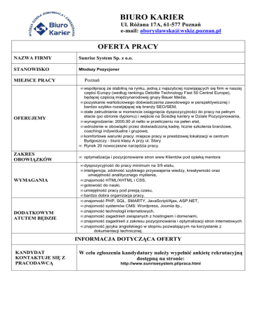 BIURO KARIER Ul. RóŜana 17A, 61-577 Poznań e-mail: [email protected] OFERTA PRACY NAZWA FIRMY Sunrise System Sp. z o.o. STANOWISKO Młodszy Pozycjoner Poznań MIEJSCE PRACY • współpracę ze stabilną na rynku, jedną z najszybciej rozwijających się firm w naszej • • OFERUJEMY • • • • ZAKRES OBOWIĄZKÓW części Europy (według rankingu Deloitte Technology Fast 50 Central Europe), będącej częścią międzynarodowej grupy Bauer Media, pozyskanie wartościowego doświadczenia zawodowego w perspektywicznej i bardzo szybko rozwijającej się branŜy SEO/SEM, stałe zatrudnienie w momencie osiągnięcia dyspozycyjności do pracy na pełnym etacie (po obronie dyplomu) i wejście na ŚcieŜkę kariery w Dziale Pozycjonowania, wynagrodzenie: 2000,00 zł netto w przeliczeniu na pełen etat, wdroŜenie w obowiązki przez doświadczoną kadrę, liczne szkolenia branŜowe, coachingi indywidualne i grupowe, komfortowe warunki pracy: miejsce pracy w prestiŜowej lokalizacji w centrum Bydgoszczy - biura klasy A przy ul. Stary Rynek 20 nowoczesne narzędzia pracy. • optymalizacja i pozycjonowanie stron www Klientów pod opieką mentora • dyspozycyjność do pracy minimum na 3/5 etatu, • inteligencja, zdolność szybkiego przyswajania wiedzy, kreatywność oraz WYMAGANIA DODATKOWYM ATUTEM BĘDZIE • • • • • • • • • • umiejętność analitycznego myślenia, znajomość HTML/XHTML i CSS, gotowość do nauki, umiejętność pracy pod presją czasu, bardzo dobra organizacja pracy. znajomość PHP, SQL, SMARTY, JavaScript/Ajax, ASP.NET, znajomość systemów CMS: Wordpress, Joomla itp., znajomość technologii internetowych, znajomość zagadnień związanych z hostingiem i domenami, znajomość zagadnień z zakresu pozycjonowania i optymalizacji stron internetowych znajomość języka angielskiego w stopniu pozwalającym na korzystanie z dokumentacji technicznej. INFORMACJA DOTYCZĄCA OFERTY KANDYDAT KONTAKTUJE SIĘ Z PRACODAWCĄ W celu zgłoszenia kandydatury naleŜy wypełnić ankietę rekrutacyjną dostępną na stronie: http://www.sunrisesystem.pl/praca.html