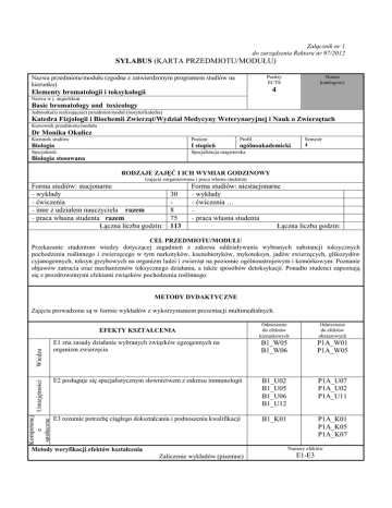 Załącznik nr 1 do zarządzenia Rektora nr 97/2012 SYLABUS (KARTA PRZEDMIOTU/MODUŁU) Nazwa przedmiotu/modułu (zgodna z zatwierdzonym programem studiów na kierunku) Punkty ECTS Numer katalogowy 4 Elementy bromatologii i toksykologii Nazwa w j. angielskim Basic bromatology and toxicology Jednostka(i) realizująca(e) przedmiot/moduł (instytut/katedra) Katedra Fizjologii i Biochemii Zwierząt/Wydział Medycyny Weterynaryjnej i Nauk o Zwierzętach Kierownik przedmiotu/modułu Dr Monika Okulicz Kierunek studiów Poziom Profil Biologia I stopień ogólnoakademicki Specjalność Specjalizacja magisterska Semestr 4 Biologia stosowana RODZAJE ZAJĘĆ I ICH WYMIAR GODZINOWY (zajęcia zorganizowane i praca własna studenta) Forma studiów: stacjonarne wykłady ćwiczenia inne z udziałem nauczyciela razem praca własna studenta razem Łączna liczba godzin: 30 8 75 113 Forma studiów: niestacjonarne wykłady ćwiczenia … praca własna studenta Łączna liczba godzin: CEL PRZEDMIOTU/MODUŁU Przekazanie studentom wiedzy dotyczącej zagadnień z zakresu oddziaływania wybranych substancji toksycznych pochodzenia roślinnego i zwierzęcego w tym narkotyków, ksenobiotyków, mykotoksyn, jadów zwierzęcych, glikozydów cyjanogennych, toksyn grzybowych na organizm ludzi i zwierząt na poziomie ogólnoustrojowym i komórkowym. Poznanie objawów zatrucia oraz mechanizmów toksycznego działania, a także sposobów detoksykacji. Ponadto studenci zapoznają się z prozdrowotnymi efektami związków pochodzenia roślinnego. METODY DYDAKTYCZNE Kompetencj e Umiejętności społeczne Wiedza Zajęcia prowadzone są w formie wykładów z wykorzystaniem prezentacji multimedialnych. EFEKTY KSZTAŁCENIA Odniesienie do efektów kierunkowych Odniesienie do efektów obszarowych E1 zna zasady działania wybranych związków egzogennych na organizm zwierzęcia B1_W05 B1_W06 P1A_W01 P1A_W05 E2 posługuje się specjalistycznym słownictwem z zakresu immunologii B1_U02 B1_U05 B1_U06 B1_U12 P1A_U07 P1A_U02 P1A_U11 E3 rozumie potrzebę ciągłego dokształcania i podnoszenia kwalifikacji B1_K01 P1A_K01 P1A_K05 P1A_K07 Numery efektów Metody weryfikacji efektów kształcenia Zaliczenie wykładów (pisemne) E1-E3 TREŚCI KSZTAŁCENIA Wykłady Definicja bromatologii i toksykologii. Właściwości substancji toksycznych (budowa, występowanie, zawartość w diecie, biodostępność) i poziomy ich działania. Rodzaje dawek toksycznych. Czynniki biologiczne modelujące przebieg zatrucia. Przemiany trucizn w organizmie. Toksyczność narkotyków, dioksan, pestycydów, metali, mykotoksyn, toksyn grzybowych, glikozydów cyjanogennych. Substancje mogące działać szkodliwie po celowym dodaniu do żywności. Charakterystyka toksyn zwierzęcych. Efekty prozdrowotne aktywnych biologicznie substancji roślinnych (glukozynolanów, fitoestrogenów, kwasu fitynowego, flawanonów, stilbenów). Formy i kryteria zaliczenia przedmiotu/modułu Obecność studentów na wykładach jest obowiązkowa. Zaliczenie przedmiotu - test końcowy z całości materiału Procentowy udział w końcowej ocenie 100% WYKAZ LITERATURY Literatura podstawowa: 1. Piotrowski Jerzy K.: „Podstawy toksykologii. Kompendium dla studentów szkół wyższych” Wydawnictwo Naukowo-Techniczne WNT; Rok wydana 2008, W-wa, wyd. 2 2. Seńczuk Witold: „Toksykologia współczesna” Wydanie Lekarskie PZWL; Rok wydania 2006, wydanie 1 Literatura uzupełniająca: 1. Kleine-Gunk Bernd: „Fitoestrogeny” Wydawnictwo Lekarskie PZWL, Rok wydania 2010 2. Lamer-Zarawska Eliza, Kowal-Gierczak Barbara, Niedworak Jan: „Fitoterapia i leki roślinne” Wydawnictwo Lekarskie PZWL; Rok wydania 2012, W-wa 3. Timbrell John, „Paradoks trucizn” Wydawnictwo Naukowo-Techniczne WNT; Rok wydania 2008