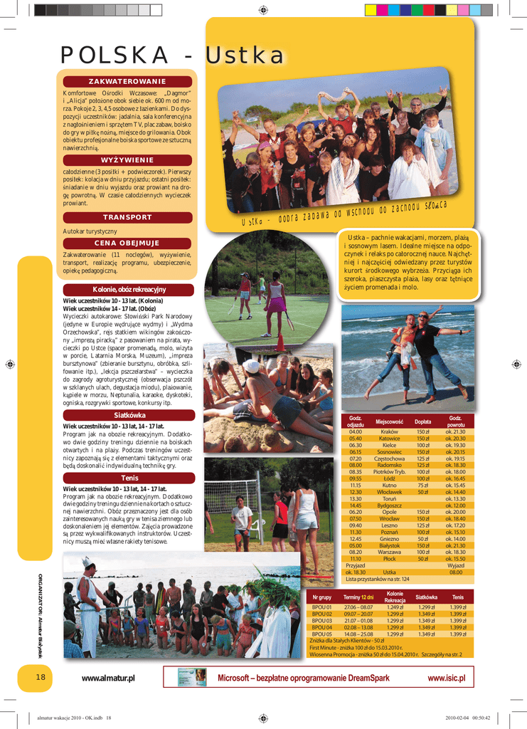 POLSKA - Ustka Z A K WAT E R O WA N I E Komfortowe Ośrodki Wczasowe: „Dagmor” i „Alicja” położone obok siebie ok. 600 m od morza. Pokoje 2, 3, 4,5 osobowe z łazienkami. Do dyspozycji uczestników: jadalnia, sala konferencyjna z nagłośnieniem i sprzętem TV, plac zabaw, boisko do gry w piłkę nożną, miejsce do grilowania. Obok obiektu profesjonalne boiska sportowe ze sztuczną nawierzchnią. WYŻYWIENIE całodzienne (3 posiłki + podwieczorek). Pierwszy posiłek: kolacja w dniu przyjazdu; ostatni posiłek: śniadanie w dniu wyjazdu oraz prowiant na drogę powrotną. W czasie całodziennych wycieczek prowiant. TRANSPORT Autokar turystyczny zachodu słońca o d u d o h c s w d o abawa Ustka – dobra z Ustka – pachnie wakacjami, morzem, plażą i sosnowym lasem. Idealne miejsce na odpoczynek i relaks po całorocznej nauce. Najchętniej i najczęściej odwiedzany przez turystów kurort środkowego wybrzeża. Przyciąga ich szeroka, piaszczysta plaża, lasy oraz tętniące życiem promenada i molo. CENA OBEJMUJE Zakwaterowanie (11 noclegów), wyżywienie, transport, realizację programu, ubezpieczenie, opiekę pedagogiczną. Kolonie, obóz rekreacyjny Wiek uczestników 10 - 13 lat. (Kolonia) Wiek uczestników 14 - 17 lat. (Obóz) Wycieczki autokarowe: Słowiński Park Narodowy (jedyne w Europie wędrujące wydmy) i „Wydma Orzechowska”, rejs statkiem wikingów zakończony „imprezą piracką” z pasowaniem na pirata, wycieczki po Ustce (spacer promenadą, molo, wizyta w porcie, Latarnia Morska, Muzeum), „impreza bursztynowa” (zbieranie bursztynu, obróbka, szlifowanie itp.), „lekcja pszczelarstwa” – wycieczka do zagrody agroturystycznej (obserwacja pszczół w szklanych ulach, degustacja miodu), plażowanie, kąpiele w morzu, Neptunalia, karaoke, dyskoteki, ogniska, rozgrywki sportowe, konkursy itp. Siatkówka Godz. Miejscowość Dopłata odjazdu 04.00 Kraków 150 zł 150 zł 05.40 Katowice 06.30 Kielce 100 zł 06.15 Sosnowiec 150 zł 07.20 Częstochowa 125 zł 08.00 Radomsko 125 zł 08.35 Piotrków Tryb. 100 zł 09.55 Łódź 100 zł 11.15 Kutno 75 zł 12.30 Włocławek 50 zł 13.30 Toruń 14.45 Bydgoszcz 06.20 Opole 150 zł 07.50 Wrocław 150 zł 09.40 Leszno 125 zł 11.30 Poznań 100 zł 12.45 Gniezno 50 zł 05.00 Białystok 150 zł 08.20 Warszawa 100 zł 11.10 Płock 50 zł Przyjazd ok. 18.30 Ustka Lista przystanków na str. 124 Wiek uczestników 10 - 13 lat, 14 - 17 lat. Program jak na obozie rekreacyjnym. Dodatkowo dwie godziny treningu dziennie na boiskach otwartych i na plaży. Podczas treningów uczestnicy zapoznają się z elementami taktycznymi oraz będą doskonalić indywidualną technikę gry. Tenis Wiek uczestników 10 - 13 lat, 14 - 17 lat. Program jak na obozie rekreacyjnym. Dodatkowo dwie godziny treningu dziennie na kortach o sztucznej nawierzchni. Obóz przeznaczony jest dla osób zainteresowanych nauką gry w tenisa ziemnego lub doskonaleniem jej elementów. Zajęcia prowadzone są przez wykwalifikowanych instruktorów. Uczestnicy muszą mieć własne rakiety tenisowe. ORGANIZATOR: Almatur Białystok 18 Nr grupy Terminy 12 dni Kolonie Rekreacja 1.249 zł 1.299 zł 1.299 zł 1.299 zł 1.299 zł Siatkówka Godz. powrotu ok. 21.30 ok. 20.30 ok. 19.30 ok. 20.15 ok. 19.15 ok. 18.30 ok. 18.00 ok. 16.45 ok. 15.45 ok. 14.40 ok. 13.30 ok. 12.00 ok. 20.00 ok. 18.40 ok. 17.20 ok. 15.10 ok. 14.00 ok. 21.30 ok. 18.30 ok. 15.50 Wyjazd 08.00 Tenis BPOU 01 27.06 – 08.07 1.299 zł 1.399 zł BPOU 02 09.07 – 20.07 1.349 zł 1.399 zł BPOU 03 21.07 – 01.08 1.349 zł 1.399 zł BPOU 04 02.08 – 13.08 1.349 zł 1.399 zł BPOU 05 14.08 – 25.08 1.349 zł 1.399 zł Zniżka dla Stałych Klientów - 50 zł First Minute - zniżka 100 zł do 15.03.2010 r. Wiosenna Promocja - zniżka 50 zł do 15.04.2010 r. Szczegóły na str. 2 www.almatur.pl almatur wakacje 2010 - OK.indb 18 Microsoft – bezpłatne oprogramowanie DreamSpark www.isic.pl 2010-02-04 00:50:42