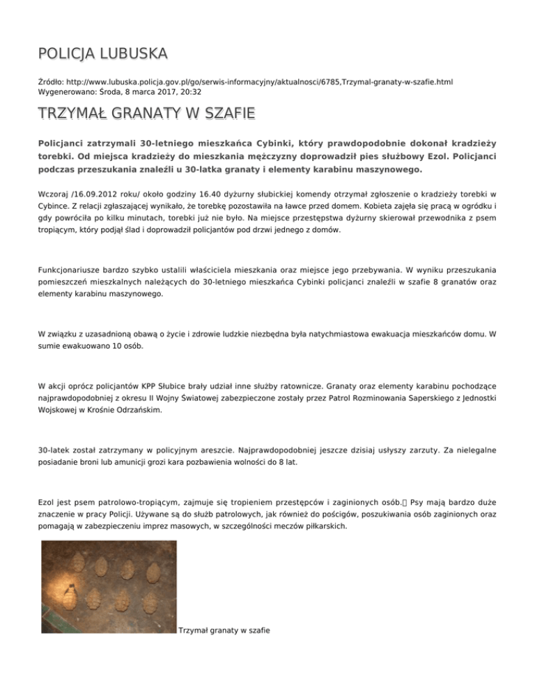 POLICJA LUBUSKA TRZYMAŁ GRANATY W SZAFIE