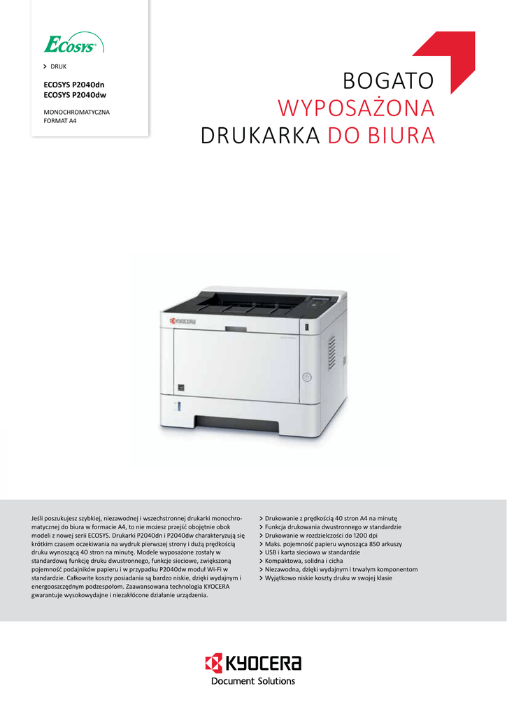 DRUK ECOSYS P2040dn ECOSYS P2040dw MONOCHROMATYCZNA FORMAT A4 Bogato Wyposażona drukarka do biura Jeśli poszukujesz szybkiej, niezawodnej i wszechstronnej drukarki monochromatycznej do biura w formacie A4, to nie możesz przejść obojętnie obok modeli z nowej serii ECOSYS. Drukarki P2040dn i P2040dw charakteryzują się krótkim czasem oczekiwania na wydruk pierwszej strony i dużą prędkością druku wynoszącą 40 stron na minutę. Modele wyposażone zostały w standardową funkcję druku dwustronnego, funkcje sieciowe, zwiększoną pojemność podajników papieru i w przypadku P2040dw moduł Wi-Fi w standardzie. Całkowite koszty posiadania są bardzo niskie, dzięki wydajnym i energooszczędnym podzespołom. Zaawansowana technologia KYOCERA gwarantuje wysokowydajne i niezakłócone działanie urządzenia. Drukowanie z prędkością 40 stron A4 na minutę Funkcja drukowania dwustronnego w standardzie Drukowanie w rozdzielczości do 1200 dpi Maks. pojemność papieru wynosząca 850 arkuszy USB i karta sieciowa w standardzie Kompaktowa, solidna i cicha Niezawodna, dzięki wydajnym i trwałym komponentom Wyjątkowo niskie koszty druku w swojej klasie ECOSYS oznacza ECOlogię, ECOnomię oraz rozwiązania SYStemowe. Dzięki trwałym komponentom, urządzenia ECOSYS odznaczają się zwiększoną wydajnością i niskimi kosztami posiadania w zakresie utrzymania, administracji oraz eksploatacji. Dzięki rozdzielności tonera i bębna, jedynie toner jest uzupełniany regularnie. Modularna budowa umożliwia elastyczne dopasowanie urządzenia do własnych potrzeb. Zintegrowane oprogramowanie systemowe umożliwia dostosowanie urządzenia do posiadanej przez użytkownika sieci informatycznej. doskonałą administrację w sieci z wykorzystywaniem standardowego protokołu SNMP. Możliwości druku ekologicznego Pliki PDF, XPS, TIFF oraz JPEG mogą być drukowane bezpośrednio z pamięci USB Flash (np. USB Pendrive) poprzez interfejs USB host. Dokumenty są wybierane z panelu operacyjnego drukarki. Do przeprowadzenia operacji nie jest wymagany komputer. Funkcja dupleksu (drukowanie dwustronne), tryb druku N-Up (N stron na 1 arkuszu), tryb oszczędzania tonera (drukowanie w trybie próbnym), tryb cichy pracy (zredukowana prędkość druku). KYOCERA NetViewer NetViewer umożliwia monitorowanie i kontrolowanie drukarek ECOSYS i urządzeń wielofunkcyjnych KYOCERA z dowolnego komputera pod kontrolą systemu Windows, zapewniając Command Center RX Command Center RX pozwala zarządzać ustawieniami drukarki za pomocą przeglądarki internetowej. INTERFEJS USB DLA PAMIĘCI PRZENOŚNEJ USB FLASH PROFILE DOPASOWANE DO APLIKACJI Sterownik KX umożliwia stworzenie bezpośredniego połączenia na poziomie aplikacja - profil drukowania (predefiniowane lub użytkownika). Możliwe jest ustalenie ustawień drukowania, takich jak wymuszony dupleks dla danego użytkownika lub aplikacji, co umożliwia redukcję zużycia papieru. DANE OGÓLNE OBSŁUGA PAPIERU OPCJE Technologia: KYOCERA ECOSYS Laser Wszystkie podane pojemności dotyczą papieru o Wyświetlacz: 2-liniowy wyświetlacz LCD z podświetlaniem grubości maks. 0,11 mm. Prędkość drukowania: Do 40 stron A4 na minutę Pojemność wejściowa: 100-kartkowy podajnik wielofunkcyjny; 60 – 220 g/m2; A4, A5, A6, B5, B6, Letter, Legal, inne w zakresie 70 x 148 mm – 216 x 356 mm; kaseta uniwersalna na 250 arkuszy; 60 – 163 g/m2; A4, A5, A6, B5, Letter, Legal, inne w zakresie 105 x 148 – 216 x 356 mm. Maksymalna pojemność wejściowa z opcjami: 850 arkuszy PF-1100 Podajnik papieru (maks. 2): 250 arkuszy; 60 – 163 g/m2; A4, A5, A6, B5, Letter, Legal, inne w zakresie 105 x 148 mm – 216 x 356 mm Rozdzielczość: 300 dpi, 600 dpi, 1200 dpi Wydajność: Maks. 50 000 stron na miesiąc Czas nagrzewania: Ok. 15 sekund lub mniej Czas wydruku pierwszej strony: Ok. 6,4 sekundy lub mniej Procesor: 800 MHz Pamięć: Standard 256 MB, maks. 256 MB Moduł dupleksu: Drukowanie dwustronne: 60 – 163 g/ m²; A4, A5, B5, Letter, Legal Interfejsy: ECOSYS P2040dn: USB 2.0 (Hi-Speed), USB Host Interface, Gigabit Ethernet (10BaseT/100BaseTX/1000BaseT), gniazdo dodatkowej karty SD/SDHC Pojemność wyjściowa: Maks. 250 arkuszy wydrukiem do dołu ECOSYS P2040dw: USB 2.0 (Hi-Speed), USB Host Interface, Gigabit Ethernet (10BaseT/100BaseTX/1000BaseT), Wireless LAN, gniazdo dodatkowej karty SD/SDHC Emulacje: PCL 6 (PCL 5e/PCL-XL), PostScript 3 (KPDL 3), PDF Direct Print, XPS/OpenXPS Wymiary (szer x gł x wys): 375 x 393 x 272 mm Waga: Ok. 14 kg Napięcie zasilania: AC 220 ~ 240 V, 50/60 Hz Pobór mocy: Drukowanie: 620 W Tryb gotowości: 8 W Tryb uśpienia: 0,8 W Poziom hałasu (ISO 7779 / ISO 9296): Drukowanie: 48,8 dB(A) LpA Certyfikaty: GS, TÜV, CE - drukarka produkowana zgodnie z normą jakości ISO 9001 oraz normą ochrony środowiska ISO 14001 UG-33: Obsługa ThinPrint Czytnik kart IC + Card Authentication Kit (B): Obsługa różnych narzędzi autentykacji CB-1100: Drewniana szafka GWARANCJA 2-lenia gwarancja w standardzie. KYOCERA udziela gwarancji na bęben na 3 lata lub 100 000 stron (w zależności od tego, co nastąpi wcześniej), pod warunkiem, że urządzenie jest użytkowane i serwisowane zgodnie z instrukcją serwisową. DRUKOWANIE Język kontrolera: PRESCRIBE IIe ożliwość rozszerzenia gwarancji na M urządzenia i opcje do 5 lat. Obsługiwane systemy operacyjne: Wszystkie aktualne wersje Windows, MAC OS X wersja 10,5 lub wyższa, Unix, Linux oraz inne według potrzeb Czcionki: 93 czcionki PCL6/KPDL3, 8 czcionek dla Windows Vista, 1 czcionka bitmapowa, 45 kodów kreskowych (np. EAN8, EAN13) z automatycznym generowaniem sum kontrolnych, obsługa dwuwymiarowych kodów PDF-417 pod PRESCRIBE (PCL i inne dostępne jako opcje) EKSPLOATACJA Średnie zużycie zgodnie z ISO/IEC 19752 TK-1160: Toner o wydajności 7200 stron A4 Toner startowy: Toner o wydajności 3600 stron A4 KYOCERA Document Solutions Europe B.V. – Branch Office Germany Otto-Hahn-Straße 12 – 40670 Meerbu